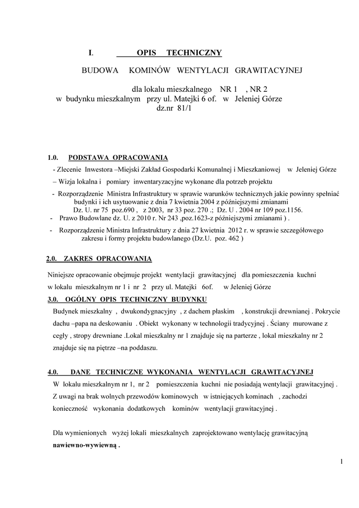 I. BUDOWA OPIS TECHNICZNY KOMINÓW WENTYLACJI GRAWITACYJNEJ dla lokalu mieszkalnego NR 1 , NR 2 w budynku mieszkalnym przy ul. Matejki 6 of. w Jeleniej Górze dz.nr 81/1 1.0. PODSTAWA OPRACOWANIA - Zlecenie Inwestora –Miejski Zakład Gospodarki Komunalnej i Mieszkaniowej w Jeleniej Górze – Wizja lokalna i pomiary inwentaryzacyjne wykonane dla potrzeb projektu - Rozporządzenie Ministra Infrastruktury w sprawie warunków technicznych jakie powinny spełniać budynki i ich usytuowanie z dnia 7 kwietnia 2004 z późniejszymi zmianami Dz. U. nr 75 poz.690 , z 2003, nr 33 poz. 270 .; Dz. U . 2004 nr 109 poz.1156. - Prawo Budowlane dz. U. z 2010 r. Nr 243 ,poz.1623-z późniejszymi zmianami ) . - Rozporządzenie Ministra Infrastruktury z dnia 27 kwietnia 2012 r. w sprawie szczegółowego zakresu i formy projektu budowlanego (Dz.U. poz. 462 ) 2.0. ZAKRES OPRACOWANIA Niniejsze opracowanie obejmuje projekt wentylacji grawitacyjnej dla pomieszczenia kuchni w lokalu mieszkalnym nr 1 i nr 2 przy ul. Matejki 6of. w Jeleniej Górze 3.0. OGÓLNY OPIS TECHNICZNY BUDYNKU Budynek mieszkalny , dwukondygnacyjny , z dachem płaskim , konstrukcji drewnianej . Pokrycie dachu –papa na deskowaniu . Obiekt wykonany w technologii tradycyjnej . Ściany murowane z cegły , stropy drewniane .Lokal mieszkalny nr 1 znajduje się na parterze , lokal mieszkalny nr 2 znajduje się na piętrze –na poddaszu. 4.0. DANE TECHNICZNE WYKONANIA WENTYLACJI GRAWITACYJNEJ W lokalu mieszkalnym nr 1, nr 2 pomieszczenia kuchni nie posiadają wentylacji grawitacyjnej . Z uwagi na brak wolnych przewodów kominowych w istniejących kominach , zachodzi konieczność wykonania dodatkowych kominów wentylacji grawitacyjnej . Dla wymienionych wyżej lokali mieszkalnych zaprojektowano wentylację grawitacyjną nawiewno-wywiewną . 1 4.1. WENTYLACJA • WYWIEWNA W lokalu mieszkalnym Nr1 , Nr 2 dla pomieszczenia kuchni , zaprojektowano zewnętrzny kominy wentylacji grawitacyjnej z rur stalowych dwupłaszczowych ,ze stali kwasoodpornej , z wyprowadzeniem ponad połać dachu . Z uwagi na zapewnienie wydajności wentylacji i określonego przepływu powietrza , projektowana średnica kominów wynosi ø 200/275 mm , z warstwą izolacji termicznej 50 mm. A w otworze wentylacyjnym w ścianie należy zastosować kratkę wentylacyjną o wym. 140 x 270 mm . Kominy można wykonać w jednym z systemów np. „Komin-Flex” ,” Jawar” , „Spiroflex” , „Wadex” itp. • Projektowany komin wentylacji grawitacyjnej należy mocować do ścian przy zastosowaniu stalowych obejm montażowych wzmocnionych , wykonanych z płaskownika 5x50 mm( stal ST3SX) , kotwionych do ściany. Obejmy wykonane ze stali szlachetnej , mocowane do ściany zewnętrznej na dwie śruby rozporowe 2φ 10 mm –po obydwu stronach rury . W dolnej części komin podparty płytą kotwową , opartą na stalowym wsporniku z blachy szlachetnej (kształtowniki systemowe ) .Wsporniki przymocowane do ściany zewnętrznej kołkami -8φ10 mm. Przejście przewodu wentylacji przez mur wykonać w tulei stalowej umieszczonej w murze. Wolne przestrzenie pomiędzy tuleją , a murem należy uzupełnić mocną zaprawą cementową marki min. „8 „. Odległość między górną krawędzią otworu wentylacyjnego w ścianie ,a sufitem powinna wynosić max. 15 cm . Komin prowadzony po ścianie zewnętrznej wyprowadzić ponad dach na wysokość min. 2,00 m od połaci dachu . Na wylocie komina należy zamontować obrotową nasadę kominową , która wspomaga wentylację i zapewni odpowiedni ciąg kominowy . Przejście komina przez połać dachu : W miejscu przejścia przewodu kominowego przez połać dachu należy zastosować przewody z blachy ocynkowanej z luźnymi kołnierzami ,dla uszczelnienia przy połaci dachowej i wykonać obróbki blacharskie .Ze względu na to , że przejścia przez dach narażone są na przecieki , uszczelnienie należy wykonać ze szczególną starannością Otwór w ścianie na przejścia przewodu kominowego należy wykonywać delikatnie , przy użyciu wierteł , nie używając sprzętu udarowego, by nie narazić ściany na drgania . 2 4.2. WENTYLACJA NAWIEWNA Zgodnie z Polską Normą PN-83/B-03430 „Wentylacja w budynkach mieszkalnych zamieszkania zbiorowego i użyteczności publicznej” - w celu zapewnienia sprawnej wentylacji nawiewnowywiewnej należy zapewnić dopływ powietrza z zewnątrz - tzw. nawiew . Nawiew zapewnić poprzez dodatkowe zamontowanie w ścianach zewnętrznych specjalnego nawiewnika nad oknem o regulowanym stopniu otwarcia ( ręcznym lub automatycznym ), który umożliwi stały napływ powietrza do pomieszczeń (-w miejscach wskazanych na rysunku ) Nawiewnik można zamontować w ramach istniejącego okna lub w ścianie nad oknem . Dodatkowo należy w drzwiach do kuchni i przylegającego pomieszczenia (w miejscu wskazanym na rys.) wykonać podcięcie od dołu , na całej szerokości na wysokość min1,0 cm , tak aby szczelina pomiędzy zamkniętymi drzwiami ,a podłogą wynosiła min. 80cm2 . 5.0. UWAGI KOŃCOWE -Przy wykonywaniu robót budowlanych należy stosować wyroby dopuszczalne do obrotu i stosowania w budownictwie zgodnie z prawem budowlanym , ustawa o wyrobach budowlanych –Dz. U. nr 92 z dnia 16.04.2004r.poz. 881 oraz zgodnie z Polskimi Normami -Montaż instalacji , próby , odbiór wykonać zgodnie Z warunkami technicznymi wykonania i odbioru robót instalacyjnych zgodnie z rozporządzeniem Ministra Infrastruktury w sprawie warunków technicznych jakie powinny spełniać budynki i ich usytuowanie z dnia 7 kwietnia 2004 z późniejszymi zmianami Dz. U. nr 75 poz.690 , z 2003, nr 33 poz. 270 .; Dz. U . 2004 nr 109 poz.1156. 6.0. OCHRONA KONSERWATORSKA Rozpatrywany obiekt znajduje się w strefie ochrony konserwatorskiej i podlega ochronie na podstawie przepisów ustawy o ochronie zabytków i opiece nad zabytkami ( Dz. U.2003, nr 162 poz.1568 ze zmianami ) 7.0. ODDZIAŁYWANIE NA ŚRODOWISKO. Projektowana budowa kominów wentylacji grawi