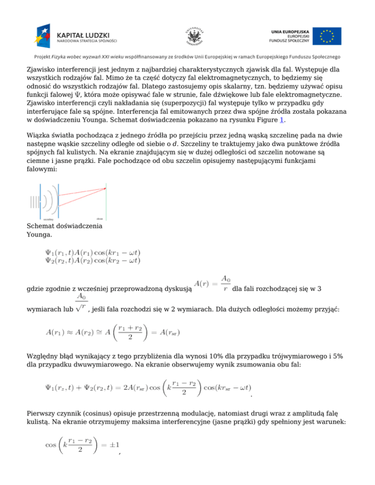 Zjawisko interferencji jest jednym z najbardziej charakterystycznych zjawisk dla fal. Występuje dla wszystkich rodzajów fal. Mimo że ta część dotyczy fal elektromagnetycznych, to będziemy się odnosić do wszystkich rodzajów fal. Dlatego zastosujemy opis skalarny, tzn. będziemy używać opisu funkcji falowej , która może opisywać fale w strunie, fale dźwiękowe lub fale elektromagnetyczne. Zjawisko interferencji czyli nakładania się (superpozycji) fal występuje tylko w przypadku gdy interferujące fale są spójne. Interferencja fal emitowanych przez dwa spójne źródła została pokazana w doświadczeniu Younga. Schemat doświadczenia pokazano na rysunku Figure 1. Wiązka światła pochodząca z jednego źródła po przejściu przez jedną wąską szczelinę pada na dwie następne wąskie szczeliny odległe od siebie o d. Szczeliny te traktujemy jako dwa punktowe źródła spójnych fal kulistych. Na ekranie znajdującym się w dużej odległości od szczelin notowane są ciemne i jasne prążki. Fale pochodzące od obu szczelin opisujemy następującymi funkcjami falowymi: Schemat doświadczenia Younga. gdzie zgodnie z wcześniej przeprowadzoną dyskusją wymiarach lub dla fali rozchodzącej się w 3 , jeśli fala rozchodzi się w 2 wymiarach. Dla dużych odległości możemy przyjąć: Względny błąd wynikający z tego przybliżenia dla wynosi 10% dla przypadku trójwymiarowego i 5% dla przypadku dwuwymiarowego. Na ekranie obserwujemy wynik zsumowania obu fal: . Pierwszy czynnik (cosinus) opisuje przestrzenną modulację, natomiast drugi wraz z amplitudą falę kulistą. Na ekranie otrzymujemy maksima interferencyjne (jasne prążki) gdy spełniony jest warunek: , , czyli gdy różnica dróg optycznych obu promieni jest równa wielokrotności długości fali: (m jest liczbą całkowitą). Wygaszenie fal (ciemne prążki) występują natomiast gdy: . A więc dla różnicy dróg optycznych obu promieni równej nieparzystej wielokrotności połowy długości fali: . Często przy opisie interferencji, gdy ekran znajduje się w bardzo dużej odległości od szczelin (w porównaniu z odległością między szczelinami) stosujemy przybliżenie Fraunhofera. Przybliżenie to polega na tym, że przyjmujemy, że oba promienie są równoległe do siebie, tak jak to pokazano na rysunku Figure 2. W takim przypadku: , a warunek na maksima interferencyjne jest następujący: , a na minima: . Kąt oznacza kąt jaki tworzą promienie do osi układu. Natężenie światła obserwowane na ekranie w przybliżeniu Fraunhofera ma postać (patrz rysunek Figure 3): . Bieg promieni w przybliżeniu Fraunhofera. Natężenia światła w funkcji kąta . Zjawisko interferencji bardzo „ładnie” widać na cienkich warstwach lub błonach, np. na bańkach mydlanych lub na płytkiej kałuży rozlanej benzyny. Interferencja zachodzi między falami, które ulegają wielokrotnemu odbiciu od granicy ośrodków, co ilustruje rysunek Figure 4. Załóżmy, że cienka płytka jest ośrodkiem o współczynniku załamania n, natomiast współczynnik załamania powietrza przyjmijmy 1. Interferencja na cienkich warstwach. Interferencję obserwujemy zarówno w świetle odbitym jak i przechodzącym. Dla wiązki odbitej różnica faz między fala odbitą na pierwszej powierzchni granicznej i falą odbitą na drugiej powierzchni wynosi: . Pierwszy składnik pochodzi z różnicy dróg optycznych, natomiast zmiana fazy o jest związana z odbiciem fali od ośrodka optycznie gęstszego (wzory Fresnela). Dla fali przechodzącej różnica faz wynosi: . Dla “matematycznego” uproszczenia problemu załóżmy, że kąt padania jest bardzo mały ( ), wówczas dla fali odbitej i fali przechodzącej różnica faz wynosi odpowiednio: . W takim przypadku dla fali odbitej zachodzi (m — liczba całkowita): 1. Interferencja konstruktywna gdy: 2. Interferencja destruktywana gdy: . . Dla fali przechodzącej otrzymujemy: 1. Interferencję konstruktywną gdy: 2. Interferencję destruktywną gdy: . . Jeśli będziemy obserwować interferencję na cienkich warstwach w świetle białym to zobaczymy kolorowe prążki, przy czym w świetle przechodzącym będziemy obserwować barwy uzupełniające do barw widzianych w świetle odbitym. Poniżej zebrano obserwowane barwy dla różnych grubości warstw. Grubość warstwy (nm) światło odbite światło przechodzące 0 czarna biała 97 szara żółtawobiała 218 jasnoszara żółtobrunatna 257 żółtawobiała karminowa 281 słomkowożółta ciemnofiołkowa 382 jaskrawożółta niebieska 430 żółtobrunatna szaroniebieska 558 czerwona bladozielona 565 purpurowa jasnozielona 580 indygo złotożółta 664 lazurowa pomarańczowa 747 zielona jasnokarminowa 826 jasnozielona purpurowa 843 żółtawozielona fioletowopurpurowa Ze zjawiskiem interferencji wiąże się bardzo ważny eksperyment, tzw. doświadczenie MichelsonaMorleya. Doświadczenie to miało pokazać istnienie „eteru” — ośrodka w którym poruszają się fale elektromagnetyczne. Wynik eksperymentu okazał się negatywny. Ale jest to jeden z nielicznych przypadków, że negatywny wynik przyczynił się istotnie do rozwoju fizyki. Doświadczenie wykonano za pomocą interferometru noszącego obecnie nazwę interferometru Michelsona. Przyrząd ten stał się jednym z najważniejszych narzędzi badawczych w fizyce doświadczalnej. Schemat interferometru pokazany jest na rysunku Figure 5. Interferometr składa się z płytki światło dzielącej i dwóch zwierciadeł umieszczonych w dwóch ramionach interferometru tworzących kąt prosty. Płytka część światła odbija pod katem 45°, a część przepuszcza wzdłuż kierunku biegu promienia pierwotnego. Oba rozdzielone promienie odbijają się od zwierciadeł i wracają do płytki, która tym razem łączy oba promienie. Detektor rejestruje sygnał pochodzący od obu interferujących fal. Jedno z luster jest ruchome. Ruch zwierciadła wprowadza różnicę faz między dwiema wi