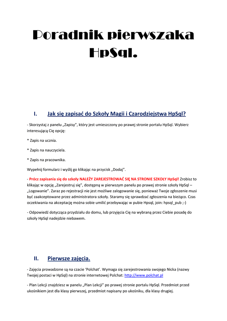 Poradnik pierwszaka HpSql. I. Jak się zapisać do Szkoły Magii i Czarodziejstwa HpSql? - Skorzystaj z panelu „Zapisy”, który jest umieszczony po prawej stronie portalu HpSql. Wybierz interesującą Cię opcję: * Zapis na ucznia. * Zapis na nauczyciela. * Zapis na pracownika. Wypełnij formularz i wyślij go klikając na przycisk „Dodaj”. - Prócz zapisania się do szkoły NALEŻY ZAREJESTROWAĆ SIĘ NA STRONIE SZKOŁY HpSql! Zrobisz to klikając w opcję „Zarejestruj się”, dostępną w pierwszym panelu po prawej stronie szkoły HpSql – „Logowanie”. Zaraz po rejestracji nie jest możliwe zalogowanie się, ponieważ Twoje zgłoszenie musi być zaakceptowane przez administratora szkoły. Staramy się sprawdzać zgłoszenia na bieżąco. Czas oczekiwania na akceptację można sobie umilić przebywając w pubie Hpsql, join: hpsql_pub ;-) - Odpowiedź dotycząca przydziału do domu, lub przyjęcia Cię na wybraną przez Ciebie posadę do szkoły HpSql nadejdzie niebawem. II. Pierwsze zajęcia. - Zajęcia prowadzone są na czacie ‘Polchat’. Wymaga się zarejestrowania swojego Nicka (nazwy Twojej postaci w HpSql) na stronie internetowej Polchat: http://www.polchat.pl - Plan Lekcji znajdziesz w panelu „Plan Lekcji” po prawej stronie portalu HpSql. Przedmiot przed ukośnikiem jest dla klasy pierwszej, przedmiot napisany po ukośniku, dla klasy drugiej. - Wejść na zajęcia możesz na dwa sposoby. *Pierwsze sposób: Korzystając z linków umieszczonych w panelu „Sale Lekcyjne”, po lewej stronie portalu HpSql. By zobaczyć w jakiej Sali ma odbyć się lekcja, na którą chcesz przyjść, kliknij na link „Joiny do sal” w tym samym panelu. Po zorientowaniu się, gdzie powinieneś iść na lekcję, klikasz na link prowadzący do odpowiedniego pomieszczenia, tam zostaniesz poproszony o login i hasło. Podajesz te wymagane dane, które podałeś podczas rejestracji na http://www.polchat.pl * Drugi sposób: Ściągasz z działu „Download” na stronie szkoły HpSql program „NPCC” lub „ICeQ”. Instalujesz go i otwierasz. Podajesz wymagane dane, czyli: Login, hasło oraz join do pomieszczenia. Joiny do sal lekcyjnych znajdziesz w panelu „Sale lekcyjne” klikając w link „Joiny do sal”. Przepisz dokładnie join i wejdź do Sali. Ten sposób jest wygodniejszy. III. Forum – gra klimatyczna. - Istnieje możliwość włączenia się do gry klimatycznej HpSql. Odbywa się ona na forum. Wstąpienie do gry odbywa się poprzez założenie karty swojej postaci, wg podanego wzoru, oraz przez akceptację karty. - W nawiasach <> piszemy czynności, odczucia i myśli naszej postaci, np. <Wyszedł z mieszkania. Poczuł zimny powiew wiatru, natychmiast okrył się szczelniej płaszczem. Przeklęty jesienny poranek – pomyślał>. - W jednym poście gracz MUSI napisać MINIMUM 3 linijki tekstu. - Istnieje Mistrz Gry – osoba zarządzająca zdarzeniami losowymi, na które nie ma wpływu postać, np. pogoda. Pełni funkcję pewnego rodzaju zrządzenia losu. Postać musi się podporządkować sytuacji, w jakiej postawi go Mistrz Gry, np. Mistrz Gry: Nadciągnęły czarne chmury. Po chwili zaczęła się ogromna ulewa. Postać: No nie.. Jeszcze tego brakuje! <burknął do siebie, gdy zaczęło padać i naciągnął na głowę kaptur, przyspieszając kroku> - Na forum staramy się pisać poprawnie gramatycznie i stylistycznie. Dodatkowa informacja: Korzystając z doświadczenia mogę zdradzić, że gdy w żadnej Sali lekcyjnej nie ma ani jednej osoby, zapewne wszyscy przesiadują w Pubie HpSql. Jest to najbardziej oblegane miejsce w całej szkole. Szczególnie wieczorami. Join: hpsql_pub . Zapraszamy;-)