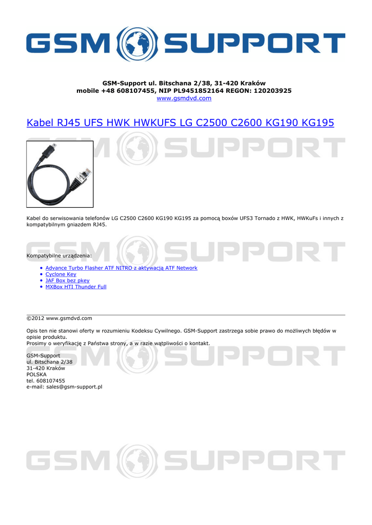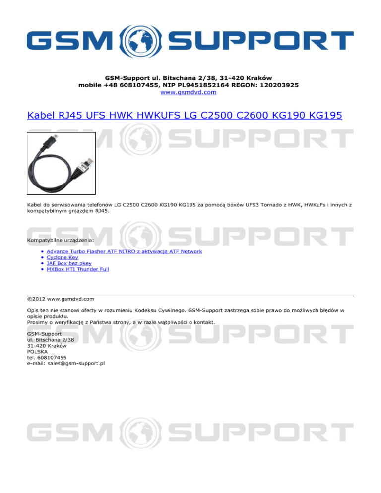 GSM-Support ul. Bitschana 2/38, 31-420 Kraków mobile +48 608107455, NIP PL9451852164 REGON: 120203925 www.gsmdvd.com Kabel RJ45 UFS HWK HWKUFS LG C2500 C2600 KG190 KG195 Kabel do serwisowania telefonów LG C2500 C2600 KG190 KG195 za pomocą boxów UFS3 Tornado z HWK, HWKuFs i innych z kompatybilnym gniazdem RJ45. Kompatybilne urządzenia: Advance Turbo Flasher ATF NITRO z aktywacją ATF Network Cyclone Key JAF Box bez pkey MXBox HTI Thunder Full ©2012 www.gsmdvd.com Opis ten nie stanowi oferty w rozumieniu Kodeksu Cywilnego. GSM-Support zastrzega sobie prawo do możliwych błędów w opisie produktu. Prosimy o weryfikację z Państwa strony, a w razie wątpliwości o kontakt. GSM-Support ul. Bitschana 2/38 31-420 Kraków POLSKA tel. 608107455 e-mail: [email protected] Powered by TCPDF (www.tcpdf.org)