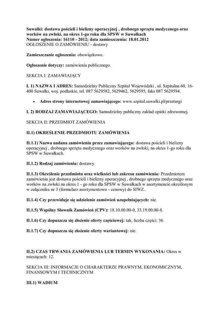Suwałki: dostawa pościeli i bielizny operacyjnej , drobnego sprzętu medycznego oraz worków na zwłoki, na okres 1-go roku dla SPSW w Suwałkach Numer ogłoszenia: 16110 - 2012; data zamieszczenia: 18.01.2012 OGŁOSZENIE O ZAMÓWIENIU - dostawy Zamieszczanie ogłoszenia: obowiązkowe. Ogłoszenie dotyczy: zamówienia publicznego. SEKCJA I: ZAMAWIAJĄCY I. 1) NAZWA I ADRES: Samodzielny Publiczny Szpital Wojewódzki , ul. Szpitalna 60, 16400 Suwałki, woj. podlaskie, tel. 087 5629582, 5629462, 5629595, faks 087 5629594. Adres strony internetowej zamawiającego: www.szpital.suwalki.pl/przetargi I. 2) RODZAJ ZAMAWIAJĄCEGO: Samodzielny publiczny zakład opieki zdrowotnej. SEKCJA II: PRZEDMIOT ZAMÓWIENIA II.1) OKREŚLENIE PRZEDMIOTU ZAMÓWIENIA II.1.1) Nazwa nadana zamówieniu przez zamawiającego: dostawa pościeli i bielizny operacyjnej , drobnego sprzętu medycznego oraz worków na zwłoki, na okres 1-go roku dla SPSW w Suwałkach. II.1.2) Rodzaj zamówienia: dostawy. II.1.3) Określenie przedmiotu oraz wielkości lub zakresu zamówienia: Przedmiotem zamówienia jest dostawa pościeli i bielizny operacyjnej , drobnego sprzętu medycznego oraz worków na zwłoki na okres 1 - go roku dla SPSW w Suwałkach w asortymencie określonym w załączniku nr 3 (formularz asortymentowo - cenowy) do SIWZ.. II.1.4) Czy przewiduje się udzielenie zamówień uzupełniających: nie. II.1.5) Wspólny Słownik Zamówień (CPV): 18.10.00.00-0, 33.19.00.00-8. II.1.6) Czy dopuszcza się złożenie oferty częściowej: tak, liczba części: 36. II.1.7) Czy dopuszcza się złożenie oferty wariantowej: nie. II.2) CZAS TRWANIA ZAMÓWIENIA LUB TERMIN WYKONANIA: Okres w miesiącach: 12. SEKCJA III: INFORMACJE O CHARAKTERZE PRAWNYM, EKONOMICZNYM, FINANSOWYM I TECHNICZNYM III.1) WADIUM Informacja na temat wadium: W przedmiotowym postępowaniu nie wymaga się wniesienia wadium. III.2) ZALICZKI Czy przewiduje się udzielenie zaliczek na poczet wykonania zamówienia: nie III.3) WARUNKI UDZIAŁU W POSTĘPOWANIU ORAZ OPIS SPOSOBU DOKONYWANIA OCENY SPEŁNIANIA TYCH WARUNKÓW III. 3.1) Uprawnienia do wykonywania określonej działalności lub czynności, jeżeli przepisy prawa nakładają obowiązek ich posiadania Opis sposobu dokonywania oceny spełniania tego warunku do potwierdzenia oświadczeniem o spełnieniu warunków udziału w postępowaniu (załacznik nr 4 do SIWZ) III.3.2) Wiedza i doświadczenie o Opis sposobu dokonywania oceny spełniania tego warunku do potwierdzenia oświadczeniem o spełnieniu warunków udziału w postępowaniu (załacznik nr 4 do SIWZ) III.3.3) Potencjał techniczny o Opis sposobu dokonywania oceny spełniania tego warunku do potwierdzenia oświadczeniem o spełnieniu warunków udziału w postępowaniu (załacznik nr 4 do SIWZ) III.3.5) Sytuacja ekonomiczna i finansowa o Opis sposobu dokonywania oceny spełniania tego warunku o do potwierdzenia oświadczeniem o spełnieniu warunków udziału w postępowaniu (załacznik nr 4 do SIWZ) III.4) INFORMACJA O OŚWIADCZENIACH LUB DOKUMENTACH, JAKIE MAJĄ DOSTARCZYĆ WYKONAWCY W CELU POTWIERDZENIA SPEŁNIANIA WARUNKÓW UDZIAŁU W POSTĘPOWANIU ORAZ NIEPODLEGANIA WYKLUCZENIU NA PODSTAWIE ART. 24 UST. 1 USTAWY III.4.1) W zakresie wykazania spełniania przez wykonawcę warunków, o których mowa w art. 22 ust. 1 ustawy, oprócz oświadczenia o spełnieniu warunków udziału w postępowaniu, należy przedłożyć: III.4.2) W zakresie potwierdzenia niepodlegania wykluczeniu na podstawie art. 24 ust. 1 ustawy, należy przedłożyć: oświadczenie o braku podstaw do wykluczenia aktualny odpis z właściwego rejestru, jeżeli odrębne przepisy wymagają wpisu do rejestru, w celu wykazania braku podstaw do wykluczenia w oparciu o art. 24 ust. 1 pkt 2 ustawy, wystawiony nie wcześniej niż 6 miesięcy przed upływem terminu składania wniosków o dopuszczenie do udziału w postępowaniu o udzielenie zamówienia albo składania ofert, a w stosunku do osób fizycznych oświadczenie w zakresie art. 24 ust. 1 pkt 2 ustawy III.4.3) Dokumenty podmiotów zagranicznych Jeżeli wykonawca ma siedzibę lub miejsce zamieszkania poza terytorium Rzeczypospolitej Polskiej, przedkłada: III.4.3.1) dokument wystawiony w kraju, w którym ma siedzibę lub miejsce zamieszkania potwierdzający, że: nie otwarto jego likwidacji ani nie ogłoszono upadłości - wystawiony nie wcześniej niż 6 miesięcy przed upływem terminu składania wniosków o dopuszczenie do udziału w postępowaniu o udzielenie zamówienia albo składania ofert nie zalega z uiszczaniem podatków, opłat, składek na ubezpieczenie społeczne i zdrowotne albo że uzyskał przewidziane prawem zwolnienie, odroczenie lub rozłożenie na raty zaległych płatności lub wstrzymanie w całości wykonania decyzji właściwego organu - wystawiony nie wcześniej niż 3 miesiące przed upływem terminu składania wniosków o dopuszczenie do udziału w postępowaniu o udzielenie zamówienia albo składania ofert nie orzeczono wobec niego zakazu ubiegania się o zamówienie wystawiony nie wcześniej niż 6 miesięcy przed upływem terminu składania wniosków o dopuszczenie do udziału w postępowaniu o udzielenie zamówienia albo składania ofert III.4.3.2) zaświadczenie właściwego organu sądowego lub administracyjnego miejsca zamieszkania albo zamieszkania osoby, której dokumenty dotyczą, w zakresie określonym w art. 24 ust. 1 pkt 4-8 ustawy - wystawione nie wcześniej niż 6 miesięcy przed upływem terminu składania wniosków o dopuszczenie do udziału w postępowaniu o udzielenie zamówienia albo składania ofert - albo oświadczenie złożone przed notariuszem, właściwym organem sądowym, administracyjnym albo organem samorządu zawodowego lub gospodarczego odpowiednio miejsca zamieszkania osoby lub kraju, w którym wykonawca ma siedzibę lub miejsce zamieszkania, jeżeli w miejscu zamieszkania osoby lub w kraju, w którym wykonawca ma siedzibę lub miejsce zamieszkania, nie wydaje się takiego zaświadc