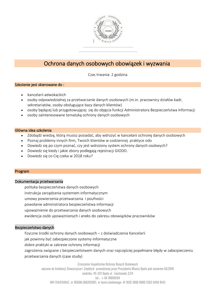 Ochrona danych osobowych obowiązek i wyzwania Czas trwania: 2 godzina Szkolenie jest skierowane do : kancelarii adwokackich osoby odpowiedzialnej za przetwarzanie danych osobowych (m.in. pracownicy działów kadr, sekretariatów, osoby obsługujące bazy danych klientów) osoby będącej lub przygotowującej się do objęcia funkcji Administratora Bezpieczeństwa Informacji osoby zainteresowane tematyką ochrony danych osobowych Główna idea szkolenia Zdobądź wiedzę, którą musisz posiadać, aby wdrożyć w kancelarii ochronę danych osobowych Poznaj problemy innych firm, Twoich klientów w codziennej praktyce odo Dowiedz się po czym poznać, czy jest wdrożony system ochrony danych osobwych? Dowiedz się kiedy i jakie zbiory podlegają rejestracji GIODO. Dowiedz się co Cię czeka w 2018 roku? Program Dokumentacja przetwarzania polityka bezpieczeństwa danych osobowych instrukcja zarządzania systemem informatycznym umowy powierzenia przetwarzania i poufności powołanie administratora bezpieczeństwa informacji upoważnienie do przetwarzania danych osobowych ewidencja osób upoważnionych i aneks do zakresu obowiązków pracowników Bezpieczeństwo danych fizyczne środki ochrony danych osobowych – z doświadczenia Kancelarii jak powinny być zabezpieczone systemy informatyczne dobre praktyki w zakresie ochrony informacji zagrożenia związane z bezpieczeństwem danych oraz najczęściej popełniane błędy w zabezpieczeniu przetwarzania danych (case study) Zrzeszenie Inspektorów Ochrony Danych Osobowych wpisane do Ewidencji Stowarzyszeń Zwykłych prowadzonej przez Prezydenta Miasta Opole pod numerem 6Z/2016 siedziba: 45-325 Opole ul. Światowida 2/24 tel.: +48 789185194 NIP:7543134642, nr REGON:366202007, nr konta bankowego: 41 1020 3668 0000 5302 0456 9143 Rejestracja zbiorów danych osobowych zwolnienia z rejestracji zbiorów proces rejestracji zbiorów najczęstsze błędy rejestracja on-line (platforma e-GIODO) Realizacja obowiązku informacyjnego co to jest „obowiązek informacyjny”? jak należy spełnić „obowiązek informacyjny” ? Przykłady Co nas czeka? RODO (Rozporządzenie Parlamentu Europejskiego i Rady (UE) 2016/679 z dnia 27 kwietnia 2016r. czy będziesz musiał powołać odpowiednika administratora bezpieczeństwa informacji? jakie obowiązki nałoży na nas RODO? jakie kary za incydent? co zrobić aby przygotować się do spełnienia wymogów RODO? Metody i środki szkolenia: W oparciu o zdobyte doświadczenie, z zastosowaniem: prezentacji multimedialna, studia przypadków (case study), dyskusja uczestników i prowadzącego Szkolenie poprowadzi Bożena Krawczuk prezes Stowarzyszenia Inspektorów Ochrony Danych oraz właściciel Kancelarii Bezpieczeństwo Informacji, Auditor ISO 27001:2005. Specjalizuje się we wdrażaniu systemów ochrony danych osobowych zgodnie z ustawą i innymi ustawami branżowymi. Pełni funkcje Administratora Bezpieczeństwa Informacji w kilku przedsiębiorstwach w tym ORLEN Serwis Sp. z o.o. Ma za sobą wiele przeprowadzonych audytów, wdrożeń systemu ochrony danych osobowych, których wartość wypływa z doświadczenia zawodowego zdobytego podczas pracy z firmami. Zrzeszenie Inspektorów Ochrony Danych Osobowych wpisane do Ewidencji Stowarzyszeń Zwykłych prowadzonej przez Prezydenta Miasta Opole pod numerem 6Z/2016 siedziba: 45-325 Opole ul. Światowida 2/24 tel.: +48 789185194 NIP:7543134642, nr REGON:366202007, nr konta bankowego: 41 1020 3668 0000 5302 0456 9143