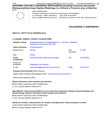 ENOTICES_magdag 27/09/2010- ID:2010-127250 1/ 96 Formularz standardowy 2 — PL DOSTAWA LEKLÓW Z LEKOSPISU SZPITALNEGO (produkty lecznicze) dla potrzeb Wielospecjalistycznego Szpitala Miejskiego im.J.Strusia w Poznaniu przy ul.Szkolnej 8/12 UNIA EUROPEJSKA Publikacja Suplementu do Dziennika Urzędowego Unii Europejskiej 2, rue Mercier, L-2985 Luksemburg Faks (352) 29 29-42670 E-mail: [email protected] Informacje i formularze on-line: http://simap.europa.eu OGŁOSZENIE O ZAMÓWIENIU SEKCJA I: INSTYTUCJA ZAMAWIAJĄCA I.1) NAZWA, ADRESY I PUNKTY KONTAKTOWE Oficjalna nazwa: Wielospecjalistyczny Szpital Miejski im. J. Strusia z Zakładem Opiekuńczo Leczniczym SP ZOZ Adres pocztowy: ul.Szwajcarska 3 Miejscowość: Poznań Kraj: Polska Punkt kontaktowy: Dział Zamówień Publicznych Szpitala Osoba do kontaktów: Magdalena Głuchowska E-mail: [email protected] Kod pocztowy: 61-285 Tel.: 618739033 Faks: 618779517 Adres(y) internetowy(e) (jeżeli dotyczy) Ogólny adres instytucji zamawiającej (URL): www.szpital-strusia.poznan.pl Adres profilu nabywcy (URL): Więcej informacji można uzyskać pod adresem: jak podano wyżej dla punktu kontaktowego inny: proszę wypełnić załącznik A.I Specyfikacje i dokumenty dodatkowe (w tym dokumenty dotyczące dialogu konkurencyjnego oraz Dynamicznego Systemu Zakupów) można uzyskać pod adresem: jak podano wyżej dla punktu kontaktowego inny: proszę wypełnić załącznik A.II Oferty lub wnioski o dopuszczenie do udziału w postępowaniu należy przesyłać na adres: jak podano wyżej dla punktu kontaktowego inny: proszę wypełnić załącznik A.III ENOTICES_magdag 27/09/2010- ID:2010-127250 2/ 96 Formularz standardowy 2 — PL DOSTAWA LEKLÓW Z LEKOSPISU SZPITALNEGO (produkty lecznicze) dla potrzeb Wielospecjalistycznego Szpitala Miejskiego im.J.Strusia w Poznaniu przy ul.Szkolnej 8/12 I.2) RODZAJ INSTYTUCJI ZAMAWIAJĄCEJ I GŁÓWNY PRZEDMIOT LUB PRZEDMIOTY DZIAŁALNOŚCI Ministerstwo lub inny organ krajowy lub federalny, w tym jednostki regionalne i lokalne Agencja/Urząd krajowy lub federalny Ogólne usługi publiczne Organ władzy regionalnej lub lokalnej Środowisko Agencja/Urząd regionalny lub lokalny Podmiot prawa publicznego Instytucja/agencja europejska lub organizacja międzynarodowa Inne (proszę określić): Obrona Porządek i bezpieczeństwo publiczne Sprawy gospodarcze i finansowe Zdrowie Budownictwo i obiekty komunalne Ochrona socjalna Rekreacja, kultura i religia Edukacja Inne (proszę określić): Instytucja zamawiająca dokonuje zakupu w imieniu innych instytucji zamawiających: tak nie ENOTICES_magdag 27/09/2010- ID:2010-127250 3/ 96 Formularz standardowy 2 — PL DOSTAWA LEKLÓW Z LEKOSPISU SZPITALNEGO (produkty lecznicze) dla potrzeb Wielospecjalistycznego Szpitala Miejskiego im.J.Strusia w Poznaniu przy ul.Szkolnej 8/12 SEKCJA II: PRZEDMIOT ZAMÓWIENIA II.1) OPIS II.1.1) Nazwa nadana zamówieniu przez instytucję zamawiającą DOSTAWA LEKLÓW Z LEKOSPISU SZPITALNEGO (produkty lecznicze) dla potrzeb Wielospecjalistycznego Szpitala Miejskiego im.J.Strusia w Poznaniu przy ul.Szkolnej 8/12 II.1.2) Rodzaj zamówienia oraz lokalizacja robót budowlanych, miejsce realizacji dostawy lub świadczenia usług (Wybrać wyłącznie jedną kategorię – roboty budowlane, dostawy lub usługi – która najbardziej odpowiada konkretnemu przedmiotowi zamówienia lub zakupu) a) Roboty budowlane Wykonanie b) Dostawy Kupno Zaprojektowanie i wykonanie Dzierżawa Wykonanie, za pomocą dowolnych środków, obiektu budowlanego, odpowiadającego wymogom określonym przez instytucję zamawiającą Najem c) Usługi Kategoria usługi: nr (dla usług kategorii 1-27 zob. załącznik II do dyrektywy 2004/18/ WE) Leasing Połączenie powyższych form Główne miejsce lub lokalizacja robót budowlanych Główne miejsce realizacji dostawy Główne miejsce świadczenia usług siedziba Zamawiającego (ul.Szkolna 8/12 w Poznaniu) Kod NUTS II.1.3) Ogłoszenie dotyczy Zamówienia publicznego Zawarcia umowy ramowej Utworzenia dynamicznego systemu zakupów (DSZ) II.1.4) Informacje na temat umowy ramowej (jeżeli dotyczy) Umowa ramowa z kilkoma wykonawcami Umowa ramowa z jednym wykonawcą Liczba LUB, jeżeli dotyczy,maksymalna liczba uczestników planowanej umowy ramowej Czas trwania umowy ramowej: Okres w latach: lub miesiącach: Uzasadnienie dla umowy ramowej, której czas trwania przekracza okres czterech lat: Szacunkowa całkowita wartość zakupów w całym okresie obowiązywania umowy ramowej (jeżeli dotyczy; podać wyłącznie dane liczbowe): Szacunkowa wartość bez VAT: LUB Zakres: między Waluta: a Waluta: Częstotliwość oraz wartość zamówień, które zostaną udzielone (jeżeli możliwe do określenia):: 4/ 96 ENOTICES_magdag 27/09/2010- ID:2010-127250 Formularz standardowy 2 — PL DOSTAWA LEKLÓW Z LEKOSPISU SZPITALNEGO (produkty lecznicze) dla potrzeb Wielospecjalistycznego Szpitala Miejskiego im.J.Strusia w Poznaniu przy ul.Szkolnej 8/12 II.1.5) Krótki opis zamówienia lub zakupu(ów) Dostawa leków z lekospisu szpitalnego (produktów leczniczych) dla Wielospecjalistycznego Szpitala Miejskiego im. J. Strusia przy ul. Szkolnej 8/12 w Poznaniu, z podziałem na 78 pakietów. Przedmiot zamówienia obejmuje również dostawę leków do zamawiającego przez wykonawcę. ENOTICES_magdag 27/09/2010- ID:2010-127250 5/ 96 Formularz standardowy 2 — PL DOSTAWA LEKLÓW Z LEKOSPISU SZPITALNEGO (produkty lecznicze) dla potrzeb Wielospecjalistycznego Szpitala Miejskiego im.J.Strusia w Poznaniu przy ul.Szkolnej 8/12 II.1.6) Wspólny Słownik Zamówień (CPV) Słownik główny Główny przedmiot Słownik uzupełniający (jeżeli dotyczy) 33690000 II.1.7) Zamówienie jest objęte Porozumieniem w sprawie zamówień rządowych (GPA) tak nie II.1.8) Podział na części (w celu podania informacji o częściach zamówienia należy wykorzystać załącznik B w liczbie odpowiadającej liczbie części) tak nie Jeżeli tak, oferty należy składać w odniesieniu do (zaznacz