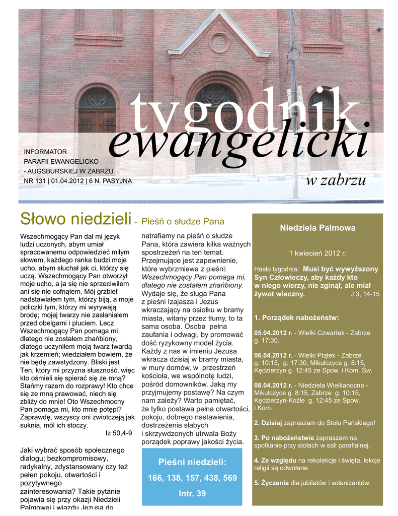 tygodnik ewangelicki INFORMATOR PARAFII EWANGELICKO - AUGSBURSKIEJ W ZABRZU NR 131 | 01.04.2012 | 6 N. PASYJNA w zabrzu Słowo niedzieli - Pieśń o słudze Pana Wszechmogący Pan dał mi język ludzi uczonych, abym umiał spracowanemu odpowiedzieć miłym słowem, każdego ranka budzi moje ucho, abym słuchał jak ci, którzy się uczą. Wszechmogący Pan otworzył moje ucho, a ja się nie sprzeciwiłem ani się nie cofnąłem. Mój grzbiet nadstawiałem tym, którzy biją, a moje policzki tym, którzy mi wyrywają brodę; mojej twarzy nie zasłaniałem przed obelgami i pluciem. Lecz Wszechmogący Pan pomaga mi, dlatego nie zostałem zhańbiony, dlatego uczyniłem moją twarz twardą jak krzemień; wiedziałem bowiem, że . nie Św.będę zawstydzony. Bliski jest Ten, który mi przyzna słuszność, więc kto ośmieli się spierać się ze mną? Stańmy razem do rozprawy! Kto chce się ze mną prawować, niech się zbliży do mnie! Oto Wszechmocny Pan pomaga mi, kto mnie potępi? Zaprawdę, wszyscy oni zwiotczeją jak suknia, mól ich stoczy. Iz 50,4-9 Jaki wybrać sposób społecznego dialogu; bezkompromisowy, radykalny, zdystansowany czy też pełen pokoju, otwartości i pozytywnego zainteresowania? Takie pytanie pojawia się przy okazji Niedzieli Palmowej i wjazdu Jezusa do natrafiamy na pieśń o słudze Pana, która zawiera kilka ważnych spostrzeżeń na ten temat. Przejmujące jest zapewnienie, które wybrzmiewa z pieśni: Wszechmogący Pan pomaga mi, dlatego nie zostałem zhańbiony. Wydaje się, że sługa Pana z pieśni Izajasza i Jezus wkraczający na osiołku w bramy miasta, witany przez tłumy, to ta sama osoba. Osoba pełna zaufania i odwagi, by promować dość ryzykowny model życia. Każdy z nas w imieniu Jezusa wkracza dzisiaj w bramy miasta, w mury domów, w przestrzeń kościoła, we wspólnotę ludzi, pośród domowników. Jaką my przyjmujemy postawę? Na czym nam zależy? Warto pamiętać, że tylko postawa pełna otwartości, pokoju, dobrego nastawienia, dostrzeżenia słabych i skrzywdzonych utrwala Boży porządek poprawy jakości życia. Pieśni niedzieli: 166, 138, 157, 438, 569 Intr. 39 Niedziela Palmowa 1 kwiecień 2012 r. Hasło tygodnia: Musi być wywyższony Syn Człowieczy, aby każdy kto w niego wierzy, nie zginął, ale miał żywot wieczny. J 3, 14-15 1. Porządek nabożeństw: 05.04.2012 r. - Wielki Czwartek - Zabrze g. 17:30. 06.04.2012 r. - Wielki Piątek - Zabrze g. 10:15, g. 17:30, Mikulczyce g. 8:15, Kędzierzyn g. 12:45 ze Spow. i Kom. Św. 08.04.2012 r. - Niedziela Wielkanocna Mikulczyce g. 8:15, Zabrze g. 10:15, Kędzierzyn-Koźle g. 12:45 ze Spow. i Kom. 2. Dzisiaj zapraszam do Stołu Pańskiego! 3. Po nabożeństwie zapraszam na spotkanie przy stołach w sali parafialnej. 4. Ze względu na rekolekcje i święta, lekcje religii są odwołane. 5. Życzenia dla jubilatów i solenizantów. Spotkanie Młodzieżowe W piątek 30.03.2012 r. młodzież na swoim spotkaniu gościła pedagoga ulicy p. Roberta Cieślara, pracującego z dziećmi z Bytomia-Bobrka. Uczestnicy spotkania zapoznali się nie tylko z jego pracą, ale także z sytuacją bytomskich dzieci. Spotkanie urozmaicone zostało zdjęciami, zrobionymi przez podopiecznych p. Roberta. Bytomskie dzieci przy użycia aparatu fotograficznego pokazały otaczający ich świat. Wystawę można oglądać przez najbliższe 2 tygodnie w sali parafialnej. M.P. Pasyjne Dni Skupienia dla dzieci W dniach 2-3 kwietnia 2012 r. w godzinach od 16:00 do 18:00 odbędą się w naszej parafii Pasyjne Dni Skupienia dla uczniów szkół podstawowych oraz klas pierwszych gimnazjum. Tegoroczne Pasyjne Dni Skupienia odbędą się pod hasłem: Spotkania ważne dla naszego życia - spotkanie z sobą samym, spotkanie z Bogiem, spotkanie z bliźnim. Natomiast w środę 4.04.2012 r. o g. 17:30 odbędą się rekolekcje dla rodziców. Zapraszamy! Zjazd Młodzieży We wtorek po świętach odbędzie się w Żorach diecezjalny zjazd młodzieży. Osoby chętne proszę o zgłoszenie się w kancelarii parafialnej. Sam zdecyduj, co z 1% Za sprawą 1 % naszego podatku możemy wesprzeć działania diakonijne realizowane w naszej zabrzańskiej parafii: Świetlicę „Szansa”, Klub Seniora, Wypożyczalnię Sprzętu Rehabilitacyjnego. Wystarczy w swoim zeznaniu podatkowym wypełnić: Nazwa OPP: Diakonia Kościoła EwangelickoAugsburskiego w RP Numer KRS: 0000260697 Cel szczegółowy: Diakonia Parafii EwangelickoAugsburskiej w Zabrzu Nabożeństwo i spotkanie W Wielką Sobotę 7.04.2012 r. odbędzie się w naszej Parafii nabożeństwo spowiednio-komunijne oraz