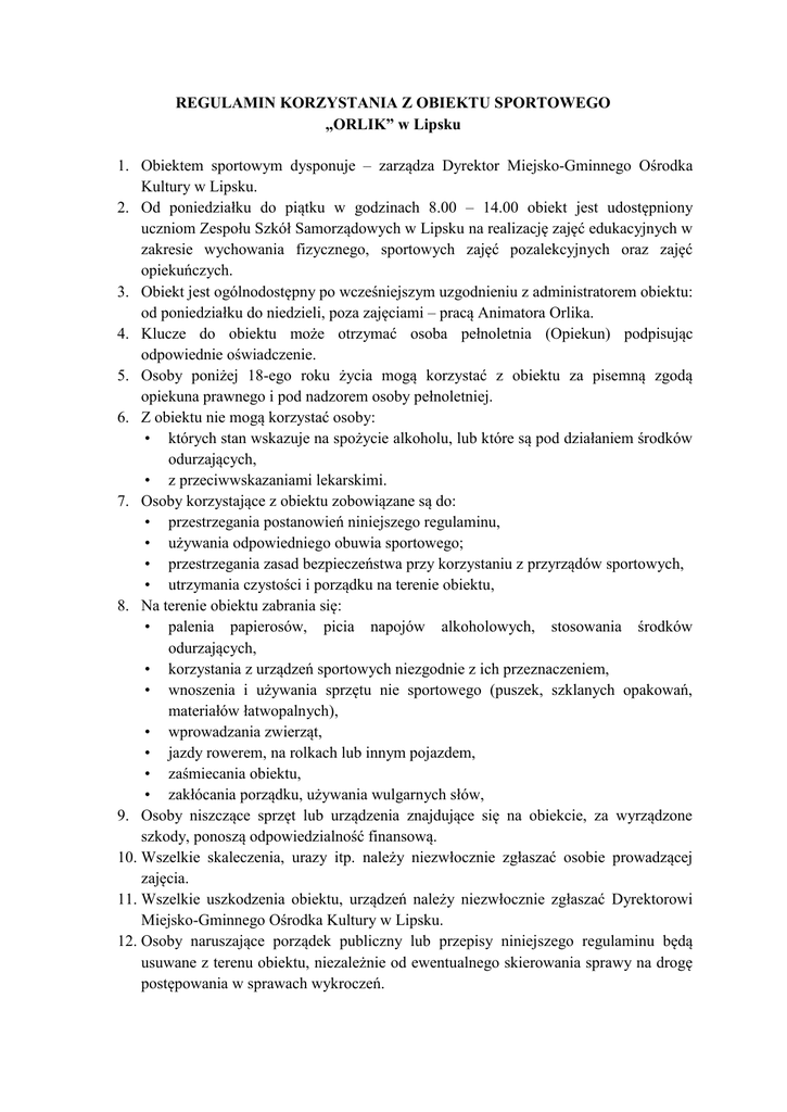 REGULAMIN KORZYSTANIA Z OBIEKTU SPORTOWEGO „ORLIK” w Lipsku 1. Obiektem sportowym dysponuje – zarządza Dyrektor Miejsko-Gminnego Ośrodka Kultury w Lipsku. 2. Od poniedziałku do piątku w godzinach 8.00 – 14.00 obiekt jest udostępniony uczniom Zespołu Szkół Samorządowych w Lipsku na realizację zajęć edukacyjnych w zakresie wychowania fizycznego, sportowych zajęć pozalekcyjnych oraz zajęć opiekuńczych. 3. Obiekt jest ogólnodostępny po wcześniejszym uzgodnieniu z administratorem obiektu: od poniedziałku do niedzieli, poza zajęciami – pracą Animatora Orlika. 4. Klucze do obiektu może otrzymać osoba pełnoletnia (Opiekun) podpisując odpowiednie oświadczenie. 5. Osoby poniżej 18-ego roku życia mogą korzystać z obiektu za pisemną zgodą opiekuna prawnego i pod nadzorem osoby pełnoletniej. 6. Z obiektu nie mogą korzystać osoby: • których stan wskazuje na spożycie alkoholu, lub które są pod działaniem środków odurzających, • z przeciwwskazaniami lekarskimi. 7. Osoby korzystające z obiektu zobowiązane są do: • przestrzegania postanowień niniejszego regulaminu, • używania odpowiedniego obuwia sportowego; • przestrzegania zasad bezpieczeństwa przy korzystaniu z przyrządów sportowych, • utrzymania czystości i porządku na terenie obiektu, 8. Na terenie obiektu zabrania się: • palenia papierosów, picia napojów alkoholowych, stosowania środków odurzających, • korzystania z urządzeń sportowych niezgodnie z ich przeznaczeniem, • wnoszenia i używania sprzętu nie sportowego (puszek, szklanych opakowań, materiałów łatwopalnych), • wprowadzania zwierząt, • jazdy rowerem, na rolkach lub innym pojazdem, • zaśmiecania obiektu, • zakłócania porządku, używania wulgarnych słów, 9. Osoby niszczące sprzęt lub urządzenia znajdujące się na obiekcie, za wyrządzone szkody, ponoszą odpowiedzialność finansową. 10. Wszelkie skaleczenia, urazy itp. należy niezwłocznie zgłaszać osobie prowadzącej zajęcia. 11. Wszelkie uszkodzenia obiektu, urządzeń należy niezwłocznie zgłaszać Dyrektorowi Miejsko-Gminnego Ośrodka Kultury w Lipsku. 12. Osoby naruszające porządek publiczny lub przepisy niniejszego regulaminu będą usuwane z terenu obiektu, niezależnie od ewentualnego skierowania sprawy na drogę postępowania w sprawach wykroczeń. 13. Zarządca obiektu nie ponosi odpowiedzialności za rzeczy wartościowe pozostawione na obiekcie. 14. Zarządca może kontrolować wszystkie zajęcia, a w razie uchybień zakazać korzystania z obiektu. 15. Decyzje związane z funkcjonowaniem obiektu nie ujęte w regulaminie podejmuje Dyrektor M-GOK w Lipsku. 16. Opiekun (osoba która wynajęła obiekt) zwolni Zarządcę od odpowiedzialności w zakresie wszelkich roszczeń kierowanych wobec Zarządcy przez osoby trzecie, będących konsekwencją działań lub zaniechań Opiekuna związanych z organizacją i przeprowadzeniem zajęć sportowo-rekreacyjnych. 17. Zarządca nie ponosi odpowiedzialności za straty materialne i uszczerbki na zdrowiu wynikłe z niestosowania lub nienależytego stosowania się do postanowień niniejszego regulaminu lub wynikające ze złego stanu zdrowia użytkowników. 18. Regulamin podlega podaniu do publicznej wiadomości poprzez publikację na stronie internetowej M-GOK w Lipsku oraz umieszczenie Regulaminu na budynku od strony obiektu.