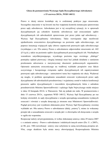 Glosa do postanowienia Wyższego Sądu Dyscyplinarnego Adwokatury z 15 czerwca 2013r., WSD 140/12. Prawo w dużej mierze kształtuje się w codziennej praktyce jego stosowania. Szczególne znaczenie w tej kwestii ma bez wątpienia kontrola instancyjna sprawowana przez sądy odwoławcze. Adwokatura jest w tej szczęśliwej sytuacji, że w sprawach dyscyplinarnych jej członków kontrola odwoławcza nad orzeczeniami sądów dyscyplinarnych izb adwokackich sprawowana jest przez jeden sąd odwoławczy Wyższy Sąd Dyscyplinarny Adwokatury. Takie rozwiązanie daje możliwość ujednolicenia orzecznictwa dyscyplinarnego na poziomie sądu odwoławczego, zaś poprzez instytucję wiążących sądy izbowe zapatrywań prawnych sądu odwoławczego (wynikające z art. 95n ustawy Prawo o adwokaturze odpowiednie stosowanie art. 442 §3 k.p.k.), także na poziomie sądów dyscyplinarnych poszczególnych izb. Niezbędnym warunkiem satysfakcjonującego, wysokiego poziomu tego swoistego „dialogu” pomiędzy sądami pierwszej i drugiej instancji musi być jednak działanie z zamiarem przekonania adwersarza o merytorycznej słuszności podnoszonych argumentów. Opieranie autorytetu orzeczniczego na wadliwej wykładni przepisów oraz fakcie oczywistego i bezspornego związania sądów dyscyplinarnych izb zapatrywaniami prawnymi sądu odwoławczego - autorytetowi temu bez wątpienia nie służy. Wydawać się mogło, iż problem sporządzania uzasadnień orzeczeń wydawanych przez sądy dyscyplinarne izb adwokackich przedstawiony i wyjaśniony został w trakcie konferencji prezesów sądów dyscyplinarnych i rzeczników dyscyplinarnych, która z udziałem przedstawiciela Ministra Sprawiedliwości i sędziego Sądu Najwyższego miała miejsce w dniu 10 listopada 2012r. w Warszawie. Tak się jednak nie stało. W postanowieniu z dnia 15 czerwca 2013r., sygnatura WSD 140/12, Wyższy Sąd Dyscyplinarny po raz kolejny stwierdził, że sądy dyscyplinarne z urzędu sporządzają uzasadnienia wydanych orzeczeń i również z urzędu doręczają je stronom oraz Ministrowi Sprawiedliwości. Pogląd powyższy jest wynikiem dokonania przez Wyższy Sąd Dyscyplinarny swoistej wykładni art. 88a ustawy Prawo o adwokaturze (dalej „ustawy”), mimo że wskazany przepis tak o uzasadnianiu orzeczeń z urzędu jak i o obowiązku ich doręczania z urzędu w ogóle nie wspomina. Rozpocząć należy od przypomnienia, iż wobec dokonanej ustawą z dnia 29 marca 2007 r. o zmianie ustawy - Prawo o adwokaturze i niektórych innych ustaw (Dz. U. z 2007r., nr 80, poz. 540) nowelizacji ustawy oraz uchylenia ta samą nowelizacją przepisu art. 95m, czego skutkiem była utrata mocy obowiązującej Rozporządzenia Ministra Sprawiedliwości z dnia 23 lipca 1998 r. w sprawie postępowania dyscyplinarnego w stosunku do adwokatów i aplikantów adwokackich - począwszy od dnia 9 czerwca 2007r. postępowanie dyscyplinarne wobec adwokatów i aplikantów adwokackich regulują wyłącznie przepisy ustawy (art. 80-95n) oraz w zakresie nieuregulowanym przez ustawę, odpowiednio przepisy Kodeksu postępowania karnego. Tego rodzaju przepisy odsyłające wyrażają nakaz posłużenia się analogią ustawy jako sposobem stosowania prawa w wypadkach wskazanych przez przepis odsyłający. Sąd dyscyplinarny chcąc zastosować przepisy kodeksu postępowania karnego, musi po pierwsze stwierdzić, że dana kwestia nie jest uregulowana w ustawie ustrojowej, po drugie zaś ustalić, które przepisy tej ustawy procesowej mają być "odpowiednio stosowane" w postępowaniu dyscyplinarnym i wreszcie, czy stosując je nie należy zmodyfikować ich treści, w celu dostosowania konkretnego przepisu kodeksu postępowania karnego do specyfiki postępowania, którego przedmiotem jest odpowiedzialność dyscyplinarna. Odpowiednie stosowanie określonych przepisów nie jest czynnością o jednolitym charakterze. W tym zakresie da się bowiem wyróżnić co najmniej trzy grupy. Do pierwszej zalicza się sytuacje, gdy przepisy prawa mają być stosowane bez żadnych zmian w ich dyspozycji. Do drugiej grupy wypadki, gdy odnośne przepisy będą stosowane po określonych modyfikacjach. Do trzeciej zaś zalicza się natomiast te wszystkie przepisy, które w ogóle nie mogą być stosowane do drugiego zakresu odniesienia, głównie ze względu na ich bezprzedmiotowość, bądź też całkowitą sprzeczność z przepisami ustanowionymi dla tych stosunków, do których miałyby one być stosowane odpowiednio.1 Nie sposób zaakceptować poglądu prezentowanego przez Wyższy Sąd Dyscyplinarny, jakoby z treści art. 88a ustawy wynikał obowiązek sporządzania „z urzędu” przez sąd dyscyplinarny izby adwokackiej uzasadnień orzeczeń oraz doręczania ich „z urzędu” stronom oraz Ministrowi Sprawiedliwości wraz z pouczeniem o trybie odwołania. Kwestią odmienną jest uzasadnianie postanowień, o czym będzie mowa niżej. Szczegółowa i uwzględniająca zasady wykładni analiza przepisów ustawy oraz kodeksu postępowania karnego w ich wzajemnym powiązaniu prowadzi do wniosków odmiennych. Art. 88a ustawy („Od orzeczeń i postanowień kończących postępowanie dyscyplinarne odwołanie przysługuje stronom oraz Ministrowi Sprawiedliwości w terminie 14 dni od dnia doręczenia odpisu orzeczenia albo postanowienia, wraz z uzasadnieniem oraz pouczeniem o terminie i trybie wniesienia odwołania”) reguluje wyłącznie, co wprost 1 Postanowienie Sądu Najwyższego z dnia 4 stycznia 2011 r., SDI 32/10, OSNKW 2011/2/12. wynika z jego literalnej treści, uprawnienie stron i Ministra Sprawiedliwości do wniesienia odwołania od orzeczeń i postanowień kończących postępowanie dyscyplinarne, termin do wniesienia odwołania i sposób liczenia biegu tego terminu, wreszcie obowiązek pouczenia o terminie i trybie wniesienia odwołania. Przepis ten odpowiada w systemie norm procedury karnej przepisom art. 444 k.p.k. („Od wyroku sądu pierwszej instancji stronom, podmiotowi