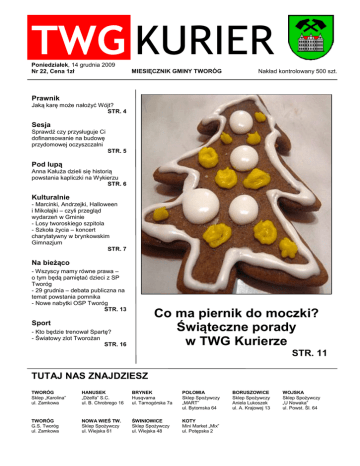 ż TWG KURIER Poniedziałek, 14 grudnia 2009 Nr 22, Cena 1zł MIESIĘCZNIK GMINY TWORÓG Nakład kontrolowany 500 szt. Prawnik Jaką karę może nałożyć Wójt? STR. 4 Sesja Sprawdź czy przysługuje Ci dofinansowanie na budowę przydomowej oczyszczalni STR. 5 Pod lupą Anna Kałuża dzieli się historią powstania kapliczki na Wykierzu STR. 6 Kulturalnie - Marcinki, Andrzejki, Halloween i Mikołajki – czyli przegląd wydarzeń w Gminie - Losy tworoskiego szpitola - Szkoła życia – koncert charytatywny w brynkowskim Gimnazjum STR. 7 Na bieżąco - Wszyscy mamy równe prawa – o tym będą pamiętać dzieci z SP Tworóg - 29 grudnia – debata publiczna na temat powstania pomnika - Nowe nabytki OSP Tworóg STR. 13 Co ma piernik do moczki? Świąteczne porady w TWG Kurierze Sport - Kto będzie trenował Spartę? - Światowy zlot Tworożan STR. 16 STR. 11 TUTAJ NAS ZNAJDZIESZ TWORÓG Sklep „Karolina” ul. Zamkowa HANUSEK „Dżelfa” S.C. ul. B. Chrobrego 16 BRYNEK Husqvarna ul. Tarnogórska 7a POŁOMIA Sklep Spożywczy „MART” ul. Bytomska 64 TWORÓG G.S. Tworóg ul. Zamkowa NOWA WIEŚ TW. Sklep Spożywczy ul. Wiejska 61 ŚWINIOWICE Sklep Spożywczy ul. Wiejska 48 KOTY Mini Market „Mix” ul. Potępska 2 BORUSZOWICE Sklep Spożywczy Aniela Lukoszek ul. A. Krajowej 13 WOJSKA Sklep Spożywczy „U Nowaka” ul. Powst. Śl. 64 TWG KURIER WSTĘPNIAK Spis treści Od redakcji LISTONOSZLLLL....LLLLLLLLLL....s.3 Drodzy Mieszkańcy! PRAWNIKLLLL...LLLLLLLLLLLL..s.4 - Kara administracyjna W grudniowym numerze TWG Kuriera czeka na was garść informacji na temat spotkań, które odbyły się ostatnio w naszej Gminie. Informujemy również o zmianach opłat, jakie czekają nas w nadchodzącym roku. Nie zabraknie również świątecznych porad i przepisów. Mamy nadzieję, że podczas świątecznych przygotowań znajdziecie chwilkę na lekturę naszego miesięcznika. SESJALLLLLLLLLLLL.LLLLL.L.s.5 - Nowe taryfy za wodę i ścieki - Dofinansowanie do przydomowych oczyszczalni ścieków GMINA POD LUPĄLLLLLLLLLLLLL.s.6 - Drewniana kapliczka na Wykierzu KULTURALNIELLLLLLLLLLLLLLLs.7 - Marcinki w Wojsce - Halloween w Wojsce - Andrzejki w Świniowicach - Wizyta Sznupka w przedszkolu - Mikołajki w GOK-u - Szpital - O życiu w hospicjum - Kurs Foto, cz. 6 - TWG Kobieta / Mężczyzna - TWG Kurier poleca Na nadchodzące Święta Bożego Narodzenia życzymy Państwu pogody ducha, optymistycznego spojrzenia na otaczający nas świat, radości wspólnego kolędowania przy wigilijnym stole, wielu prezentów pod choinką, a w zbliżającym się Nowym Roku samych słonecznych, radosnych dni. NA BIEŻĄCOLLLLLLLLLL...LLL......s.13 - Zaradni strażacy z OSP Tworóg - By pamiętać swoją historię - Ranking gmin – pniemy się w górę! Zapraszamy do lektury! www.twgkurier.pl [email protected] SPORTLLLLLLLLLLLLL.LLLLLs.16 Redakcja Agata Ziaja – Redaktor naczelny Grażyna Chmiel – Redaktor kulturalny Łukasz Frączek – Redaktor prawny Agnieszka Roter – Redaktor terenowy Kreacja Łukasz Krain – Dyrektor kreatywny Mecenat Grażyna Chmiel – Dyrektor Gminnego Ośrodka Kultury Gościnnie Piotr Gansiniec, Katarzyna Kulik, Grażyna Nierychło, Hanna Pawełczyk, Alicja Sopot, Anna Wallach, Fryderyk Zgodzaj Wydawca Gminny Ośrodek Kultury w Tworogu, ul. Zamkowa 1, 42-690 Tworóg, tel. (32) 285 74 92 Druk TextPartner 2 TWG KURIER LISTONOSZ ŚWIĄTECZNY CZAS SPROSTOWANIE W listopadowym numerze TWG Kuriera podano nieprawidłowe wyniki kwietniowego egzaminu gimnazjalnego. Omyłkowo wpisano wyniki próbnych egzaminów, które były o wiele niższe niż wyniki właściwego egzaminu. Przedstawiamy średnią liczbę punktów uzyskanych przez uczniów Gimnazjum w Brynku w poszczególnych częściach egzaminu: część humanistyczna – 35,4 (średnia liczba pkt. w kraju – 31,67), część matematyczno – przyrodnicza 26,7 (średnia liczba pkt w kraju – 26,03), język niemiecki – 36,1 (średnia liczba pkt w kraju – 33,03). Przepraszamy naszych czytelników za pomyłkę. W ten świąteczny czas, jedyny taki w roku, życzymy mnóstwa wzruszeń, serdeczności od najbliższych oraz by Święta przyniosły wiele magicznych chwil w gronie najbliższych, Redakcja TWG Kuriera a Nowy Rok spełnił wszystkie, także te najskrytsze marzenia! Przewodnicząca Rady Gminy Tworóg Maria Łukoszek PODZIĘKOWANIA Wójt Gminy Tworóg Eugeniusz Gwóźdź Gminny Ośrodek Kultury w imieniu własnym i wszystkich obdarowanym mieszkańców gminy w mijającym roku, składa serdeczne podziękowania za dary serca Państwu Urszuli i Adamowi Garczarczyk. 3 TWG KURIER PRAWNIK nas karą oczywiści możemy złożyć zażalenie (w ciągu 7 dni od otrzymania postanowienia) do organu wyższej instancji. Następnie od rozstrzygnięcia drugiej instancji, jeżeli jest dla nas niekorzystne przysługiwać będzie skarga do sądu administracyjnego. KARA ADMINISTRACYJNA Niedawno w całym kraju głośno było na temat kar administracyjnych, w związku z planami naszych ustawodawców wprowadzenia systemu karania kierowców za wykroczenia drogowe właśnie w formie kar administracyjnych. Trybunał Konstytucyjny zakwestionował zgodność z Konstytucją takich przepisów. Ustawa o ochronie przyrody stanowi, że kara administracyjna grozi usuwanie drzew lub krzewów bez wymaganego zezwolenia, a także zniszczenie drzew, krzewów lub terenów zieleni spowodowane niewłaściwym wykonaniem zabiegów pielęgnacyjnych. Karę administracyjną wymierza wójt, burmistrz lub prezydent miasta w formie decyzji administracyjnej. Kara administracyjna to sankcja za naruszenie przepisów prawa administracyjnego. Najczęściej jest to kara pieniężna i jest ona wymierzana przez organy administracji publicznej w formie władczej decyzji lub postanowienia. Procedura jej zastosowania wynika z Kodeksu postępowania administracyjnego. Oznacza to, że obrona przed otrzymaniem kary jest ograniczona. Nie mamy bowiem do czynienia, tak jak w postępowaniu karnym czy w spra