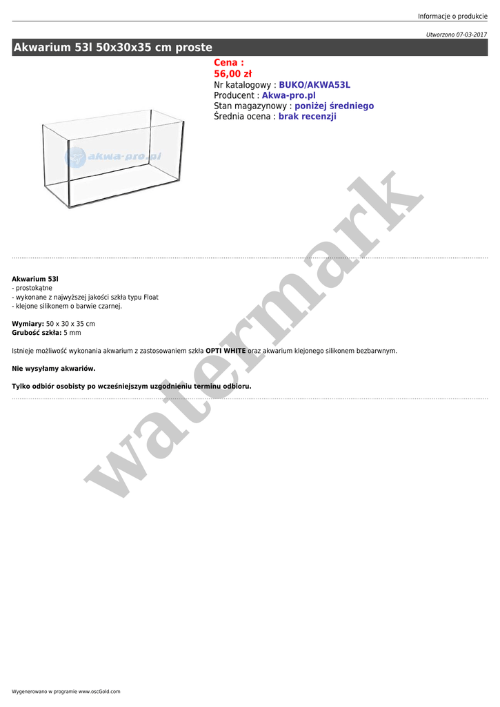 Informacje o produkcie Utworzono 07-03-2017 Akwarium 53l 50x30x35 cm proste Cena : 56,00 zł er m ar k Nr katalogowy : BUKO/AKWA53L Producent : Akwa-pro.pl Stan magazynowy : poniżej średniego Średnia ocena : brak recenzji Akwarium 53l - prostokątne - wykonane z najwyższej jakości szkła typu Float - klejone silikonem o barwie czarnej. Wymiary: 50 x 30 x 35 cm Grubość szkła: 5 mm Istnieje możliwość wykonania akwarium z zastosowaniem szkła OPTI WHITE oraz akwarium klejonego silikonem bezbarwnym. Nie wysyłamy akwariów. w at Tylko odbiór osobisty po wcześniejszym uzgodnieniu terminu odbioru. Wygenerowano w programie www.oscGold.com