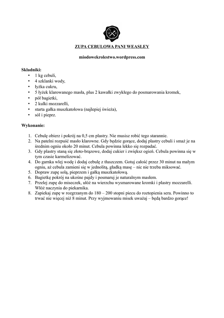 ZUPA CEBULOWA PANI WEASLEY miodowekrolestwo.wordpress.com Składniki: • 1 kg cebuli, • 4 szklanki wody, • łyżka cukru, • 5 łyżek klarowanego masła, plus 2 kawałki zwykłego do posmarowania kromek, • pół bagietki, • 2 kulki mozzarelli, • starta gałka muszkatołowa (najlepiej świeża), • sól i pieprz. Wykonanie: 1. Cebulę obierz i pokrój na 0,5 cm plastry. Nie musisz robić tego starannie. 2. Na patelni rozpuść masło klarowne. Gdy będzie gorące, dodaj plastry cebuli i smaż je na średnim ogniu około 20 minut. Cebula powinna lekko się rozpadać. 3. Gdy plastry staną się złoto-brązowe, dodaj cukier i zwiększ ogień. Cebula powinna się w tym czasie karmelizować. 4. Do garnka wlej wodę i dodaj cebulę z tłuszczem. Gotuj całość przez 30 minut na małym ogniu, aż cebula zamieni się w jednolitą, gładką masę – nic nie trzeba miksować. 5. Dopraw zupę solą, pieprzem i gałką muszkatołową. 6. Bagietkę pokrój na ukośne pajdy i posmaruj je naturalnym masłem. 7. Przelej zupę do miseczek, ułóż na wierzchu wysmarowane kromki i plastry mozzarelli. Włóż naczynia do piekarnika. 8. Zapiekaj zupę w rozgrzanym do 180 – 200 stopni piecu do roztopienia sera. Powinno to trwać nie więcej niż 8 minut. Przy wyjmowaniu misek uważaj – będą bardzo gorące!