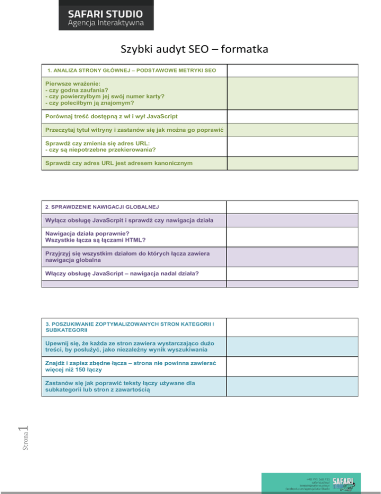 Szybki audyt SEO – formatka 1. 1. ANALIZA STRONY GŁÓWNEJ – PODSTAWOWE METRYKI SEO Pierwsze wrażenie: - czy godna zaufania? - czy powierzyłbym jej swój numer karty? - czy poleciłbym ją znajomym? Porównaj treść dostępną z wł i wył JavaScript Przeczytaj tytuł witryny i zastanów się jak można go poprawić Sprawdź czy zmienia się adres URL: - czy są niepotrzebne przekierowania? Sprawdź czy adres URL jest adresem kanonicznym 2. SPRAWDZENIE NAWIGACJI GLOBALNEJ Wyłącz obsługę JavaScrpit i sprawdź czy nawigacja działa Nawigacja działa poprawnie? Wszystkie łącza są łączami HTML? Przyjrzyj się wszystkim działom do których łącza zawiera nawigacja globalna Włączy obsługę JavaScript – nawigacja nadal działa? 3. POSZUKIWANIE ZOPTYMALIZOWANYCH STRON KATEGORII I SUBKATEGORII Upewnij się, że każda ze stron zawiera wystarczająco dużo treści, by posłużyć, jako niezależny wynik wyszukiwania Znajdź i zapisz zbędne łącza – strona nie powinna zawierać więcej niż 150 łączy Strona 1 Zastanów się jak poprawić teksty łączy używane dla subkategorii lub stron z zawartością 1. 4. AUDYT STRONY Z ZAWARTOŚCIĄ Sprawdź i zanotuj formaty tytułów stron Sprawdź i zanotuj format opisu strony w znaczniku <meta> Sprawdź i zanotuj formaty adresu URL Sprawdź czy zawartość można zaindeksować Sprawdź i zanotuj format tekstu w atrybutach alt obrazków Przeczytaj tekst tak jakbyś go szukała 1. 5. ANALIZA ŁĄCZY Przejrzyj łączną liczbę łączy na stronie (zew. i wew.) i liczbę głównych domen prowadzących do analizowanej domeny Sprawdź różnorodność tekstów łączy na zewnątrz Przejrzyj dane łączy zew. i wew. oraz rozkład tekstów łączy dla konkurencji 1. 6, SPRAWDZENIE WYNIKÓW W WYSZUKIWARKACH Wyszukaj domenę by upewnić się, że nie została na nią nałożona kara Sprawdź iloma (mniej więcej) zaindeksowanym stronami może poszczycić się witryna Wyszukaj trzy słowa kluczowe, dla których domena powinna osiągnąć dobry wynik Strona 2 Wybierz losową stronę z zawartością i sprawdź czy wyszukiwarki nie indeksują duplikatów Pamiętaj! Im bardziej precyzyjnie przeprowadzona optymalizacja WWW, tym większe szanse na uzyskanie efektów w postaci wyższych pozycji i większego ruchu na stronie. Warto więc zlecić jej wykonanie profesjonalistom, którzy posiadają nie tylko specjalistyczną wiedzę na ten temat, ale również doświadczenie. Skontaktuj się z nami i zamów Optymalizację Swojej Witryny! 791 168 715 [email protected] Strona 3 Kliknij i przejdź do formularza kontaktowego Wszystkie prawa zastrzeżone. Kopiowanie i udostępnianie bez zgody Safari Studio zabronione.