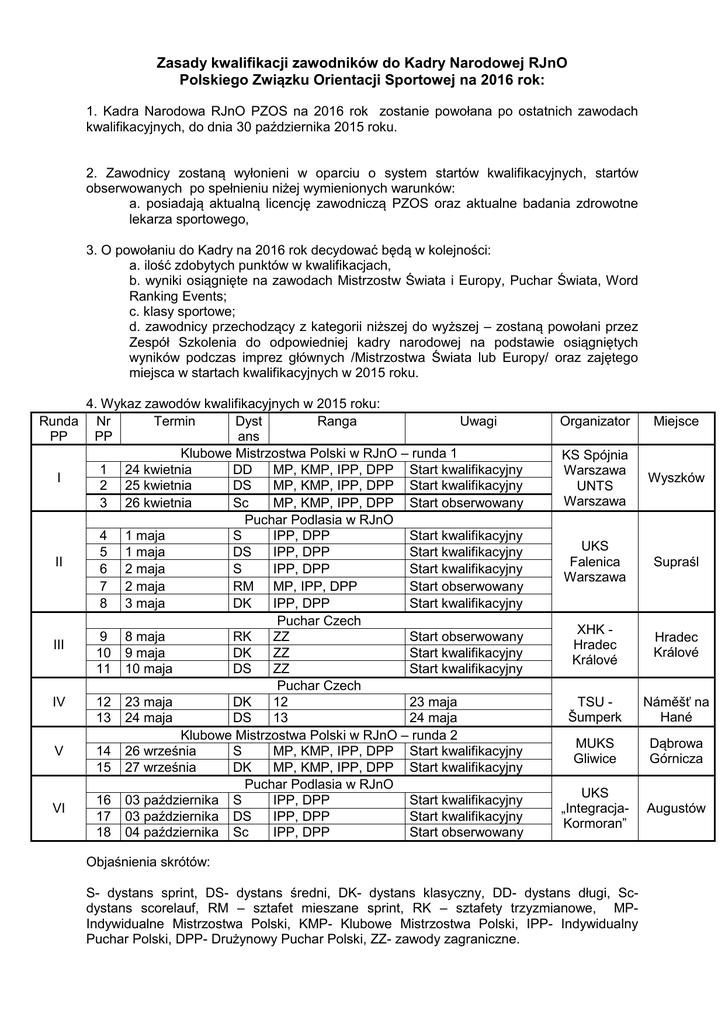Zasady kwalifikacji zawodników do Kadry Narodowej RJnO Polskiego Związku Orientacji Sportowej na 2016 rok: 1. Kadra Narodowa RJnO PZOS na 2016 rok zostanie powołana po ostatnich zawodach kwalifikacyjnych, do dnia 30 października 2015 roku. 2. Zawodnicy zostaną wyłonieni w oparciu o system startów kwalifikacyjnych, startów obserwowanych po spełnieniu niżej wymienionych warunków: a. posiadają aktualną licencję zawodniczą PZOS oraz aktualne badania zdrowotne lekarza sportowego, 3. O powołaniu do Kadry na 2016 rok decydować będą w kolejności: a. ilość zdobytych punktów w kwalifikacjach, b. wyniki osiągnięte na zawodach Mistrzostw Świata i Europy, Puchar Świata, Word Ranking Events; c. klasy sportowe; d. zawodnicy przechodzący z kategorii niższej do wyższej – zostaną powołani przez Zespół Szkolenia do odpowiedniej kadry narodowej na podstawie osiągniętych wyników podczas imprez głównych /Mistrzostwa Świata lub Europy/ oraz zajętego miejsca w startach kwalifikacyjnych w 2015 roku. 4. Wykaz zawodów kwalifikacyjnych w 2015 roku: Runda Nr Termin Dyst Ranga Uwagi PP PP ans Klubowe Mistrzostwa Polski w RJnO – runda 1 1 24 kwietnia DD MP, KMP, IPP, DPP Start kwalifikacyjny I 2 25 kwietnia DS MP, KMP, IPP, DPP Start kwalifikacyjny 3 26 kwietnia Sc MP, KMP, IPP, DPP Start obserwowany Puchar Podlasia w RJnO 4 1 maja S IPP, DPP Start kwalifikacyjny 5 1 maja DS IPP, DPP Start kwalifikacyjny II 6 2 maja S IPP, DPP Start kwalifikacyjny 7 2 maja RM MP, IPP, DPP Start obserwowany 8 3 maja DK IPP, DPP Start kwalifikacyjny Puchar Czech 9 8 maja RK ZZ Start obserwowany III 10 9 maja DK ZZ Start kwalifikacyjny 11 10 maja DS ZZ Start kwalifikacyjny Puchar Czech IV 12 23 maja DK 12 23 maja 13 24 maja DS 13 24 maja Klubowe Mistrzostwa Polski w RJnO – runda 2 V 14 26 września S MP, KMP, IPP, DPP Start kwalifikacyjny 15 27 września DK MP, KMP, IPP, DPP Start kwalifikacyjny Puchar Podlasia w RJnO 16 03 października S IPP, DPP Start kwalifikacyjny VI 17 03 października DS IPP, DPP Start kwalifikacyjny 18 04 października Sc IPP, DPP Start obserwowany Organizator Miejsce KS Spójnia Warszawa UNTS Warszawa Wyszków UKS Falenica Warszawa Supraśl XHK Hradec Králové Hradec Králové TSU Šumperk Náměšť na Hané MUKS Gliwice Dąbrowa Górnicza UKS „IntegracjaKormoran” Augustów Objaśnienia skrótów: S- dystans sprint, DS- dystans średni, DK- dystans klasyczny, DD- dystans długi, Scdystans scorelauf, RM – sztafet mieszane sprint, RK – sztafety trzyzmianowe, MPIndywidualne Mistrzostwa Polski, KMP- Klubowe Mistrzostwa Polski, IPP- Indywidualny Puchar Polski, DPP- Drużynowy Puchar Polski, ZZ- zawody zagraniczne. 5. Punktacja startów kwalifikacyjnych odbywa się według następujących kryteriów: a. za każde zwycięstwo w zawodach zawodnik otrzymuje 100 punktów, a pozostali zawodnicy zdobywają punkty w zależności od procentowej straty czasu do zwycięskiego zawodnika, b. za każdy 1 procent straty czasu do zwycięzcy zawodnik otrzymuje -4 punkty, maksymalnie można stracić 25 % czasu do zwycięzcy aby otrzymać punkty (wynik zaokrągla się do pełnych punktów), c. zawody krajowe będą brane do punktacji, tylko wówczas, gdy wystartuje w danej kategorii wiekowej następująca ilość zawodników z daną Klasą Sportową : - K-21, M-21 - 3 zawodników z I Klasą Sportową lub wyższą. - K-20, M-20 - 2 zawodników z I Klasą Sportową lub wyższą. - K-17, M-17 - 3 zawodników z II Klasą Sportową lub wyższą. Zapis ten nie obowiązuje podczas startu w zawodach zagranicznych. d. punktacja według powyższych zasad mnożona jest przez współczynnik: x 1,4 dla zawodów zagranicznych na dystansie klasycznym i średnim x 1,2 dla Mistrzostw Polski na dystansie klasycznym i długim, x 1,1 dla Mistrzostw Polski na dystansie średnim x 1,0 dla Mistrzostw Polski na dystansie sprinterskim. x 1,0 dla pozostałych zawodów krajowych. 6. Do punktacji końcowej zaliczanych jest 8 najlepszych wyników ze startów kwalifikacyjnych według następującego klucza: a. maksimum 6 wyników z zawodów krajowych, a w tym - 2 najlepsze wyniki na dystansie klasycznym lub długim, - 2 najlepsze wyniki na dystansie średnim, - 2 najlepsze wyniki na dystansie sprint b. maksimum 2 najlepsze wyniki z zawodów zagranicznych na dowolnym dystansie. 7. Koszty udziału w kwalifikacjach do Kadry pokrywają kluby lub zawodnicy indywidualnie. 8. Regulamin Zasad kwalifikacji do Kadry wchodzi w życie z dniem …. 2015 roku