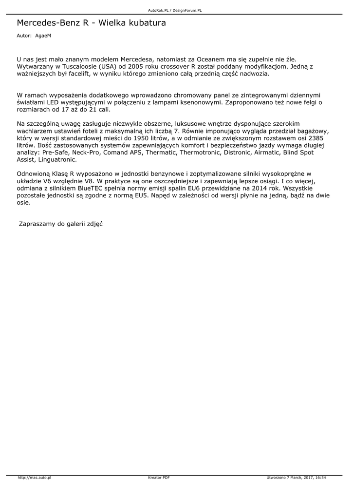 AutoRok.PL / DesignForum.PL Mercedes-Benz R - Wielka kubatura Autor: AgaeM U nas jest mało znanym modelem Mercedesa, natomiast za Oceanem ma się zupełnie nie źle. Wytwarzany w Tuscaloosie (USA) od 2005 roku crossover R został poddany modyfikacjom. Jedną z ważniejszych był facelift, w wyniku którego zmieniono całą przednią część nadwozia. W ramach wyposażenia dodatkowego wprowadzono chromowany panel ze zintegrowanymi dziennymi światłami LED występującymi w połączeniu z lampami ksenonowymi. Zaproponowano też nowe felgi o rozmiarach od 17 aż do 21 cali. Na szczególną uwagę zasługuje niezwykle obszerne, luksusowe wnętrze dysponujące szerokim wachlarzem ustawień foteli z maksymalną ich liczbą 7. Równie imponująco wygląda przedział bagażowy, który w wersji standardowej mieści do 1950 litrów, a w odmianie ze zwiększonym rozstawem osi 2385 litrów. Ilość zastosowanych systemów zapewniających komfort i bezpieczeństwo jazdy wymaga długiej analizy: Pre-Safe, Neck-Pro, Comand APS, Thermatic, Thermotronic, Distronic, Airmatic, Blind Spot Assist, Linguatronic. Odnowioną Klasę R wyposażono w jednostki benzynowe i zoptymalizowane silniki wysokoprężne w układzie V6 względnie V8. W praktyce są one oszczędniejsze i zapewniają lepsze osiągi. I co więcej, odmiana z silnikiem BlueTEC spełnia normy emisji spalin EU6 przewidziane na 2014 rok. Wszystkie pozostałe jednostki są zgodne z normą EU5. Napęd w zależności od wersji płynie na jedną, bądź na dwie osie. Zapraszamy do galerii zdjęć http://mas.auto.pl Kreator PDF Utworzono 7 March, 2017, 16:54