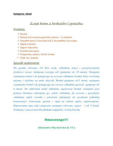 Kategoria: obiad Zupa krem z brokułów i groszku Produkty: Brokuł Świeży lub mrożony groszek zielony – ½ szklanki Kawałek piersi z kurczaka lub 2 skrzydełka z kurczaka Ząbek czosnku Jogurt naturalny Kromka pieczywa Przyprawy; pieprz, sól do smaku Zioła np.; bazylia Sposób wykonania: Do garnka wlewamy 3/4 litra wody, wkładamy mięso i przygotowujemy drobiowy wywar, dodajemy szczyptę soli (gotujemy ok. 20 minut). Następnie wyjmujemy mięso i do gotującego się wywaru wkładamy brokuł, który wcześniej myjemy i dzielimy na małe różyczki. Brokuł gotujemy ok.5 minut, następnie wyjmujemy brokuł i do gotującego się wywaru wkładamy groszek, gotujemy ok. 6 minut. Do oddzielnej miski wkładamy ugotowany brokuł, następnie przy pomocy blendera miksujemy go, całość wkładamy do wywaru z groszkiem, wkładamy ząbek czosnku i ponownie miksujemy do uzyskania jednolitej konsystencji. Ustawiamy garnek z zupą na małym ogniu, zagotowujemy. Doprawiamy zupę solą i pieprzem, następnie wlewamy jogurt Podajemy z pieczywem lub płatkami migdałów, świeżą bazylią. Smacznego!!! Aleksandra Męczkowska kl. VI a ( ok. 5 łyżek).