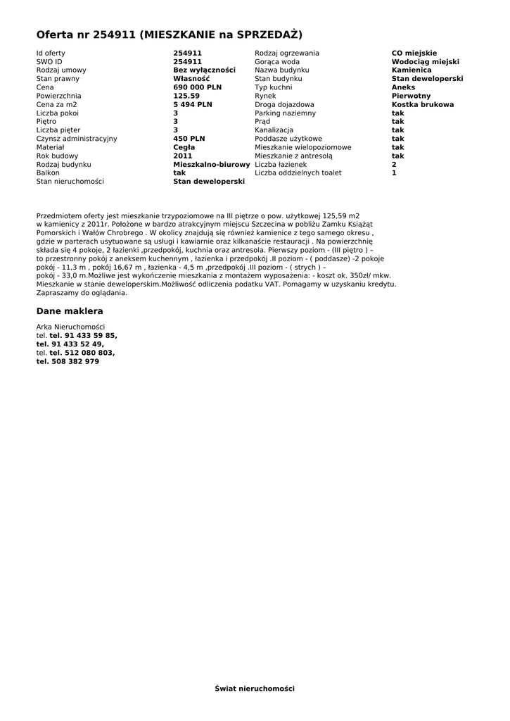 Oferta nr 254911 (MIESZKANIE na SPRZEDAŻ) Id oferty SWO ID Rodzaj umowy Stan prawny Cena Powierzchnia Cena za m2 Liczba pokoi Piętro Liczba pięter Czynsz administracyjny Materiał Rok budowy Rodzaj budynku Balkon Stan nieruchomości 254911 254911 Bez wyłączności Własność 690 000 PLN 125.59 5 494 PLN 3 3 3 450 PLN Cegła 2011 Mieszkalno-biurowy tak Stan deweloperski Rodzaj ogrzewania Gorąca woda Nazwa budynku Stan budynku Typ kuchni Rynek Droga dojazdowa Parking naziemny Prąd Kanalizacja Poddasze użytkowe Mieszkanie wielopoziomowe Mieszkanie z antresolą Liczba łazienek Liczba oddzielnych toalet CO miejskie Wodociąg miejski Kamienica Stan deweloperski Aneks Pierwotny Kostka brukowa tak tak tak tak tak tak 2 1 Przedmiotem oferty jest mieszkanie trzypoziomowe na III piętrze o pow. użytkowej 125,59 m2 w kamienicy z 2011r. Położone w bardzo atrakcyjnym miejscu Szczecina w pobliżu Zamku Książąt Pomorskich i Wałów Chrobrego . W okolicy znajdują się również kamienice z tego samego okresu , gdzie w parterach usytuowane są usługi i kawiarnie oraz kilkanaście restauracji . Na powierzchnię składa się 4 pokoje, 2 łazienki ,przedpokój, kuchnia oraz antresola. Pierwszy poziom - (III piętro ) – to przestronny pokój z aneksem kuchennym , łazienka i przedpokój .II poziom - ( poddasze) -2 pokoje pokój - 11,3 m , pokój 16,67 m , łazienka - 4,5 m ,przedpokój .III poziom - ( strych ) – pokój - 33,0 m.Możliwe jest wykończenie mieszkania z montażem wyposażenia: - koszt ok. 350zł/ mkw. Mieszkanie w stanie deweloperskim.Możliwość odliczenia podatku VAT. Pomagamy w uzyskaniu kredytu. Zapraszamy do oglądania. Dane maklera Arka Nieruchomości tel. tel. 91 433 59 85, tel. 91 433 52 49, tel. tel. 512 080 803, tel. 508 382 979 Świat nieruchomości Powered by TCPDF (www.tcpdf.org)