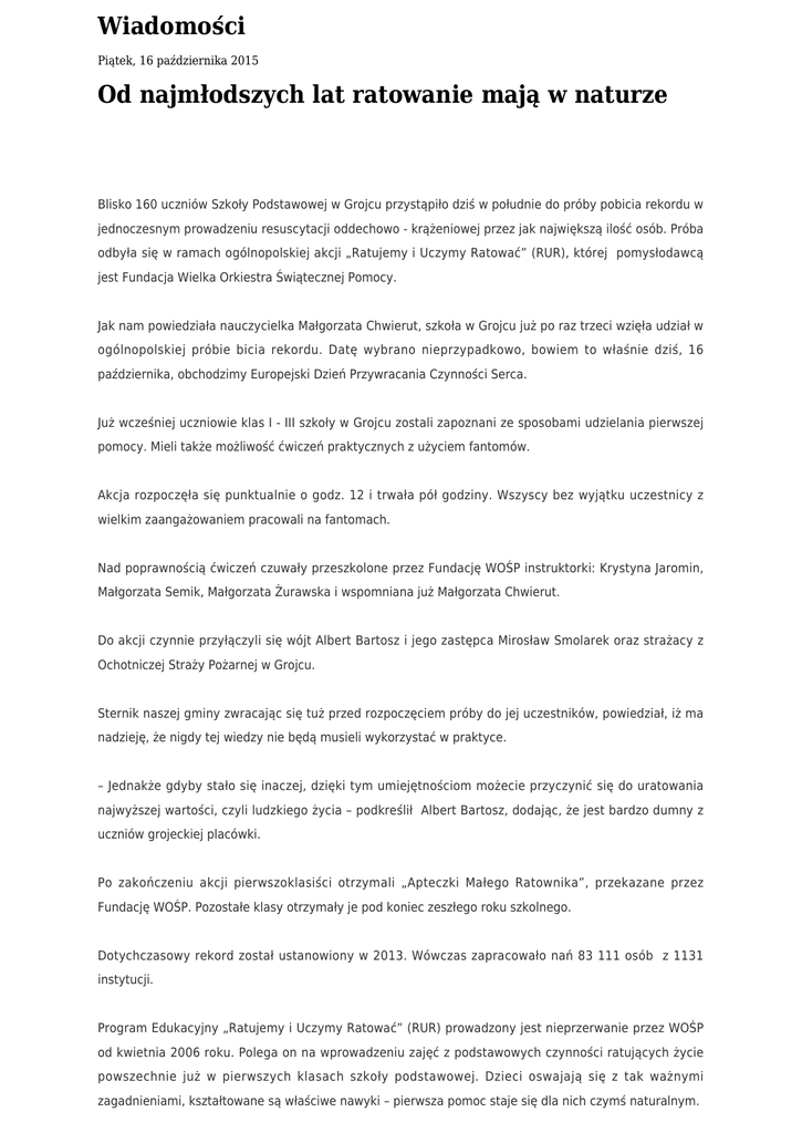Wiadomości Piątek, 16 października 2015 Od najmłodszych lat ratowanie mają w naturze Blisko 160 uczniów Szkoły Podstawowej w Grojcu przystąpiło dziś w południe do próby pobicia rekordu w jednoczesnym prowadzeniu resuscytacji oddechowo - krążeniowej przez jak największą ilość osób. Próba odbyła się w ramach ogólnopolskiej akcji „Ratujemy i Uczymy Ratować” (RUR), której pomysłodawcą jest Fundacja Wielka Orkiestra Świątecznej Pomocy. Jak nam powiedziała nauczycielka Małgorzata Chwierut, szkoła w Grojcu już po raz trzeci wzięła udział w ogólnopolskiej próbie bicia rekordu. Datę wybrano nieprzypadkowo, bowiem to właśnie dziś, 16 października, obchodzimy Europejski Dzień Przywracania Czynności Serca. Już wcześniej uczniowie klas I - III szkoły w Grojcu zostali zapoznani ze sposobami udzielania pierwszej pomocy. Mieli także możliwość ćwiczeń praktycznych z użyciem fantomów. Akcja rozpoczęła się punktualnie o godz. 12 i trwała pół godziny. Wszyscy bez wyjątku uczestnicy z wielkim zaangażowaniem pracowali na fantomach. Nad poprawnością ćwiczeń czuwały przeszkolone przez Fundację WOŚP instruktorki: Krystyna Jaromin, Małgorzata Semik, Małgorzata Żurawska i wspomniana już Małgorzata Chwierut. Do akcji czynnie przyłączyli się wójt Albert Bartosz i jego zastępca Mirosław Smolarek oraz strażacy z Ochotniczej Straży Pożarnej w Grojcu. Sternik naszej gminy zwracając się tuż przed rozpoczęciem próby do jej uczestników, powiedział, iż ma nadzieję, że nigdy tej wiedzy nie będą musieli wykorzystać w praktyce. – Jednakże gdyby stało się inaczej, dzięki tym umiejętnościom możecie przyczynić się do uratowania najwyższej wartości, czyli ludzkiego życia – podkreślił Albert Bartosz, dodając, że jest bardzo dumny z uczniów grojeckiej placówki. Po zakończeniu akcji pierwszoklasiści otrzymali „Apteczki Małego Ratownika”, przekazane przez Fundację WOŚP. Pozostałe klasy otrzymały je pod koniec zeszłego roku szkolnego. Dotychczasowy rekord został ustanowiony w 2013. Wówczas zapracowało nań 83 111 osób z 1131 instytucji. Program Edukacyjny „Ratujemy i Uczymy Ratować” (RUR) prowadzony jest nieprzerwanie przez WOŚP od kwietnia 2006 roku. Polega on na wprowadzeniu zajęć z podstawowych czynności ratujących życie powszechnie już w pierwszych klasach szkoły podstawowej. Dzieci oswajają się z tak ważnymi zagadnieniami, kształtowane są właściwe nawyki – pierwsza pomoc staje się dla nich czymś naturalnym. Do tej pory Programem zostało objętych 26 893 nauczycieli z 12 160 szkół. Stanowi to 91 proc. wszystkich szkół podstawowych w Polsce. Ponad 2 miliony dzieci uczy się podstaw pierwszej pomocy! Szkoły podstawowe przystąpiły do Programu dobrowolnie, a Fundacja Wielka Orkiestra Świątecznej Pomocy przekazała im bezpłatnie ponad 65 tys. fantomów do nauki resuscytacji, podręczniki, filmy i inne niezbędne materiały dydaktyczne. Oprócz tego WOŚP zrealizował szkolenia dla nauczycieli, aby pomóc im w przygotowaniu się do prowadzenia zajęć z dziećmi. Orkiestra dba o ciągłość prowadzenia Programu – współpracując z Ministerstwem Edukacji Narodowej oraz Ośrodkami Doskonalenia Nauczycieli. Cały czas prowadzi szkolenia dla nauczycieli i przekazujemy potrzebne dla kontynuacji Programu materiały. Dzięki tej wspólnej inicjatywie ponad 2 mln dzieci zna zasady pierwszej pomocy! Dzięki Fundacji WOŚP w Polsce nauka resuscytacji krążeniowo-oddechowej jest powszechna, bezpłatna i dostępna dla wszystkich dzieci.