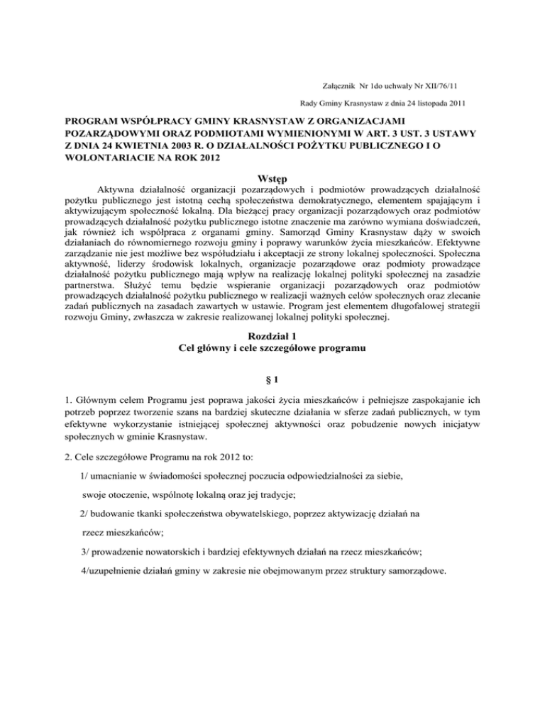 Załącznik Nr 1do uchwały Nr XII/76/11 Rady Gminy Krasnystaw z dnia 24 listopada 2011 PROGRAM WSPÓŁPRACY GMINY KRASNYSTAW Z ORGANIZACJAMI POZARZĄDOWYMI ORAZ PODMIOTAMI WYMIENIONYMI W ART. 3 UST. 3 USTAWY Z DNIA 24 KWIETNIA 2003 R. O DZIAŁALNOŚCI POŻYTKU PUBLICZNEGO I O WOLONTARIACIE NA ROK 2012 Wstęp Aktywna działalność organizacji pozarządowych i podmiotów prowadzących działalność pożytku publicznego jest istotną cechą społeczeństwa demokratycznego, elementem spajającym i aktywizującym społeczność lokalną. Dla bieżącej pracy organizacji pozarządowych oraz podmiotów prowadzących działalność pożytku publicznego istotne znaczenie ma zarówno wymiana doświadczeń, jak również ich współpraca z organami gminy. Samorząd Gminy Krasnystaw dąży w swoich działaniach do równomiernego rozwoju gminy i poprawy warunków życia mieszkańców. Efektywne zarządzanie nie jest możliwe bez współudziału i akceptacji ze strony lokalnej społeczności. Społeczna aktywność, liderzy środowisk lokalnych, organizacje pozarządowe oraz podmioty prowadzące działalność pożytku publicznego mają wpływ na realizację lokalnej polityki społecznej na zasadzie partnerstwa. Służyć temu będzie wspieranie organizacji pozarządowych oraz podmiotów prowadzących działalność pożytku publicznego w realizacji ważnych celów społecznych oraz zlecanie zadań publicznych na zasadach zawartych w ustawie. Program jest elementem długofalowej strategii rozwoju Gminy, zwłaszcza w zakresie realizowanej lokalnej polityki społecznej. Rozdział 1 Cel główny i cele szczegółowe programu §1 1. Głównym celem Programu jest poprawa jakości życia mieszkańców i pełniejsze zaspokajanie ich potrzeb poprzez tworzenie szans na bardziej skuteczne działania w sferze zadań publicznych, w tym efektywne wykorzystanie istniejącej społecznej aktywności oraz pobudzenie nowych inicjatyw społecznych w gminie Krasnystaw. 2. Cele szczegółowe Programu na rok 2012 to: 1/ umacnianie w świadomości społecznej poczucia odpowiedzialności za siebie, swoje otoczenie, wspólnotę lokalną oraz jej tradycje; 2/ budowanie tkanki społeczeństwa obywatelskiego, poprzez aktywizację działań na rzecz mieszkańców; 3/ prowadzenie nowatorskich i bardziej efektywnych działań na rzecz mieszkańców; 4/uzupełnienie działań gminy w zakresie nie obejmowanym przez struktury samorządowe. Rozdział 2 Zasady współpracy §2 Współpraca Gminy Krasnystaw z organizacjami pozarządowymi oraz podmiotami wymienionymi w art.3 ust. 3 ustawy realizowana jest w oparciu o zasady: pomocniczości, suwerenności stron, partnerstwa, efektywności, uczciwej konkurencji i jawności. Rozdział 3 Zakres przedmiotowy §3 Przedmiotem współpracy organów Gminy Krasnystaw z organizacjami pozarządowymi oraz podmiotami wymienionymi w art. 3 ust. 3 ustawy jest: 1/ podwyższanie efektywności działań kierowanych do mieszkańców gminy, 2/ tworzenie systemowych rozwiązań ważnych problemów społecznych, 3/ określanie potrzeb społecznych i sposobu ich zaspokajania, 4/ konsultowanie projektów aktów normatywnych w dziedzinach dotyczących działalności statutowej tych organizacji. Rozdział 4 Formy współpracy §4 1. Gmina Krasnystaw realizuje zadania publiczne we współpracy z organizacjami pozarządowymi oraz podmiotami wymienionymi w art. 3 ust. 3 ustawy. Współpraca ta może odbywać się w szczególności w formach: finansowej i pozafinansowej. 2. Współpraca w formie finansowej obejmuje w szczególności: 1/ zlecania organizacjom pozarządowym oraz podmiotom wymienionym w art. 3 ust. 3 ustawy realizację zadań publicznych poprzez: a/ powierzenie wykonania zadań publicznych wraz z udzieleniem dotacji na finansowanie ich realizacji, b/ wspieranie wykonywania zadań publicznych wraz z udzieleniem dotacji na dofinansowanie ich realizacji. 3. Współpraca w formie pozafinansowej obejmuje w szczególności: 1/ wzajemne informowanie się o planowanych kierunkach działalności i współdziałania w celu zharmonizowania tych kierunków poprzez: a/ publikowanie ważnych informacji na stronach internetowych Urzędu Gminy Krasnystaw oraz w BIP, b/ uzgadnianie kształtu listy zagadnień priorytetowych, spośród zadań publicznych określonych w art. 4 ust. 1 ustawy, c/ organizowanie spotkań, szkoleń, konferencji mających na celu podniesienie sprawności funkcjonowania organizacji, d/ utworzenie w razie potrzeby wspólnych zespołów o charakterze doradczym i inicjatywnym; 2/ udział w miarę możliwości organizacji pozarządowych oraz podmiotów wymienionych w art. 3 ust. 3 ustawy w działaniach programowych samorządu. §5 1. Zlecanie realizacji zadań publicznych organizacjom pozarządowym oraz podmiotom wymienionym w art. 3 ust. 3 ustawy obejmuje sferę zadań publicznych wymienionych w art. 4 ust. 1 ustawy, o ile są one zadaniami gminy, w pierwszej kolejności te zadania, które Program określa jako zadania priorytetowe i odbywa się po przeprowadzeniu otwartego konkursu ofert, chyba, że przepisy odrębne przewidują inny tryb zlecenia. 2. Otwarte konkursy ofert są ogłaszane i przeprowadzane w oparciu o przepisy ustawy i wydane na jej podstawie przepisy wykonawcze. Rozdział 5 Priorytetowe zadania publiczne §6 W roku 2012 Gmina Krasnystaw będzie wspierać lub powierzać organizacjom pozarządowym oraz podmiotom wymienionym w art.3 ust.3 ustawy realizację zadań w zakresie: 1/ wspierania i upowszechnienia kultury fizycznej poprzez: a/ upowszechnianie kultury fizycznej, w tym promowanie i prowadzenie sportowych szkoleń dzieci i młodzieży, udział w zawodach sportowych, b/ organizowanie imprez sportowo rekreacyjnych o charakterze masowym; c/ szkolenie i współzawodnictwo sportowe, szczególnie dzieci i młodzieży; 2/ przeciwdziałania uzależnieniom i patologiom społecznym poprzez: a/ prowadzenie działań związanych z profilaktyką zdrowotną i rozwiązywaniem problemów uzal