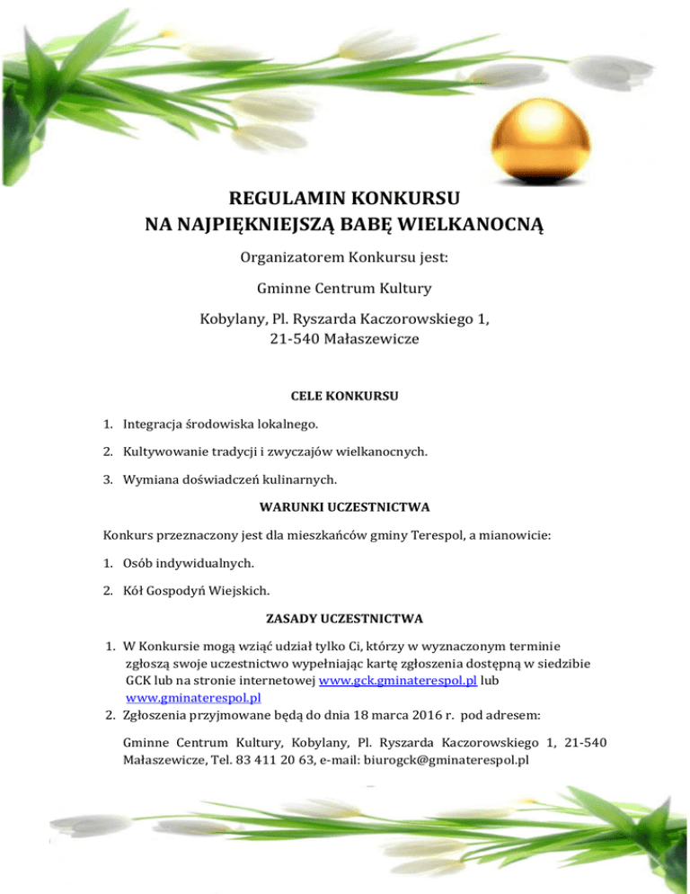 REGULAMIN KONKURSU NA NAJPIĘKNIEJSZĄ BABĘ WIELKANOCNĄ Organizatorem Konkursu jest: Gminne Centrum Kultury Kobylany, Pl. Ryszarda Kaczorowskiego 1, 21-540 Małaszewicze CELE KONKURSU 1. Integracja środowiska lokalnego. 2. Kultywowanie tradycji i zwyczajów wielkanocnych. 3. Wymiana doświadczeń kulinarnych. WARUNKI UCZESTNICTWA Konkurs przeznaczony jest dla mieszkańców gminy Terespol, a mianowicie: 1. Osób indywidualnych. 2. Kół Gospodyń Wiejskich. ZASADY UCZESTNICTWA 1. W Konkursie mogą wziąć udział tylko Ci, którzy w wyznaczonym terminie zgłoszą swoje uczestnictwo wypełniając kartę zgłoszenia dostępną w siedzibie GCK lub na stronie internetowej www.gck.gminaterespol.pl lub www.gminaterespol.pl 2. Zgłoszenia przyjmowane będą do dnia 18 marca 2016 r. pod adresem: Gminne Centrum Kultury, Kobylany, Pl. Ryszarda Kaczorowskiego 1, 21-540 Małaszewicze, Tel. 83 411 20 63, e-mail: [email protected] ZASADY KONKURSOWE 1. Zadanie konkursowe polega na wykonaniu Baby Wielkanocnej z zachowaniem tradycyjnej receptury. Głównym kryterium oceny wypieków będą: a) Walory estetyczne, b) Walory smakowe, c) Staranność wykonania, d) Pomysłowość, e) Nawiązanie do tradycji wielkanocnych. 2. Wypieki należy dostarczyć w dniu konkursu – 20 marca 2016 r. (niedziela) do godz. 13.00 do Sali konferencyjnej Urzędu Gminy Terespol, piętro II (Planowane rozpoczęcie konkursu o godz. 14.00). 3. Każdy z uczestników może zgłosić do konkursu tylko jeden wypiek. 4. Uczestnicy rywalizować będą w jednej kategorii ogólnej, w której przewidziano nagrody dla zdobywców trzech pierwszych miejsc. 5. Wszyscy uczestnicy Konkursu otrzymują dyplomy za udział w konkursie. 6. Oceny prezentowanych Dyrektora GCK. wypieków dokona komisja powołana przez 7. Lista laureatów i uczestników umieszczona zostanie na stronie internetowej www.gck.gminaterespol.pl , www.terespol.ug.gov.pl. 8. Zgłoszone do konkursu baby wielkanocne, które zdobędą I, II oraz III miejsce przechodzą na własność Organizatora i przeznaczone będą do degustacji dla uczestników konkursu i Kiermaszu Wielkanocnego. 9. Wszelkie informacje dotyczące Konkursu dostępne w siedzibie Gminnego Centrum Kultury lub pod nr telefonu 83 411 20 63, jak również na stronie internetowej: www.gck.gminaterespol.pl POSTANOWIENIA KOŃCOWE 1. Organizator zastrzega sobie prawo do nieodpłatnego wykorzystania wizerunku uczestników Konkursu oraz fotografii ich prac do celów promocyjnych i reklamowych gminy Terespol. 2. Zgłaszając swój udział w Konkursie, każdy uczestnik jednocześnie wyraża zgodę na przetwarzanie swoich danych osobowych przez organizatorów. 3. Wszelkie kwestie nie zawarte w regulaminie rozstrzyga Organizator. Wszystkich uczestników oraz przybyłych gości, Organizator zaprasza na Kiermasz Wielkanocny, który będzie trwał w trakcie konkursu oraz po jego zakończeniu.
