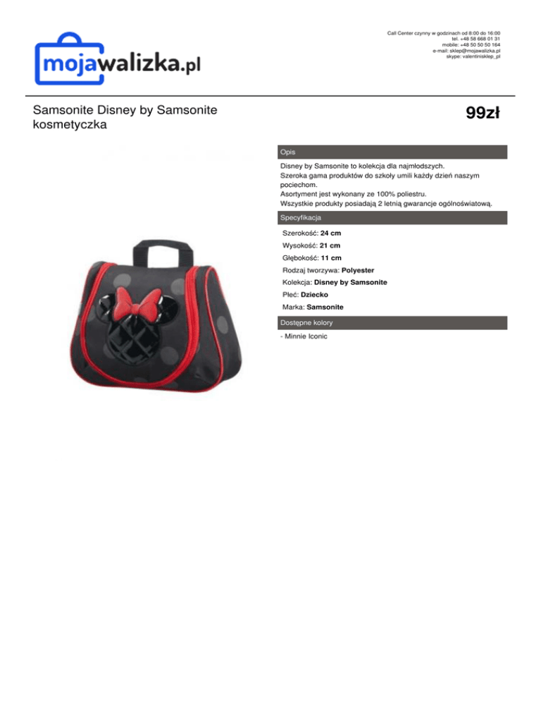 Call Center czynny w godzinach od 8:00 do 16:00 tel. +48 58 668 01 31 mobile: +48 50 50 50 164 e-mail: [email protected] skype: valentinisklep_pl 99zł Samsonite Disney by Samsonite kosmetyczka Opis Disney by Samsonite to kolekcja dla najmłodszych. Szeroka gama produktów do szkoły umili każdy dzień naszym pociechom. Asortyment jest wykonany ze 100% poliestru. Wszystkie produkty posiadają 2 letnią gwarancje ogólnoświatową. Specyfikacja Szerokość: 24 cm Wysokość: 21 cm Głębokość: 11 cm Rodzaj tworzywa: Polyester Kolekcja: Disney by Samsonite Płeć: Dziecko Marka: Samsonite Dostępne kolory - Minnie Iconic Powered by TCPDF (www.tcpdf.org)