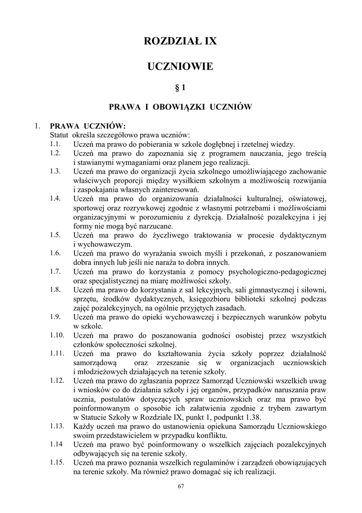 ROZDZIAŁ IX UCZNIOWIE §1 PRAWA I OBOWIĄZKI UCZNIÓW 1. PRAWA UCZNIÓW: Statut określa szczegółowo prawa uczniów: 1.1. Uczeń ma prawo do pobierania w szkole dogłębnej i rzetelnej wiedzy. 1.2. Uczeń ma prawo do zapoznania się z programem nauczania, jego treścią i stawianymi wymaganiami oraz planem jego realizacji. 1.3. Uczeń ma prawo do organizacji życia szkolnego umożliwiającego zachowanie właściwych proporcji między wysiłkiem szkolnym a możliwością rozwijania i zaspokajania własnych zainteresowań. 1.4. Uczeń ma prawo do organizowania działalności kulturalnej, oświatowej, sportowej oraz rozrywkowej zgodnie z własnymi potrzebami i możliwościami organizacyjnymi w porozumieniu z dyrekcją. Działalność pozalekcyjna i jej formy nie mogą być narzucane. 1.5. Uczeń ma prawo do życzliwego traktowania w procesie dydaktycznym i wychowawczym. 1.6. Uczeń ma prawo do wyrażania swoich myśli i przekonań, z poszanowaniem dobra innych lub jeśli nie naraża to dobra innych. 1.7. Uczeń ma prawo do korzystania z pomocy psychologiczno-pedagogicznej oraz specjalistycznej na miarę możliwości szkoły. 1.8. Uczeń ma prawo do korzystania z sal lekcyjnych, sali gimnastycznej i siłowni, sprzętu, środków dydaktycznych, księgozbioru biblioteki szkolnej podczas zajęć pozalekcyjnych, na ogólnie przyjętych zasadach. 1.9. Uczeń ma prawo do opieki wychowawczej i bezpiecznych warunków pobytu w szkole. 1.10. Uczeń ma prawo do poszanowania godności osobistej przez wszystkich członków społeczności szkolnej. 1.11. Uczeń ma prawo do kształtowania życia szkoły poprzez działalność samorządową oraz zrzeszanie się w organizacjach uczniowskich i młodzieżowych działających na terenie szkoły. 1.12. Uczeń ma prawo do zgłaszania poprzez Samorząd Uczniowski wszelkich uwag i wniosków co do działania szkoły i jej organów, przypadków naruszania praw ucznia, postulatów dotyczących spraw uczniowskich oraz ma prawo być poinformowanym o sposobie ich załatwienia zgodnie z trybem zawartym w Statucie Szkoły w Rozdziale IX, punkt 1, podpunkt 1.38. 1.13. Każdy uczeń ma prawo do ustanowienia opiekuna Samorządu Uczniowskiego swoim przedstawicielem w przypadku konfliktu. 1.14 Uczeń ma prawo być poinformowany o wszelkich zajęciach pozalekcyjnych odbywających się na terenie szkoły. 1.15. Uczeń ma prawo poznania wszelkich regulaminów i zarządzeń obowiązujących na terenie szkoły. Ma również prawo domagać się ich realizacji. 67 1.16. 1.17. 1.18. 1.19. Uczeń ma prawo do pomocy w uzyskaniu nadprogramowej wiedzy i pomocy w samokształceniu. Uczeń ma prawo do jawnej i umotywowanej oceny z zachowania postępów w nauce : a) na miesiąc przed śródrocznym i rocznym posiedzeniem Rady Pedagogicznej poszczególni nauczyciele mają obowiązek poinformowania ucznia oraz jego rodziców (prawnych opiekunów) o przewidywanych dla niego niedostatecznych ocenach klasyfikacyjnych, a na 7 dni przed posiedzeniem rady pedagogicznej o wszystkich przewidywanych ocenach końcoworocznych, b) uczeń i jego rodzice (prawni opiekunowie) mogą czynić starania o uzyskanie rocznej oceny klasyfikacyjnej wyższej niż przewidywana jeżeli spełnia warunku zawarte w rozdziale V Zasady oceniania wewnątrzszkolnego § 5, c) W przypadku czynienia starań o podwyższenie oceny zajęć edukacyjnych zainteresowany składa pisemną prośbę o przeprowadzenie egzaminu sprawdzającego na ręce dyrektora szkoły po podaniu przez nauczyciela do wiadomości przewidywanej rocznej oceny klasyfikacyjnej, nie później jednak ni z na 4 dni przed rocznym klasyfikacyjnym posiedzeniem Rady Pedagogicznej, d) Uczeń i jego rodzice mogą czynić starania o ustalenie rocznej oceny klasyfikacyjnej zachowania wyżej niż przewidywana, jeżeli spełnia warunki zwarte w rozdziale V Zasady oceniania wewnątrzszkolnego § 5. e) W przypadku czynieni starań o podwyższenie oceny z zachowania zainteresowany składa pisemną prośbę o ustalenie oceny wyższej niż przewidywana na ręce dyrektora szkoły po podaniu przez wychowawcę do wiadomości przewidywanej rocznej klasyfikacyjnej oceny zachowania, nie później jednak niż na 4 dni przed rocznym klasyfikacyjnym posiedzeniem Rady Pedagogicznej. f) ocena z przedmiotu może być wystawiona tylko za wiadomości i umiejętności ucznia, g) odpowiedź ucznia obejmująca materiał, który nie był przedmiotem lekcji, bądź nie był zadawany do opracowania w domu, może być oceniania tylko za zgodą ucznia, h) uczeń ma prawo do pełnej skali ocen i) uczeń ma prawo znać bieżące oceny, j) uczeń ma prawo do uzasadnienia oceny z pracy ustnej, Uczeń ma prawo być nieprzygotowany na pierwszych zajęciach po 5 dniowej, ciągłej nieobecności w szkole. Uczeń ma prawo zgłosić nieprzygotowanie na następujących zasadach: dwa nieprzygotowania (jedno w ciągu semestru), jeżeli są cztery godziny lekcyjne z danego przedmiotu lub mniej w ciągu jednego tygodnia, dwa nieprzygotowania (jedno w ciągu semestru) jeżeli ma 5 godzin zajęć zblokowanych np. technologia gastronomiczna, 4 nieprzygotowania w ciągu roku (dwa w ciągu semestru), jeżeli ma 5 i więcej godzin lekcyjnych z danego przedmiotu w ciągu jednego tygodnia, nieprzygotowanie obejmuje cały okres trwania zajęć lekcyjnych 68 z danego przedmiotu, w dniu w którym zostało zgłoszone, nieprzygotowanie jest zgłaszane bez podania przyczyny, po sprawdzeniu obecności przez nauczyciela, uczeń nieprzygotowany ma prawo nie posiadać zeszytu, a jego wiadomości mogą być poddawane ocenie tylko za jego zgodą, nieprzygotowanie nie może być zgłaszane w następujących przypadkach: - na zapowiedzianej co najmniej tydzień wcześniej lekcji powtórzeniowej oraz pracy klasowej, - przez ucznia, który zobowiązał się przygotować indywidualnie na daną lekcję pewną partię materiału. Uczeń ma prawo do jednego dnia bez oceny niedostatecznej – 13-ty każdego miesiąca. - tylko oceny pozytywne z 