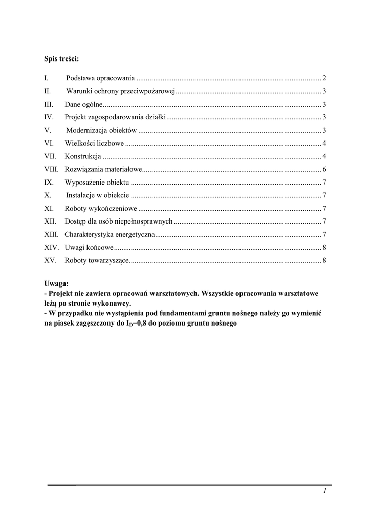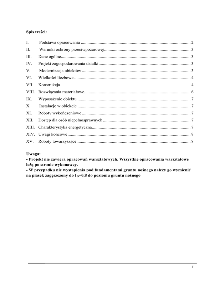 Spis treści: I. Podstawa opracowania ................................................................................................... 2 II. Warunki ochrony przeciwpożarowej .............................................................................. 3 III. Dane ogólne ..................................................................................................................... 3 IV. Projekt zagospodarowania działki ................................................................................... 3 V. Modernizacja obiektów .................................................................................................. 3 VI. Wielkości liczbowe ......................................................................................................... 4 VII. Konstrukcja ..................................................................................................................... 4 VIII. Rozwiązania materiałowe................................................................................................ 6 IX. Wyposażenie obiektu ...................................................................................................... 7 X. Instalacje w obiekcie ...................................................................................................... 7 XI. Roboty wykończeniowe .................................................................................................. 7 XII. Dostęp dla osób niepełnosprawnych ............................................................................... 7 XIII. Charakterystyka energetyczna ......................................................................................... 7 XIV. Uwagi końcowe ............................................................................................................... 8 XV. Roboty towarzyszące ....................................................................................................... 8 Uwaga: - Projekt nie zawiera opracowań warsztatowych. Wszystkie opracowania warsztatowe leżą po stronie wykonawcy. - W przypadku nie wystąpienia pod fundamentami gruntu nośnego należy go wymienić na piasek zagęszczony do ID=0,8 do poziomu gruntu nośnego 1 I. 1. 2. 3. 4. 5. 6. 7. 8. Podstawa opracowania Zlecenie Inwestora Inwentaryzacja obiektu Teatru przekazana przez Inwestora Mapa do celów projektowych opracowana przez ArtGeo Dokumentacja geologiczna opracowana przez „A.Gea” dr Agnieszkę Gontaszewską, Warunki medialne Warunki techniczne Aktualnie obowiązujące normy i przepisy Rozporządzenie Ministra Spraw Wewnętrznych i Administracji z dnia 16 czerwca 2003 r. w sprawie uzgadniania projektu budowlanego pod względem ochrony przeciwpożarowej [Dz. U. 2003, Nr 121, poz. 1137, zm. z 2009 r. Dz. U. Nr 119, poz. 998] 9. Rozporządzenie Ministra Spraw Wewnętrznych i Administracji z dnia 21 kwietnia 2006 r. w sprawie ochrony przeciwpożarowej, budynków, innych obiektów budowlanych i terenów [Dz. U. 2006, Nr 80, poz. 563] 10. Rozporządzenie Ministra Spraw Wewnętrznych i Administracji z dnia 24 lipca 2009 r. w sprawie przeciwpożarowego zaopatrzenia w wodę oraz dróg pożarowych [Dz. U. 2009, Nr 124, poz. 1030] 11. Rozporządzenie Ministra Infrastruktury z dnia 12 kwietnia 2002 r. w sprawie warunków technicznych, jakim powinny odpowiadać budynki i ich usytuowanie [Dz. U. 2002, Nr 75, poz. 690 z późniejszymi zmianami] 12. Wytyczne oceny odporności ogniowej elementów konstrukcji budowlanych – ITB 13. PN-B-02852:2001 „Ochrona przeciwpożarowa budynków. Obliczanie gęstości obciążenia ogniowego oraz wyznaczanie względnego czasu trwania pożaru.” 14. Wytyczne projektowania oświetlenia awaryjnego – SITP WP – 01:2006 15. Projektowanie i kontrola oświetlenia awaryjnego dróg ewakuacyjnych i oświetlenia bezpieczeństwa – Wacław Cholewa – Poradnik 16. PN - 92/N - 012561 „Znaki bezpieczeństwa. Ochrona przeciwpożarowa.” 17. PN - 92/N - 012562 „Znaki bezpieczeństwa. Ewakuacja.” 18. PN-N-01256-4 „Znaki bezpieczeństwa. Techniczne środki przeciwpożarowe.” 19. PN-N-01256-5 „Znaki bezpieczeństwa. Zasady umieszczania znaków bezpieczeństwa na drogach ewakuacyjnych i drogach pożarowych.” 20. PN–86/E-05003/01 „Ochrona odgromowa obiektów budowlanych. Wymagania ogólne.” 21. PN – IEC 61024-1-1:2001. „Ochrona odgromowa obiektów budowlanych. Zasady ogólne. Wybór poziomów ochrony dla urządzeń piorunochronnych.” 22. PN-EN 671-1:1999 „Stałe urządzenia gaśnicze. Hydranty wewnętrzne. Hydranty wewnętrzne z wężem półsztywnym.” 23. PN-EN 1838:2005 Zastosowanie oświetlenia. Oświetlenie awaryjne. 24. Rozporządzenie Ministra Spraw Wewnętrznych i Administracji z dnia 21 kwietnia 2006 r. w sprawie ochrony przeciwpożarowej, budynków, innych obiektów budowlanych i terenów 2 Warunki ochrony przeciwpożarowej Projektowana winda techniczna, jako urządzenie techniczne do transportu rekwizytów teatralnych dla Teatru nie będzie przeznaczona do transportu ludzi. Windę techniczną przyścienną zaliczono do kat. Zagrożenia ludzi ZL IV i nie jest zagrożona wybuchem. Wymagana klasa odporności ogniowej „D” – elementy windy powinny spełniać wymagania tej klasy. III. Dane ogólne Przedmiotem opracowania jest projekt budowy windy przyściennej w południowo wschodniej części budynku Teatru lubuskiego. Projektowana winda to obiekt prostokątny o wysokości 16,52 m niepodpiwniczony, kryty dachem płaskim. IV. Projekt zagospodarowania działki 1. Opis sytuacji – terenu – stan istniejący Lokalizację inwestycji stanowi teren w Zielonej Górze w południowowschodniej części budynku Teatru Lubuskiego, wjazd na teren działki znajduje się w północnej jej części. Powierzchnia terenu w granicach inwestycji posiada ukształtowanie z deniwelacją rzędu 0,2 m z obniżeniem terenu w kierunku północnym. Powierzchnię terenu stanowi w większości teren utwardzony, na terenie działki nie występują d