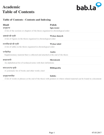 Academic Table of Contents Table of Contents - Contents and Indexing Hindi Polish अनुक्रम Spis treści A list of the sections or chapters of the thesis organized in chronological order आंकड़ों की सूची Wykaz danych A list of figures in the thesis organized in chronological order तालिकाओं की सूची Wykaz tabel A list of tables in the thesis organized in chronological order परिशिष्ट Aneks Supplementary material that is collected and attached at the end of the thesis शब्दावली Słowniczek An alphabetical list of technical terms with their definitions संदर्भग्रंथ सूची A systematic list of books and other works cited Bibliografia अनुक्रमणिका Indeks A list of words or phrases at the end of the thesis with pointers to where related material can be found in a document Page 1 Powered by TCPDF (www.tcpdf.org) 07.03.2017