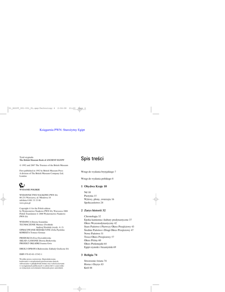 01_EGIPT_001-031_PL.qxp:Technology 4 2-04-08 21:20 Page 4 Księgarnia PWN: Starożytny Egipt Tytuł oryginału The British Museum Book of ANCIENT EGYPT Spis treści © 1992 and 2007 The Trustees of the British Museum First published in 1992 by British Museum Press A division of The British Museum Company Ltd, London Wstęp do wydania brytyjskiego 7 Wstęp do wydania polskiego 8 1 Obydwa Kraje 10 WYDANIE POLSKIE WYDAWNICTWO NAUKOWE PWN SA 00-251 Warszawa, ul. Miodowa 10 infolinia 0 801 33 33 88 www.pwn.pl Copyright © for the Polish edition by Wydawnictwo Naukowe PWN SA, Warszawa 2008 Polish Translation © 2008 Wydawnictwo Naukowe PWN SA WYDAWCA Dorota Szatańska TŁUMACZENIE Mariusz Zwoliński Andrzej Niwiński (rozdz. 4 i 5) OPRACOWANIE REDAKCYJNE Zofia Pęzińska KOREKTA Tomasz Gronau PRODUKCJA Ewa Oszwałdowska SKŁAD i ŁAMANIE Dorota Borkowska PROJEKT OKŁADKI Joanna Gwis DRUK I OPRAWA Białostockie Zakłady Graficzne SA ISBN 978-83-01-15542-1 Wszelkie prawa zastrzeżone. Reprodukowanie, kodowanie w urządzeniach przetwarzania danych, odtwarzanie w jakiejkolwiek formie oraz wykorzystywanie w wystąpieniach publicznych w całości lub w części tylko za wyłącznym zezwoleniem właściciela praw autorskich. Nil 10 Pustynia 15 Wylewy, plony, zwierzęta 16 Społeczeństwo 24 2 Zarys historii 32 Chronologia 32 Epoka kamienna i kultury predynastyczne 37 Okres Wczesnodynastyczny 42 Stare Państwo i Pierwszy Okres Przejściowy 43 Średnie Państwo i Drugi Okres Przejściowy 47 Nowe Państwo 51 Trzeci Okres Przejściowy 57 Okres Późny 60 Okres Ptolemejski 64 Egipt rzymski i bizantyński 69 3 Religia 74 Stworzenie świata 74 Horus i Ozyrys 83 Król 88 01_EGIPT_001-031_PL.qxp:Technology 4 2-04-08 21:20 Kult świątynny i święta 96 Page 5 7 Technika 222 Amon i Aton 103 Modlitwa i przeciwdzialanie życiowym kryzysom 108 4 Wierzenia pozagrobowe i zwyczaje pogrzebowe 114 Mumifikacja 114 Amulety i wyposażenie grobowe 124 Teksty grobowe 129 Trumny i sarkofagi 135 Groby prywatne 149 Grobowce królewskie 153 5 Język i piśmiennictwo 158 Ponowne odkrycie Egiptu i odczytanie hieroglifów 167 Piśmiennictwo 175 Rachunki, sprawozdania, oficjalne dokumenty i listy 194 6 Sztuka i architektura 202 Sztuka Okresu Predynastycznego 202 Sztuka Egiptu faraonów 204 Architektura 216 Pozyskiwanie kamienia 222 Górnictwo metali 225 Wyroby z metali 228 Biżuteria 234 Naczynia kamienne 239 Naczynia ceramiczne 240 Terakota 242 Fajans i kamienie glazurowane 243 Szkło 245 Stolarstwo 248 Wyroby z kości słoniowej 253 Wyroby włókiennicze 254 Plecionkarstwo 259 8 Egipt i jego sąsiedzi 260 Egipt i północ 260 Egipt i Azja 266 Egipt i jego zachodni sąsiedzi 272 Kraina Punt 273 Egipt i Nubia 274 Lista dynastii 296 Imiona najważniejszych królów Egiptu 300 Literatura uzupełniająca 309 Źródła ilustracji 311 Indeks 312