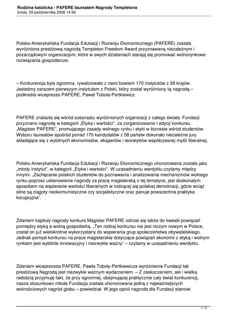 Rodzina katolicka - PAFERE laureatem Nagrody Templetona środa, 29 października 2008 14:36 Polsko-Amerykańska Fundacja Edukacji i Rozwoju Ekonomicznego (PAFERE) została wyróżniona prestiżową nagrodą Templeton Freedom Award przyznawaną niezależnym i pozarządowym organizacjom, które w swych działaniach starają się promować wolnorynkowe rozwiązania gospodarcze. – Konkurencja była ogromna, rywalizowało z nami bowiem 170 instytutów z 58 krajów. Jesteśmy zarazem pierwszym instytutem z Polski, który został wyróżniony tą nagrodą – podkreśla wiceprezes PAFERE, Paweł Toboła-Pertkiewicz. PAFERE znalazła się wśród szesnastu wyróżnionych organizacji z całego świata. Fundacji przyznano nagrodę w kategorii „Etyka i wartości”, za zorganizowanie I edycji konkursu „Magister PAFERE”, promującego zasady wolnego rynku i etyki w biznesie wśród studentów. Wyboru laureatów spośród ponad 170 kandydatów z 58 państw dokonało niezależne jury składające się z wybitnych ekonomistów, ekspertów i teoretyków współczesnej myśli liberalnej. Polsko-Amerykańska Fundacja Edukacji i Rozwoju Ekonomicznego uhonorowana została jako „młody instytut”, w kategorii „Etyka i wartości”. W uzasadnieniu werdyktu czytamy między innymi: „Zachęcanie polskich studentów do poznawania i analizowania mechanizmów wolnego rynku poprzez ustanowienie nagrody za pracę magisterską o tej tematyce, jest doskonałym sposobem na wspieranie wartości liberalnych w rodzącej się polskiej demokracji, gdzie wciąż silne są ciągoty neokomunistyczne czy socjalistyczne oraz panuje powszechna praktyka korupcyjna”. Zdaniem kapituły nagrody konkurs Magister PAFERE odnosi się także do kwestii powiązań pomiędzy etyką a wolną gospodarką. „Ten rodzaj konkursu nie jest niczym nowym w Polsce, został on już wielokrotnie wykorzystany do wspierania grup społeczeństwa obywatelskiego. Jednak pomysł konkursu na prace magisterskie dotyczące powiązań ekonomii z etyką i wolnym rynkiem jest wybitnie innowacyjny i niezwykle ważny” – czytamy w uzasadnieniu werdyktu. Zdaniem wiceprezesa PAFERE, Pawła Toboły-Pertkiewicza wyróżnienie Fundacji tak prestiżową Nagrodą jest niezwykle ważnym wydarzeniem. – Z zaskoczeniem, ale i wielką radością przyjmuję fakt, że przy ogromnej, obejmującej praktycznie cały świat konkurencji, nasza stosunkowo młoda Fundacja została uhonorowana jedną z najważniejszych wolnościowych nagród globu – powiedział. W jego opinii nagroda dla Fundacji stanowi 1/2 Rodzina katolicka - PAFERE laureatem Nagrody Templetona środa, 29 października 2008 14:36 potwierdzenie, i to ze strony grona najszacowniejszych ekspertów, że droga i cele, które obrała PAFERE przyczyniają się realnie do promowania idei wolności gospodarczej. – Jest ona bardzo potrzebna także Polsce – podkreślił. – Mam nadzieję, że to zaszczytne wyróżnienie zmotywuje nas do jeszcze wytrwalszej pracy nad realizacją tego wielkiego celu i pomoże znaleźć nowych partnerów w tym zadaniu – dodaje Toboła-Pertkiewicz. Gala wręczenia Nagród tradycyjnie odbędzie się podczas dorocznego Atlas Freedom Dinner w Renaissance Mayflower Hotel w Waszyngtonie, 13 listopada. Wezmą w niej udział między innymi założyciel i prezes PAFERE, Jan Michał Małek mieszkający na co dzień w Kalifornii oraz reprezentujący nasz kraj wiceprezes Paweł Toboła-Pertkiewicz. Nosząca nazwisko Sir Johna Templetona, zmarłego niedawno biznesmena i filantropa Nagroda, ustanowiona została w roku 2003 celem corocznego uhonorowywania niezależnych i pozarządowych organizacji, które w swych działaniach starają się przybliżać i wyjaśniać ludziom sens i znaczenie wolności oraz promować wolnorynkowe rozwiązania gospodarcze. Przyznawana jest w kilkunastu kategoriach, takich jak „Wolnorynkowa odpowiedź na ubóstwo”, „Public relations”, „Etyka i wartości” czy „Aktywność studencka”, a jej wartość finansowa wynosi 10 tysięcy dolarów. Każda kategoria obejmuje dwóch laureatów: podmiot istniejący od co najmniej ośmiu lat oraz instytucję nową, która dopiero rozpoczyna swoją działalność (mniej niż pięć lat istnienia). Uroczystość wręczenia nagród organizuje amerykańska Fundacja ATLAS. Polsko-Amerykańska Fundacja Edukacji i Rozwoju Ekonomicznego (PAFERE) jest niezależną, pozarządową organizacją zajmującą się wolnorynkową edukacją ekonomiczną oraz promocją wolności gospodarczej i wolnego handlu. Interesuje się związkami etyki z ekonomią i rozwojem nauk ekonomicznych. Fundacja została założona w roku 2007 przez prywatnego przedsiębiorcę Jana Michała Małka, na stałe mieszkającego w Stanach Zjednoczonych. Wcześniej działała jako oddział amerykańskiej Fundacji PAFERE Pro Publico Bono, założonej w 2000 roku w Kalifornii. Piotr Toboła-Pertkiewicz Za: PiotrSkarga.pl 2/2