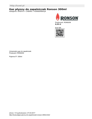 http://luxel.pl Gaz płynny do zapalniczek Ronson 300ml kategoria: OFERTA > CHEMIA > KONSERWACJA Producent: RONSON 8,50 zł Kod QR: Uniwersalny gaz do zapalniczek Producent: RONSON Pojemno??: 300ml strona: 1/3 wydrukowano: 07-03-2017 http://luxel.pl/gaz-plynny-do-zapalniczek-ronson-300ml.html strona: 2/3 wydrukowano: 07-03-2017 http://luxel.pl/gaz-plynny-do-zapalniczek-ronson-300ml.html strona: 3/3 wydrukowano: 07-03-2017 http://luxel.pl/gaz-plynny-do-zapalniczek-ronson-300ml.html