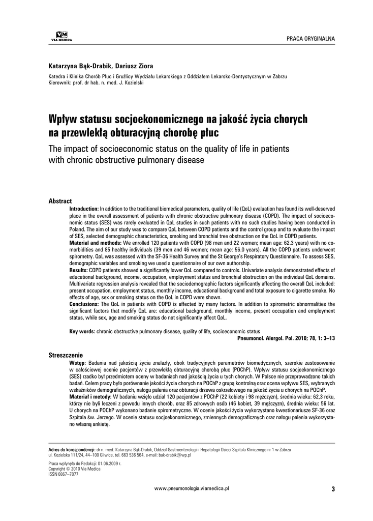 PRACA ORYGINALNA Katarzyna Bąk-Drabik, Dariusz Ziora Katedra i Klinika Chorób Płuc i Gruźlicy Wydziału Lekarskiego z Oddziałem Lekarsko-Dentystycznym w Zabrzu Kierownik: prof. dr hab. n. med. J. Kozielski Wpływ statusu socjoekonomicznego na jakość życia chorych na przewlekłą obturacyjną chorobę płuc The impact of socioeconomic status on the quality of life in patients with chronic obstructive pulmonary disease Abstract Introduction: In addition to the traditional biomedical parameters, quality of life (QoL) evaluation has found its well-deserved place in the overall assessment of patients with chronic obstructive pulmonary disease (COPD). The impact of socioeconomic status (SES) was rarely evaluated in QoL studies in such patients with no such studies having been conducted in Poland. The aim of our study was to compare QoL between COPD patients and the control group and to evaluate the impact of SES, selected demographic characteristics, smoking and bronchial tree obstruction on the QoL in COPD patients. Material and methods: We enrolled 120 patients with COPD (98 men and 22 women; mean age: 62.3 years) with no comorbidities and 85 healthy individuals (39 men and 46 women; mean age: 56.0 years). All the COPD patients underwent spirometry. QoL was assessed with the SF-36 Health Survey and the St George’s Respiratory Questionnaire. To assess SES, demographic variables and smoking we used a questionnaire of our own authorship. Results: COPD patients showed a significantly lower QoL compared to controls. Univariate analysis demonstrated effects of educational background, income, occupation, employment status and bronchial obstruction on the individual QoL domains. Multivariate regression analysis revealed that the sociodemographic factors significantly affecting the overall QoL included: present occupation, employment status, monthly income, educational background and total exposure to cigarette smoke. No effects of age, sex or smoking status on the QoL in COPD were shown. Conclusions: The QoL in patients with COPD is affected by many factors. In addition to spirometric abnormalities the significant factors that modify QoL are: educational background, monthly income, present occupation and employment status, while sex, age and smoking status do not significantly affect QoL. Key words: chronic obstructive pulmonary disease, quality of life, socioeconomic status Pneumonol. Alergol. Pol. 2010; 78, 1: 3–13 Streszczenie Wstęp: Badania nad jakością życia znalazły, obok tradycyjnych parametrów biomedycznych, szerokie zastosowanie w całościowej ocenie pacjentów z przewlekłą obturacyjną chorobą płuc (POChP). Wpływ statusu socjoekonomicznego (SES) rzadko był przedmiotem oceny w badaniach nad jakością życia u tych chorych. W Polsce nie przeprowadzono takich badań. Celem pracy było porównanie jakości życia chorych na POChP z grupą kontrolną oraz ocena wpływu SES, wybranych wskaźników demograficznych, nałogu palenia oraz obturacji drzewa oskrzelowego na jakość życia u chorych na POChP. Materiał i metody: W badaniu wzięło udział 120 pacjentów z POChP (22 kobiety i 98 mężczyzn), średnia wieku: 62,3 roku, którzy nie byli leczeni z powodu innych chorób, oraz 85 zdrowych osób (46 kobiet, 39 mężczyzn), średnia wieku: 56 lat. U chorych na POChP wykonano badanie spirometryczne. W ocenie jakości życia wykorzystano kwestionariusze SF-36 oraz Szpitala św. Jerzego. W ocenie statusu socjoekonomicznego, zmiennych demograficznych oraz nałogu palenia wykorzystano własną ankietę. Adres do korespondencji: dr n. med. Katarzyna Bąk-Drabik, Oddział Gastroenterologii i Hepatologii Dzieci Szpitala Klinicznego nr 1 w Zabrzu ul. Kozielska 111/24, 44–100 Gliwice, tel. 663 536 564, e-mail: [email protected] Praca wpłynęła do Redakcji: 01.06.2009 r. Copyright © 2010 Via Medica ISSN 0867–7077 www.pneumonologia.viamedica.pl 3 Pneumonologia i Alergologia Polska 2010, tom 78, nr 1, strony 3–13 Wyniki: Chorzy na POChP wykazywali istotnie niższą jakość życia w porównaniu z grupą kontrolną. Wykorzystując analizę jednoczynnikową wykazano wpływ wykształcenia, dochodu, wykonywanego zawodu, statusu zatrudnienia oraz obturacji drzewa oskrzelowego na poszczególne domeny jakości życia. W analizie regresji wielokrotnej czynnikami socjodemograficznymi istotnie wpływającymi na ogólną jakość życia są: wykonywany zawód, zatrudnienie, dochód miesięczny, wykształcenie oraz całkowita ekspozycja na dym tytoniowy. Nie wykazano wpływu wieku, płci oraz statusu palenia na jakość życia w POChP. Wnioski: Na jakość życia chorych na POChP wpływa wiele czynników. Oprócz zaburzeń spirometrycznych istotnymi czynnikami modyfikującymi jakość życia są: wykształcenie, miesięczny dochód, wykonywany zawód oraz status zatrudnienia, natomiast płeć, wiek oraz status palenia nie mają istotnego wpływu na jakość życia. Słowa kluczowe: przewlekła obturacyjna choroba płuc, jakość życia, status socjoekonomiczny Pneumonol. Alergol. Pol. 2010; 78, 1: 3–13 Wstęp W leczeniu pacjentów z przewlekłą obturacyjną chorobą płuc (POChP) istotne jest nie tylko łagodzenie objawów choroby, zapobieganie zaostrzeniom, zmniejszenie śmiertelności, zapobieganie powikłaniom i zwolnienie postępu choroby, ale także poprawa ogólnego stanu zdrowia, nastroju i zapewnienie maksymalnie długo sprawności psychofizycznej czy aktywności zawodowej chorych. W związku z tym obok tradycyjnych parametrów biomedycznych w całościowej ocenie chorych na POChP szerokie zastosowanie znalazły badania jakości życia. Jakość życia (QoL, quality of life) określana jest jako indywidualny sposób spostrzegania przez jednostkę jej pozycji życiowej w kontekście kulturowym, systemie wartości oraz w odniesieniu do jej zadań, oczekiwań i uwarunkowań środowiskowych [1, 2]. Potocznie QoL jest ujmowana jako poczucie zadowolenia, stopień pomyślności 