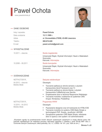 Paweł Ochota www.pawelochota.pl — DANE OSOBOWE Imię i nazwisko Paweł Ochota Data urodzenia 15.11.1989 r. Adres ul. Grunwaldzka 278/88, 43-600 Jaworzno Telefon 660-674-049 E-mail [email protected] — WYKSZTAŁCENIE 10.2011 – obecnie Studia magisterskie Uniwersytet Śląski, Wydział Informatyki i Nauki o Materiałach Sosnowiec Kierunek: Informatyka 10.2008 – 06.2011 Studia licencjackie Uniwersytet Śląski, Wydział Informatyki i Nauki o Materiałach Sosnowiec Kierunek: Informatyka — DOŚWIADCZENIE NETFACTOR.PL Stażysta webdeveloper 04.2012 – obecnie Bielsko-Biała Obowiązki: Tworzenie aplikacji po stronie serwera z użyciem frameworków Zend Framework oraz Yii Tworzenie aplikacji po stronie klienta z użyciem frameworków CoffeeScript oraz Sencha Projektowanie stron w technice Responsive Webdesign Tworzenie modułów i szablonów do systemów CMS: Drupal, Wordpress, PrestaShop NETFACTOR.PL Programista WWW 10.2010 – 04.2012 Bielsko-Biała Obowiązki: Poprawianie designów oraz ich kodowanie do HTML/CSS Tworzenie modułów do systemu CMS Made Simple w technologiach PHP, Smarty, JavaScript i ADODB Zarządzanie systemem CMS Made Simple, wdrażanie stron w oparciu o ten system i ich administrowanie „Wyrażam zgodę na przetwarzanie moich danych osobowych zawartych w mojej ofercie pracy dla potrzeb niezbędnych do realizacji procesu rekrutacji (zgodnie z Ustawą z dnia 29.08.1997 roku o Ochronie Danych Osobowych; tekst jednolity: Dz. U. z 2002r. Nr 101, poz. 926 ze zm.).” Strona 1 z 2 — UMIEJĘTNOŚCI Technologie Front-End JavaScript / DOM / Ajax CSS 2.1 / CSS 3 HTML5 / XHTML / XML ASP.NET Web Forms Java NetBeans Aptana Studio Smarty CoffeeScript Zend Framework Yii Adobe Illustrator CS3 Expression Blend 4 Windows Phone 7 Technologie Back-End PHP 5 / MySQL Pozostałe języki programowania C# / XAML Środowiska programistyczne Visual Studio 2010 Biblioteki/Frameworki jQuery / jQuery UI Sencha Copperlicht Programy graficzne Adobe Photoshop CS3 Systemy mobilne BlackBerry Playbook OS Pozostałe Tworzenie stron zgodnych ze standardami W3C, znajomość różnic w implementacji poszczególnych elementów w przeglądarkach, nowych trendów internetowych Znajomość dobrych wzorców pisania w języku JavaScript Znajomość systemów CMS: CMS Made Simple, Drupal, Wordpress, PrestaShop, phpBB Tworzenie grafiki wektorowej, prostych logotypów, rysunków i projektów witryn Znajomość metodyki XP Podstawowa znajomość zagadnień sieciowych oraz języka C Znajomość systemu Windows w stopniu bardzo dobrym i systemu Linux w stopniu dobrym Umiejętność współpracy w grupie, łatwość w nawiązywaniu kontaktów Punktualność, konsekwentność w działaniu, zaangażowanie w każdy projekt — JĘZYKI OBCE Język angielski Poziom komunikatywny — ZAINTERESOWANIA Nowe technologie, dobry film, muzyka z dawnych lat, literatura fantasy, rozwój osobisty, długie spacery „Wyrażam zgodę na przetwarzanie moich danych osobowych zawartych w mojej ofercie pracy dla potrzeb niezbędnych do realizacji procesu rekrutacji (zgodnie z Ustawą z dnia 29.08.1997 roku o Ochronie Danych Osobowych; tekst jednolity: Dz. U. z 2002r. Nr 101, poz. 926 ze zm.).” Strona 2 z 2