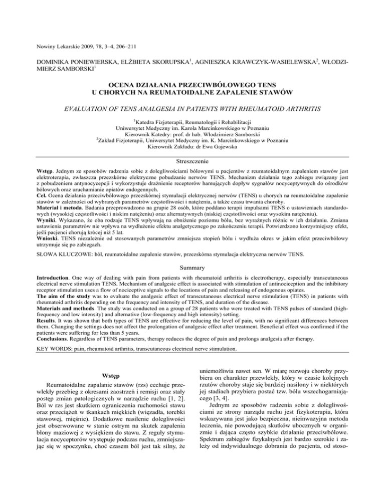 Nowiny Lekarskie 2009, 78, 3–4, 206–211 DOMINIKA PONIEWIERSKA, ELŻBIETA SKORUPSKA1, AGNIESZKA KRAWCZYK-WASIELEWSKA2, WŁODZIMIERZ SAMBORSKI1 OCENA DZIAŁANIA PRZECIWBÓLOWEGO TENS U CHORYCH NA REUMATOIDALNE ZAPALENIE STAWÓW EVALUATION OF TENS ANALGESIA IN PATIENTS WITH RHEUMATOID ARTHRITIS 1 Katedra Fizjoterapii, Reumatologii i Rehabilitacji Uniwersytet Medyczny im. Karola Marcinkowskiego w Poznaniu Kierownik Katedry: prof. dr hab. Włodzimierz Samborski 2 Zakład Fizjoterapii, Uniwersytet Medyczny im. K. Marcinkowskiego w Poznaniu Kierownik Zakładu: dr Ewa Gajewska Streszczenie Wstęp. Jednym ze sposobów radzenia sobie z dolegliwościami bólowymi u pacjentów z reumatoidalnym zapaleniem stawów jest elektroterapia, zwłaszcza przezskórne elektryczne pobudzanie nerwów TENS. Mechanizm działania tego zabiegu związany jest z pobudzeniem antynocycepcji i wykorzystuje drażnienie receptorów hamujących dopływ sygnałów nocyceptywnych do ośrodków bólowych oraz uruchamianie opiatów endogennych. Cel. Ocena działania przeciwbólowego przezskórnej stymulacji elektrycznej nerwów (TENS) u chorych na reumatoidalne zapalenie stawów w zależności od wybranych parametrów częstotliwości i natężenia, a także czasu trwania choroby. Materiał i metoda. Badania przeprowadzono na grupie 28 osób, które poddano terapii impulsami TENS o ustawieniach standardowych (wysokiej częstotliwości i niskim natężeniu) oraz alternatywnych (niskiej częstotliwości oraz wysokim natężeniu). Wyniki. Wykazano, że oba rodzaje TENS wpływają na obniżenie poziomu bólu, bez wyraźnych różnic w ich działaniu. Zmiana ustawienia parametrów nie wpływa na wydłużenie efektu analgetycznego po zakończeniu terapii. Potwierdzono korzystniejszy efekt, jeśli pacjenci chorują krócej niż 5 lat. Wnioski. TENS niezależnie od stosowanych parametrów zmniejsza stopień bólu i wydłuża okres w jakim efekt przeciwbólowy utrzymuje się po zabiegach. SŁOWA KLUCZOWE: ból, reumatoidalne zapalenie stawów, przezskórna stymulacja elektryczna nerwów TENS. Summary Introduction. One way of dealing with pain from patients with rheumatoid arthritis is electrotherapy, especially transcutaneous electrical nerve stimulation TENS. Mechanism of analgesic effect is associated with stimulation of antinociception and the inhibitory receptor stimulation uses a flow of nociceptive signals to the locations of pain and releasing of endogenous opiates. The aim of the study was to evaluate the analgesic effect of transcutaneous electrical nerve stimulation (TENS) in patients with rheumatoid arthritis depending on the frequency and intensity of TENS, and duration of the disease. Materials and methods. The study was conducted on a group of 28 patients who were treated with TENS pulses of standard (highfrequency and low intensity) and alternative (low-frequency and high intensity) setting. Results. It was shown that both types of TENS are effective for reducing the level of pain, with no significant differences between them. Changing the settings does not affect the prolongation of analgesic effect after treatment. Beneficial effect was confirmed if the patients were suffering for less than 5 years. Conclusions. Regardless of TENS parameters, therapy reduces the degree of pain and prolongs analgesia after therapy. KEY WORDS: pain, rheumatoid arthritis, transcutaneous electrical nerve stimulation. Wstęp Reumatoidalne zapalanie stawów (rzs) cechuje przewlekły przebieg z okresami zaostrzeń i remisji oraz stały postęp zmian patologicznych w narządzie ruchu [1, 2]. Ból w rzs jest skutkiem ograniczenia ruchomości stawu oraz przeciążeń w tkankach miękkich (więzadła, torebki stawowej, mięśnie). Dodatkowe nasilenie dolegliwości jest obserwowane w stanie ostrym na skutek zapalenia błony maziowej z wysiękiem do stawu. Z reguły stymulacja nocyceptorów występuje podczas ruchu, zmniejszając się w spoczynku, choć czasem ból jest tak silny, że uniemożliwia nawet sen. W miarę rozwoju choroby przybiera on charakter przewlekły, który w czasie kolejnych rzutów choroby staje się bardziej nasilony i w niektórych jej stadiach przybiera postać tzw. bólu wszechogarniającego [3, 4]. Jednym ze sposobów radzenia sobie z dolegliwościami ze strony narządu ruchu jest fizykoterapia, która wskazywana jest jako bezpieczna, nieinwazyjna metoda leczenia, nie powodującą skutków ubocznych w organizmie i dająca często szybkie działanie przeciwbólowe. Spektrum zabiegów fizykalnych jest bardzo szerokie i zależy od indywidualnego dobrania do pacjenta, od stoso- Ocena działania przeciwbólowego TENS u chorych na reumatoidalne zapalenie stawów Cel pracy Celem badania była ocena działania przeciwbólowego przezskórnej stymulacji elektrycznej nerwów (TENS) u chorych na reumatoidalne zapalenie stawów w zależności od wybranych parametrów częstotliwości i natężenia, a także czasu trwania choroby. Materiał i metoda Badanie przeprowadzono w Szpitalu SPSK nr 4 oraz Oddziale Szpitala Miejskiego imienia J. Strusia w Poznaniu. Do badań zakwalifikowano grupę 28 chorych, w tym 20 kobiet i 8 mężczyzn z rozpoznanym reumatoidalnym zapaleniem stawów (na podstawie kryteriów diagnostycznych zaproponowanych przez American College of Reumatology). Kryterium określającym włączenie do badań była faza podostra lub faza remisji choroby. Wiek pacjen- tów wahał się między 21. a 79. rokiem życia, średnia wieku wynosiła 55,9 lat ± 14,9. W badanej grupie u 18 osób zdiagnozowano rzs ponad 5 lat przed badaniem, a u 10 badanych czas trwania choroby był krótszy niż 5 lat. Próbę stanowiły dwie grupy, w pierwszej grupie (13 osób) zastosowano TENS o parametrach standardowych, czyli częstotliwości 1–100 Hz w czasie 7 dni. W drugiej grupie (15 osób) został użyty TENS przeciwbólowy o częstotliwości 5–30 Hz przez okres 5 dni. Chorzy objęci leczeniem nie mieli zakazu przyjmowania farmakoterapii.
