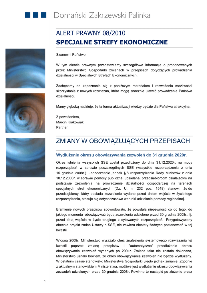 ALERT PRAWNY 08/2010 SPECJALNE STREFY EKONOMICZNE Szanowni Państwo, W tym alercie prawnym przedstawiamy szczegółowe informacje o proponowanych przez Ministerstwo Gospodarki zmianach w przepisach dotyczących prowadzenia działalności w Specjalnych Strefach Ekonomicznych. Zachęcamy do zapoznania się z poniższym materiałem i rozważenia możliwości skorzystania z nowych rozwiązań, które mogą znacznie ułatwić prowadzenie Państwa działalności. Mamy głęboką nadzieję, że ta forma aktualizacji wiedzy będzie dla Państwa atrakcyjna. Z poważaniem, Marcin Krakowiak Partner ZMIANY W OBOWIĄZUJĄCYCH PRZEPISACH Wydłużenie okresu obowiązywania zezwoleń do 31 grudnia 2020r. Okres istnienia wszystkich SSE został przedłużony do dnia 31.12.2020r. na mocy rozporządzeń w sprawie poszczególnych SSE (wszystkie rozporządzenia z dnia 15 grudnia 2008r.). Jednocześnie jednak § 8 rozporządzenia Rady Ministrów z dnia 10.12.2008r. w sprawie pomocy publicznej udzielanej przedsiębiorcom działającym na podstawie zezwolenia na prowadzenie działalności gospodarczej na terenach specjalnych stref ekonomicznych (Dz. U. nr 232 poz. 1548) stanowi, że do przedsiębiorcy, który posiada zezwolenie wydane przed dniem wejścia w życie tego rozporządzenia, stosuje się dotychczasowe warunki udzielania pomocy regionalnej. Brzmienie nowych przepisów spowodowało, że powstała niepewność co do tego, do jakiego momentu obowiązywać będą zezwolenia udzielone przed 30 grudnia 2008r., tj. przed datą wejścia w życie drugiego z cytowanych rozporządzeń. Przygotowywany obecnie projekt zmian Ustawy o SSE, nie zawiera niestety żadnych postanowień w tej kwestii. Wiosną 2009r. Ministerstwo wyrażało chęć znalezienia systemowego rozwiązania tej kwestii poprzez zmianę przepisów i "automatyczne" przedłużenie okresu obowiązywania zezwoleń wydanych po 2001r. Zmiana taka nie została dokonana, Ministerstwo uznało bowiem, że okres obowiązywania zezwoleń nie będzie wydłużany. W ostatnim czasie stanowisko Ministerstwa Gospodarki uległo jednak zmianie. Zgodnie z aktualnym stanowiskiem Ministerstwa, możliwe jest wydłużenie okresu obowiązywania zezwoleń udzielonych przed 30 grudnia 2008r. Powinno to nastąpić po złożeniu przez 1 przedsiębiorcę wniosku, w trybie indywidualnej decyzji administracyjnej o zmianie zezwolenia, wydanej na podstawie obecnie obowiązujących przepisów. Wniosek przedsiębiorcy powinien zawierać odpowiednie uzasadnienie konieczności dokonania takiej zmiany, ponieważ w każdym wypadku decyzja o zmianie zezwolenia jest decyzją uznaniową. Okolicznościami, które w ocenie Ministerstwa Gospodarki uzasadniają wydłużenie okresu obowiązywania zezwolenia są np. konieczność odsunięcia realizacji inwestycji w czasie z uwagi na spowolnienie gospodarcze, niemożność wykorzystania dostępnego limitu pomocy publicznej w okresie obowiązywania zezwolenia wywołana spowolnieniem gospodarczym. Uzasadnienie wniosku wskazywać wszystkie okoliczności na jego poparcie. powinno wyczerpująco Z uwagi na to, że w projekcie zmian Ustawy o SSE ciągle brak jest rozwiązania kwestii przedłużenia okresu obowiązywania zezwoleń, obecnie najlepszym rozwiązaniem jest złożenie wniosku o zmianę zezwolenia. PLANOWANE ZMIANY W PRZEPISACH Planowana nowelizacja przepisów dotyczących działalności w SSE Ministerstwo Gospodarki opracowało kolejny projekt nowelizacji przepisów dotyczących prowadzenia działalności na terenie Specjalnych Stref Ekonomicznych, który został przekazany do Rady Ministrów w dniu 2 czerwca 2010r. Projekt ten różni się istotnie od poprzedniego projektu z dnia 25 listopada 2010r., zostały do niego bowiem wprowadzone przepisy dotyczące obowiązku zwrotu pomocy publicznej w wypadku cofnięcia zezwolenia. Bez zmian w stosunku do poprzedniego projektu pozostały przepisy dotyczące zmiany zezwolenia, o których była mowa w naszej poprzedniej informacji z grudnia 2009r. Nowelizacja przepisów Ustawy o SSE planowana była już wiosną 2009 roku, jednakże kolejne przygotowywane przez Ministerstwo Gospodarki projekty zmian nie zostały ostatecznie wniesione do Sejmu. Projektowane zmiany miały wychodzić naprzeciw oczekiwaniom inwestorów, którzy w sytuacji recesji gospodarczej nie są w stanie utrzymać dotychczasowego poziomu produkcji i zatrudnienia. Cofnięcie zezwolenia i obowiązek zwrotu pomocy publicznej Zgodnie z projektem nowelizacji Ustawy o SSE, Minister Gospodarki będzie cofał zezwolenie, jeżeli przedsiębiorca: zaprzestanie prowadzenia na terenie SSE działalności gospodarczej, na którą posiada zezwolenie; uniemożliwi przeprowadzenie kontroli realizacji warunków zezwolenia; rażąco uchybi warunkom lub kryteriom określonym w zezwoleniu, przy czym rażące uchybienie polegać będzie w szczególności na niedopełnieniu tych warunków lub kryteriów o więcej niż 20%; złoży wniosek o cofnięcie zezwolenia. Ponadto, zezwolenie będzie mogło zostać cofnięte, jeśli przedsiębiorca nie usunie uchybień stwierdzonych w toku kontroli w terminie wyznaczonym do ich usunięcia. 2 Zgodnie z aktualnie obowiązującymi przepisami, decyzja o cofnięciu zezwolenia w każdym wypadku jest uznaniowa, tj. Minister Gospodarki może cofnąć zezwolenie, lecz nie musi tego robić. Po zmianie przepisów, w okolicznościach wskazanych w punktach 1-4 powyżej cofnięcie zezwolenia będzie obligatoryjne. W ten sposób cofnięcie zezwolenia stanie się realną sankcją, jaka grozić będzie przedsiębiorcy w przypadku naruszenia warunków zezwolenia, ale również w wypadku zaprzestania prowadzenia działalności na terenie SSE. Należy w tym miejscu zwrócić uwagę, że przedsiębiorca jest zobowiązany do utrzymania inwestycji w SSE przez okres 5 lub 3 lat, nie jest zatem jasne, czy zaprzestanie działalności po tym okresie również nie będzie powodowało cofnięcia zezwolenia, co stanowi istotne ryzyko dla przedsię