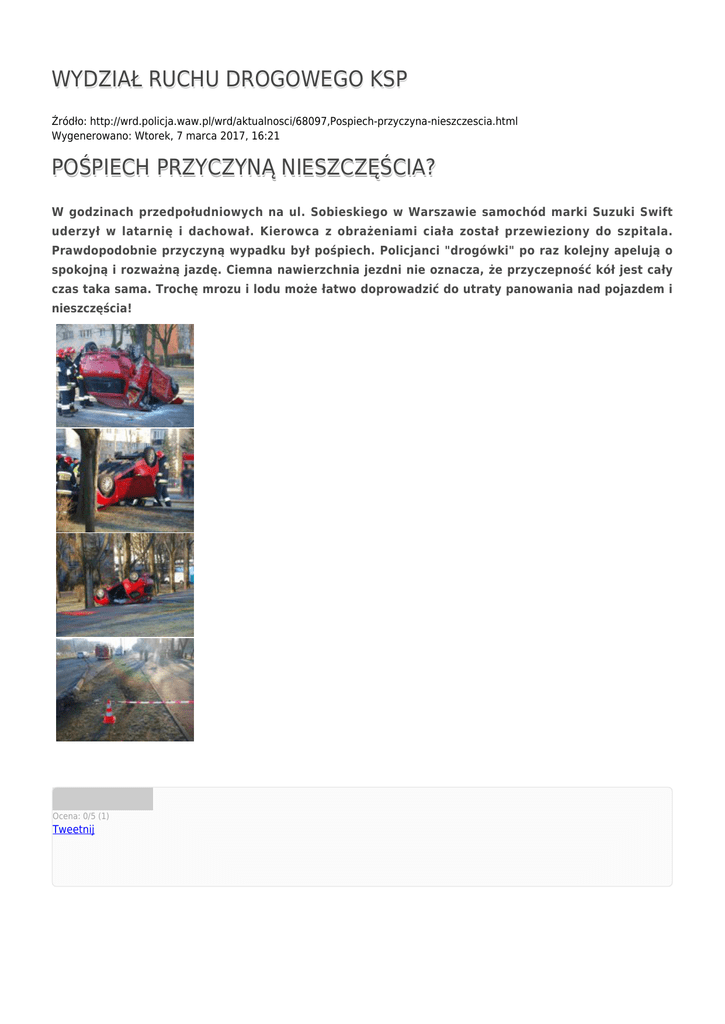 WYDZIAŁ RUCHU DROGOWEGO KSP Źródło: http://wrd.policja.waw.pl/wrd/aktualnosci/68097,Pospiech-przyczyna-nieszczescia.html Wygenerowano: Wtorek, 7 marca 2017, 16:21 POŚPIECH PRZYCZYNĄ NIESZCZĘŚCIA? W godzinach przedpołudniowych na ul. Sobieskiego w Warszawie samochód marki Suzuki Swift uderzył w latarnię i dachował. Kierowca z obrażeniami ciała został przewieziony do szpitala. Prawdopodobnie przyczyną wypadku był pośpiech. Policjanci "drogówki" po raz kolejny apelują o spokojną i rozważną jazdę. Ciemna nawierzchnia jezdni nie oznacza, że przyczepność kół jest cały czas taka sama. Trochę mrozu i lodu może łatwo doprowadzić do utraty panowania nad pojazdem i nieszczęścia! Ocena: 0/5 (1) Tweetnij