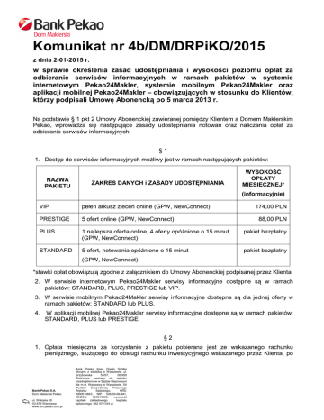 Komunikat nr 4b/DM/DRPiKO/2015 z dnia 2-01-2015 r. w sprawie określenia zasad udostępniania i wysokości poziomu opłat za odbieranie serwisów informacyjnych w ramach pakietów w systemie internetowym Pekao24Makler, systemie mobilnym Pekao24Makler oraz aplikacji mobilnej Pekao24Makler – obowiązujących w stosunku do Klientów, którzy podpisali Umowę Abonencką po 5 marca 2013 r. Na podstawie § 1 pkt 2 Umowy Abonenckiej zawieranej pomiędzy Klientem a Domem Maklerskim Pekao, wprowadza się następujące zasady udostępniania notowań oraz naliczania opłat za odbieranie serwisów informacyjnych: §1 1. Dostęp do serwisów informacyjnych możliwy jest w ramach następujących pakietów: NAZWA PAKIETU ZAKRES DANYCH i ZASADY UDOSTĘPNIANIA WYSOKOŚĆ OPŁATY MIESIĘCZNEJ* (informacyjnie) VIP pełen arkusz zleceń online (GPW, NewConnect) 174,00 PLN PRESTIGE 5 ofert online (GPW, NewConnect) PLUS 1 najlepsza oferta online, 4 oferty opóźnione o 15 minut (GPW, NewConnect) pakiet bezpłatny STANDARD 5 ofert, notowania opóźnione o 15 minut pakiet bezpłatny 88,00 PLN (GPW, NewConnect) *stawki opłat obowiązują zgodne z załącznikiem do Umowy Abonenckiej podpisanej przez Klienta 2. W serwisie internetowym Pekao24Makler serwisy informacyjne dostępne są w ramach pakietów: STANDARD, PLUS, PRESTIGE lub VIP. 3. W serwisie mobilnym Pekao24Makler serwisy informacyjne dostępne są dla jednej oferty w ramach pakietów: STANDARD lub PLUS. 4. W aplikacji mobilnej Pekao24Makler serwisy informacyjne dostępne są w ramach pakietów: STANDARD, PLUS lub PRESTIGE. §2 1. Opłata miesięczna za korzystanie z pakietu pobierana jest ze wskazanego rachunku pieniężnego, służącego do obsługi rachunku inwestycyjnego wskazanego przez Klienta, po Bank Pekao S.A. Dom Maklerski Pekao ul. Wołoska 18 02-675 Warszawa www.dm.pekao.com.pl Bank Polska Kasa Opieki Spółka Akcyjna z siedzibą w Warszawie, ul. Grzybowska 53/57, 00-950 Warszawa, wpisany do rejestru przedsiębiorców w Sądzie Rejonowym dla m.st. Warszawy w Warszawie, XII Wydział Gospodarczy Krajowego Rejestru Sądowego, KRS: 0000014843, NIP: 526-00-06-841, REGON: 000010205, wysokość kapitału zakładowego i kapitału wpłaconego: 262 470 034 zł. zakończeniu miesiąca kalendarzowego, w ciągu pierwszych pięciu dni roboczych następnego miesiąca, o ile saldo środków pieniężnych na tym rachunku na to pozwala. 2. Jeżeli na wskazanym rachunku pieniężnym służącym do obsługi rachunku inwestycyjnego Klienta nie ma wystarczających środków pieniężnych pozwalających pobrać należną opłatę, dostęp do pakietów notowań w czasie rzeczywistym jest blokowany. Dom Maklerski będzie ponawiać próbę pobrania opłaty ze wskazanego rachunku. 3. Odblokowanie dostępu jest możliwe po uregulowaniu należności. §3 W przypadku Klientów, którzy w minionym miesiącu kalendarzowym nie zalogowali się do systemu udostępniania serwisów informacyjnych, po zakończeniu każdego miesiąca kalendarzowego, Dom Maklerski Pekao dokonuje automatycznej zmiany pakietu z wersji PLUS na wersję STANDARD. Klient ma możliwość przywrócenia pakietu z wersji STANDARD na wersję PLUS lub inną w dowolnym momencie w trybie określonym w § 1 ust. 5 Umowy Abonenckiej. W przypadku pozostawienia w kolejnym miesiącu kalendarzowym przez cały czas trwania tego miesiąca na rachunku pakietu w wersji STANDARD, Klient nie ponosi opłaty za korzystanie z pakietu. W przypadku zmiany pakietu na rachunku, obowiązują postanowienia § 1 ust. 5 Umowy Abonenckiej. §4 1. Dom Maklerski odstępuje od pobierania opłaty za korzystanie z pakietu PRESTIGE lub VIP za pośrednictwem systemu internetowego Pekao24Makler i aplikacji mobilnej Pekao24Makler w stosunku do Klientów, którzy na wskazanym rachunku inwestycyjnym wygenerowali średniomiesięczny obrót brutto (bez prowizji) a. w miesiącu, którego dotyczy opłata lub b. w ostatnich 3 miesiącach kalendarzowych (w miesiącu, którego dotyczy opłata oraz w 2 poprzedzających miesiącach) o wartości nie niższej niż wskazane w poniższej tabeli obrotu brutto: RODZAJ PAKIETU Minimalna wartość obrotu wymagana w celu zwolnienia z opłaty za korzystanie z serwisów informacyjnych VIP 180 000 PLN na rynku kasowym, lub 180 sztuk kontraktów terminowych PRESTIGE 70 000 PLN na rynku kasowym, lub 70 sztuk kontraktów terminowych Pod pojęciem rynku kasowego rozumiany jest rynek akcji, praw do akcji, warrantów i certyfikatów inwestycyjnych. 2. Dom Maklerski odstępuje od dokonywania automatycznej zmiany pakietu z wersji PLUS na wersję STANDARD zgodnie z treścią § 3 niniejszego Komunikatu do dnia 31 czerwca 2015 r. Bank Pekao S.A. Dom Maklerski Pekao ul. Wołoska 18 02-675 Warszawa www.dm.pekao.com.pl Bank Polska Kasa Opieki Spółka Akcyjna z siedzibą w Warszawie, ul. Grzybowska 53/57, 00-950 Warszawa, wpisany do rejestru przedsiębiorców w Sądzie Rejonowym dla m.st. Warszawy w Warszawie, XII Wydział Gospodarczy Krajowego Rejestru Sądowego, KRS: 0000014843, NIP: 526-00-06-841, REGON: 000010205, wysokość kapitału zakładowego i kapitału wpłaconego: 262 470 034 zł. §5 Podmiotem Uprawnionym do otrzymywania danych osobowych Klienta w rozumieniu § 6 Umowy Abonenckiej jest Giełda Papierów Wartościowych w Warszawie S.A. §6 1. Traci moc Komunikat 31b/DM/DRPiKO/2014 z dnia 13 października 2014 roku. 2. W odniesieniu do Klientów, którzy podpisali Umowę Abonencką przed dniem 6 marca 2013 r., obowiązują zasady udostępniania i wysokości poziomu opłat za odbieranie serwisów giełdowych czasu rzeczywistego w ramach pakietów w systemie internetowym Pekao24Makler, systemie mobilnym Pekao24Makler oraz aplikacji mobilnej Pekao24Makler określone komunikatem nr 4a/DM/DRPiKO/2015 z dnia 2 stycznia 2015 r. §7 Komunikat wchodzi w życie z dniem 2 stycznia 2015 r. Piotr Kozłowski Dyrektor Domu Maklerskiego PEKAO Bank Pekao S.A. Dom Maklerski Pekao ul. Wołoska 18 02-675 Warszawa www.dm.pekao.com.pl Bank