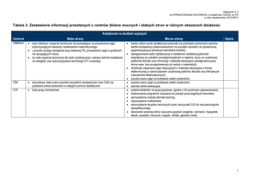 Załącznik nr 3 do SPRAWOZDANIA ROCZNEGO z działalności UKZJK na PG w roku akademickim 2012/2013 Tabela 3. Zestawienie informacji przesłanych z centrów (bilans mocnych i słabych stron w różnych obszarach działania) Kształcenie na studiach wyższych Centrum Słabe strony CNMiKnO baza lokalowa i wsparcie techniczne nie pozwalające na prowadzenie zajęć wykorzystujących elementy modelowania matematycznego, z powodu dużego obciążenia bazy lokalowej PG, prowadzenie zająć w godzinach nie sprzyjających nauce, za małe wsparcie techniczne dla kadry dydaktycznej z zakresu technik kształcenia na odległość oraz wykorzystywania technologii ICT w edukacji. CSA stosunkowo niska ocena spośród wszystkich wystawionych ocen CSA (na podstawie ankiet studentów) w kategorii pomoce dydaktyczne. duże grupy ćwiczeniowe. CJO Mocne strony Opinie bardzo dobre wyniki dydaktyczne jednostki (na podstawie porównania wyników testów kompetencji przeprowadzanych na początku semestru ze sprawnością egzaminacyjną po pierwszym semestrze studiów), zaangażowanie kadry dydaktycznej w działalność dodatkową jednostki (współpraca ze szkołami ponadgimnazjalnymi w regionie, kursy na uczelnianej platformie Moodle oraz informacje i materiały edukacyjne udostępniane przez strony www, kurs przygotowawczy do matury z matematyki), możliwość wspierania zajęć tradycyjnych o materiały edukacyjne w formie elektronicznej (z wykorzystaniem uczelnianej platformy Moodle oraz Wirtualnych Laboratoriów Matematycznych), wysoka ocena zajęć na podstawie ankiet studenckich. wysoka ocena zajęć na podstawie ankiet studenckich, szeroka oferta edukacyjna. podział studentów na grupy językowe, zgodne z ich poziomem zaawansowania, dostosowanie programów nauczania do potrzeb poszczególnych kierunków, wprowadzenie metody blended learning, wykorzystanie multimediów, wykorzystanie skryptów tworzonych przez nauczycieli CJO do nauczania języka specjalistycznego, stworzenie szerokiej oferty nauczania języków (angielski, niemiecki, hiszpański, włoski, szwedzki, francuski, rosyjski, chiński, japoński, hindi). 1 Załącznik nr 3 do SPRAWOZDANIA ROCZNEGO z działalności UKZJK na PG w roku akademickim 2012/2013 Baza dydaktyczna Centrum Słabe strony Mocne strony CNMiKnO problemy organizacyjne związane z brakiem odpowiedniej bazy lokalowej i wsparciem technicznym umożliwiającym kształcenie ze wsparciem technologii ICT. możliwość prowadzenia zajęć z wykorzystaniem komputerów przenośnych, powstanie zestawu pomocy dydaktycznych w formie wirtualnych laboratoriów. CSA problemy organizacyjne związane z trwającymi remontami obiektów. CJO Baza lokalowa: małe sale do prowadzenia zajęć dydaktycznych, brak pokoi dla pracowników, brak pomieszczeń do konsultacji, brak pomieszczeń umożliwiających instalację urządzeń do obsługi platformy MojaPG. Opinie szeroki dostęp studentów do bazy dydaktycznej, poszerzenie i odnowienie bazy pomocy dydaktycznych. nowocześnie wyposażone sale dydaktyczne, dobrze wyposażony księgozbiór podręczny, dostęp do najnowszych wydawnictw podręczników do nauki języków obcych oraz prasy. Podsumowanie w zakresie słabych stron dla obu zakresów: Problemy organizacyjne związane z brakiem odpowiedniej bazy lokalowej i wynikające z remontów. Duże grupy ćwiczeniowe. 2