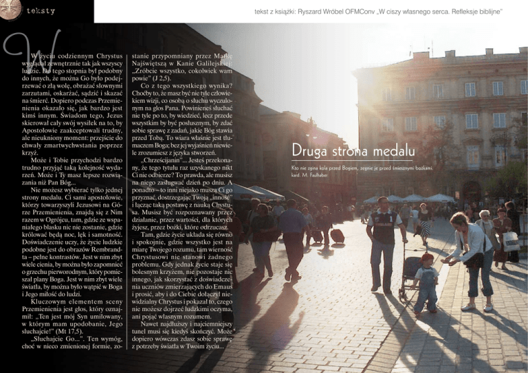 teksty W W życiu codziennym Chrystus wyglądał zewnętrznie tak jak wszyscy ludzie. Do tego stopnia był podobny do innych, że można Go było podejrzewać o złą wolę, obrażać słownymi zarzutami, oskarżać, sądzić i skazać na śmierć. Dopiero podczas Przemienienia okazało się, jak bardzo jest kimś innym. Świadom tego, Jezus skierował cały swój wysiłek na to, by Apostołowie zaakceptowali trudny, ale nieukniony moment: przejście do chwały zmartwychwstania poprzez krzyż. Może i Tobie przychodzi bardzo trudno przyjąć taką kolejność wydarzeń. Może i Ty masz lepsze rozwiązania niż Pan Bóg... Nie możesz wybierać tylko jednej strony medalu. Ci sami apostołowie, którzy towarzyszyli Jezusowi na Górze Przemienienia, znajdą się z Nim razem w Ogrójcu, tam, gdzie ze wspaniałego blasku nic nie zostanie, gdzie królować będą noc, lęk i samotność. Doświadczenie uczy, że życie ludzkie podobne jest do obrazów Rembrandta – pełne kontrastów. Jest w nim zbyt wiele cienia, by można było zapomnieć o grzechu pierworodnym, który pomieszał plany Boga. Jest w nim zbyt wiele światła, by można było wątpić w Boga i Jego miłość do ludzi. Kluczowym elementem sceny Przemienienia jest głos, który oznajmił: „Ten jest mój Syn umiłowany, w którym mam upodobanie, Jego sluchajcie!” (Mt 17,5). „Słuchajcie Go...”. Ten wymóg, choć w nieco zmienionej formie, zo- tekst z książki: Ryszard Wróbel OFMConv „W ciszy własnego serca. Refleksje biblijne” stanie przypomniany przez Matkę Najświętszą w Kanie Galilejskiej: „Zróbcie wszystko, cokolwiek wam powie” (J 2,5). Co z tego wszystkiego wynika? Choćby to, że masz być nie tyle człowiekiem wizji, co osobą o słuchu wyczulonym na glos Pana. Powinieneś słuchać nie tyle po to, by wiedzieć, lecz przede wszystkim by być posłusznym, by zdać sobie sprawę z zadań, jakie Bóg stawia przed Tobą. To wiara właśnie jest tłumaczem Boga; bez jej wyjaśnień niewiele zrozumiesz z języka stworzeń. „Chrześcijanin”... Jesteś przekonany, że tego tytułu raz uzyskanego nikt Ci nie odbierze? To prawda, ale musisz na niego zasługwać dzień po dniu. A ponadto – to inni niejako muszą Ci go przyznać, dostrzegając Twoją „inność” i łącząc taką postawę z nauką Chystusa. Musisz być rozpoznawany przez działanie, przez wartości, dla których żyjesz, przez bożki, które odrzucasz. Tam, gdzie życie układa się równo i spokojnie, gdzie wszystko jest na miarę Twojego rozumu, tam wierność Chrystusowi nie stanowi żadnego problemu. Gdy jednak życie staje się bolesnym krzyżem, nie pozostaje nic innego, jak skorzystać z doświadczenia uczniów zmierzających do Emaus i prosić, aby i do Ciebie dołączył niewidzialny Chrystus i pokazał to, czego nie możesz dojrzeć ludzkimi oczyma, ani pojąć własnym rozumem. Nawet najdłuższy i najciemniejszy tunel musi się kiedyś skończyć. Może dopiero wówczas zdasz sobie sprawę z potrzeby światła w Twoim życiu... Druga strona medalu Kto nie zgina kola przed Bogiem, zegnie je przed śmiesznymi bożkami. kard. M. Faulhaber