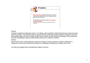 Przejścia Natychmiastowe przekazanie sterowania z akcji lub czynności kończącej dany stan do następnego stanu akcji lub stanu czynności W UML takie akcje określa się jako automatyczne lub zakończeniowe (przejście natychmiast po ukończeniu prac związanych ze stanem źródłowym) (spacja) Przejście w diagramie występować powinno. A to dlatego, żeby powiedzieć, dokąd skierować się po wykonaniu danej akcji lub czynności. Twórcy języka wpadli na genialny pomysł i postanowili wyrażać przejście w diagramie czynności jako zwykłą strzałkę. Nie wiem, jak długo musieli nad tym myśleć, ale efekt okazał się porażający. (aby spowodować wrażenie narastającego napięcia zwykłą strzałkę zobaczycie na następnym slajdzie). (spacja) Nie bez kozery słowo „natychmiastowe” pojawia się w tekście w kolorze czerwonym. Ważnym założeniem w diagramach czynności jest bezpośrednie przejście do następnego prostokącika (lub tabletki, jak kto woli). Za chwilę, jak wygląda bardzo skomplikowany diagram czynności. 1 Przejścia - przykład Typowe postępowanie leniwego studenta: Stan początkowy Przygotuj prezentację (Ctrl+C, Ctrl+V) Przejście automatyczne Stan akcji Przekaż swoje materiały koledze Stan końcowy (spacja) I oto diagram czynności w całej okazałości. Jak na dłoni widać kolejno stan początkowy, stany akcji, stan końcowy. Leniwy student pierwej przygotowuje prezentację z wykorzystaniem znanej wszystkim techniki. Następnie dochodzi do wniosku, że skoro już się tak bardzo napracował, może lepiej nie przyjść na zajęcia, a materiały przekazać koledze. Należy podkreślić, że jest to zachowanie wielce niestosowne. Pytanie do publiczności: czy prezentowane stany są stanami akcji czy czynności? Chwila na zastanowienie… Odpowiedź: można przychylić się do stwierdzenia, że pierwszy ze stanów to stan czynności, drugi – stan akcji. Jednak dokonanie takiego podziału zależy od poziomu abstrakcji, z jakim będziemy chcieli reprezentować model. Przy bardzo szczegółowym modelu nawet akcja: „Przekaż swoje materiały koledze” może być potraktowana jako czynność (spakuj materiały, znajdź kolegę, oddaj materiały itp.) 2 Rozgałęzienia Notacyjne udogodnienie Opisują ścieżki alternatywne Jedno przejście wejściowe i co najmniej dwa przejścia wyjściowe. Wyrażenie logiczne na każdym przejściu wyjściowym. Wybór ścieżki na podstawie wartości wyrażenia logicznego. Warunki dozoru: • Jednoznaczne • Kompletne Życie jest okrutne… Nie zawsze możemy kroczyć prostą ścieżką. Czasem trzeba podejmować bardzo trudne decyzje (np. iść na zajęcia czy nie iść). Język UML przewiduje nawet takie możliwości. (spacja) Tak po prawdzie to rozgałęzienia nie są w języku konieczne. Diagramy czynności to szczególny przypadek diagramów stanów. Niektórzy mówią nawet, że diagramy czynności to nadmiarowy element języka, bo to samo można w odpowiedni sposób wyrazić za pomocą diagramów stanów. W tych ostatnich na każdy stan można nałożyć specjalne logiczne ograniczenie. To właśnie dlatego mówi się, że rozgałęzienia są tylko notacyjnym udogodnieniem. Jednak często się z niego korzysta. (spacja) Zatem rozgałęzienia opisują różne warianty postępowania. Jak za chwilę zobaczycie, do rozgałęzienia dochodzi najczęściej jedno przejście wejściowe, a wychodzą przynajmniej dwa przejścia wyjściowe. Logiczne to jest nawet, bo coś musi się rozgałęziać. O wyborze ścieżki decyduje wartość wyrażenia logicznego. Kolejność obliczania wartości wyrażeń nie jest ważna. Pytanie do publiczności: Dlaczego? Chwila na zastanowienie… (spacja) Dlatego, że na te wartości są nałożone dwa bardzo ważne ograniczenia: jednoznaczności i kompletności. Pierwszy wrunek oznacza iż nie istnieją dwie gałęzie które mogą być wybrane w tym samym czasie Ale to za mało 3 Rozgałęzienia - przykład Udaj Udaj się się do do Tawerny tawerny [cena[else] piwa > 5 zł] Przejdź Przejdźdo doManhatannu innego baru [cena piwa > 5 zł i [Jest ładna kelnerka] jest ładna kelnerka] Kup Kup piwo piwo Pytanie do publiczności: czy podane warunki są dobre ? (z uzasadnieniem odpowiedzi) Niestety, wypisane warunki nie są właściwe. Nie dlatego, że kelnerka nie jest ładna, ale dlatego, że nie spełniają warunku jednoznaczności i kompletności. Widać wyraźnie, że te dwa warunki nakładają się na siebie. Gdybyśmy nie oceniali urody kelnerki, moglibyśmy od razu przejść do innego baru, a to już świadczy o tym, że kolejność sprawdzania warunków jest ważna. Nie możemy oczywiście do tego dopuścić. Po drugie – co zrobić, gdy cena piwa <= 5 zł? (spacja) Dlatego naprawiamy ten błąd. (spacja) (spacja) Ten przykład jest już poprawny. Niestety, tutaj być może nie napijemy się piwa, ale z pewnością zobaczymy ładną kelnerkę. 4 Rozwidlenia Modelowanie współbieżnych przepływów sterowania. Rozwidlenie - jedno przejście wejściowe i co najmniej dwa przejścia wyjściowe. Scalenie - odwrotnie: co najmniej dwa wejściowe, jedno wyjściowe. Liczba przepływów opuszczających rozwidlenie powinna być równa liczbie przepływów wchodzących do odpowiadającego mu scalenia. W punkcie scalenia dochodzi do synchronizacji współbieżnych przepływów sterowania. Czynności zachodzące w równoległych przepływach mogą się komunikować. Komunikujące się procesy - współprogramy. (spacja) Do zaprezentowania, że dwie akcje przebiegają w tym samym czasie służy rozwidlenie. Aby powrócić z rozwidlenia, gdzieś po drodze powinno wystąpić scalenie. (spacja) Jak nam podpowiada intuicja, rozwidlenie to coś, do czego dochodzi jedna strzałka, a wychodzi dwie lub więcej. Dla odmiany scalenie to coś, do czego dochodzą przynajmniej dwie strzałki, a wychodzi tylko jedna. Aby unikać nadmiernego używania na studiach słówka coś (tak jak ktoś, gdzieś, kiedy
