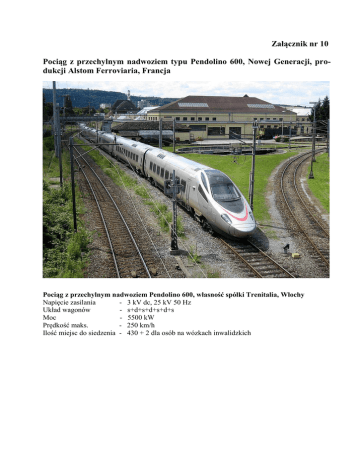 Załącznik nr 10 Pociąg z przechylnym nadwoziem typu Pendolino 600, Nowej Generacji, produkcji Alstom Ferroviaria, Francja Pociąg z przechylnym nadwoziem Pendolino 600, własność spółki Trenitalia, Włochy Napięcie zasilania - 3 kV dc, 25 kV 50 Hz Układ wagonów - s+d+s+d+s+d+s Moc - 5500 kW Prędkość maks. - 250 km/h Ilość miejsc do siedzenia - 430 + 2 dla osób na wózkach inwalidzkich
