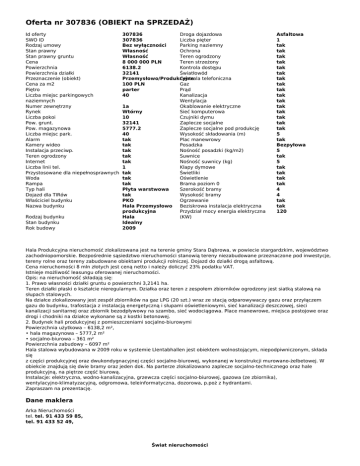 Oferta nr 307836 (OBIEKT na SPRZEDAŻ) Id oferty SWO ID Rodzaj umowy Stan prawny Stan prawny gruntu Cena Powierzchnia Powierzchnia działki Przeznaczenie (obiekt) Cena za m2 Piętro Liczba miejsc parkingowych naziemnych Numer zewnętrzny Rynek Liczba pokoi Pow. grunt. Pow. magazynowa Liczba miejsc park. Alarm Kamery wideo Instalacja przeciwp. Teren ogrodzony Internet Liczba linii tel. Przystosowane dla niepełnosprawnych Woda Rampa Typ hali Dojazd dla TIRów Właściciel budynku Nazwa budynku Rodzaj budynku Stan budynku Rok budowy 307836 Droga dojazdowa 307836 Liczba pięter Bez wyłączności Parking naziemny Własność Ochrona Własność Teren ogrodzony 8 000 000 PLN Teren strzeżony 6138.2 Kontrola dostępu 32141 Światłowód Przemysłowo/Produkcyjne Centrala telefoniczna 100 PLN Gaz parter Prąd 40 Kanalizacja Wentylacja 1a Okablowanie elektryczne Wtórny Sieć komputerowa 10 Czujniki dymu 32141 Zaplecze socjalne 5777.2 Zaplecze socjalne pod produkcję 40 Wysokość składowania (m) tak Plac manewrowy tak Posadzka tak Nośność posadzki (kg/m2) tak Suwnice tak Nośność suwnicy (kg) 1 Klapy dymowe tak Świetliki tak Oświetlenie tak Brama poziom 0 Płyta warstwowa Szerokość bramy tak Wysokość bramy PKO Ogrzewanie Hala Przemysłowo Beziskrowa instalacja elektryczna produkcyjna Przydział mocy energia elektryczna Hala (KW) Idealny 2009 Asfaltowa 1 tak tak tak tak tak tak tak tak tak tak tak tak tak tak tak tak 5 tak Bezpyłowa 5 tak 5 tak tak tak tak 4 4 tak tak 120 Hala Produkcyjna nieruchomość zlokalizowana jest na terenie gminy Stara Dąbrowa, w powiecie stargardzkim, województwo zachodniopomorskie. Bezpośrednie sąsiedztwo nieruchomości stanowią tereny niezabudowane przeznaczone pod inwestycje, tereny rolne oraz tereny zabudowane obiektami produkcji rolniczej. Dojazd do działki drogą asfaltową. Cena nieruchomości 8 mln złotych jest ceną netto i należy doliczyć 23% podatku VAT. Istnieje możliwość leasungu oferowanej nieruchomości. Opis: na nieruchomość składają się: 1. Prawo własności działki gruntu o powierzchni 3,2141 ha. Teren działki płaski o kształcie nieregularnym. Działka oraz teren z zespołem zbiorników ogrodzony jest siatką stalową na słupach stalowych. Na działce zlokalizowany jest zespół zbiorników na gaz LPG (20 szt.) wraz ze stacją odparowywaczy gazu oraz przyłączem gazu do budynku, trafostacja z instalacją energetyczną i słupami oświetleniowymi, sieć kanalizacji deszczowej, sieci kanalizacji sanitarnej oraz zbiornik bezodpływowy na szambo, sieć wodociągowa. Place manewrowe, miejsca postojowe oraz drogi i chodniki na działce wykonane są z kostki betonowej. 2. Budynek hali produkcyjnej z pomieszczeniami socjalno-biurowymi Powierzchnia użytkowa – 6138,2 m², • hala magazynowa – 5777,2 m² • socjalno-biurowa – 361 m² Powierzchnia zabudowy – 6097 m² Hala stalowa wybudowana w 2009 roku w systemie Llentabhallen jest obiektem wolnostojącym, niepodpiwniczonym, składa się z części produkcyjnej oraz dwukondygnacyjnej części socjalno-biurowej, wykonanej w konstrukcji murowano-żelbetowej. W obiekcie znajdują się dwie bramy oraz jeden dok. Na parterze zlokalizowano zaplecze socjalno-technicznego oraz hale produkcyjną, na piętrze część biurową. Instalacje: elektryczna, wodno-kanalizacyjna, grzewcza części socjalno-biurowej, gazowa (ze zbiornika), wentylacyjno-klimatyzacyjną, odgromowa, teleinformatyczna, dozorowa, p.poż z hydrantami. Zapraszam na prezentację. Dane maklera Arka Nieruchomości tel. tel. 91 433 59 85, tel. 91 433 52 49, Świat nieruchomości tel. tel. 512 080 803, tel. 508 382 979 Świat nieruchomości Powered by TCPDF (www.tcpdf.org)