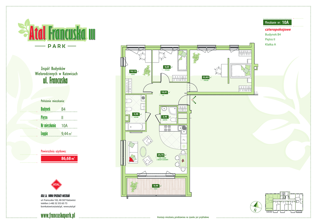 10A czteropokojowe Budynek B4 Piętro II Klatka A 9,69 10,13 22,82 10,91 B4 5,98 II 2,45 10A 9,44 m 2 24,70 86,68 m 2 9,44 ul. Francuska 102, 40-507 Katowice telefon: (+48) 32 353 65 73 [email protected], www.atal.pl N