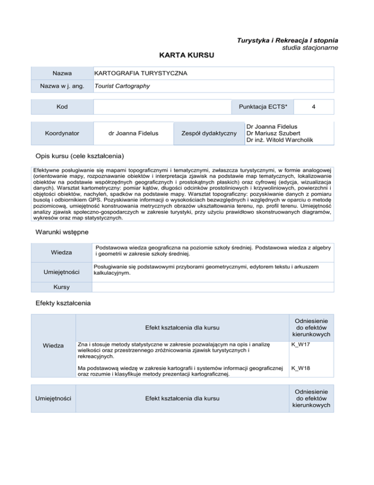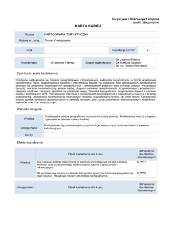 Turystyka i Rekreacja I stopnia studia stacjonarne KARTA KURSU Nazwa KARTOGRAFIA TURYSTYCZNA Nazwa w j. ang. Tourist Cartography Kod Punktacja ECTS* Koordynator dr Joanna Fidelus Zespół dydaktyczny 4 Dr Joanna Fidelus Dr Mariusz Szubert Dr inż. Witold Warcholik Opis kursu (cele kształcenia) Efektywne posługiwanie się mapami topograficznymi i tematycznymi, zwłaszcza turystycznymi, w formie analogowej (orientowanie mapy, rozpoznawanie obiektów i interpretacja zjawisk na podstawie map tematycznych, lokalizowanie obiektów na podstawie współrzędnych geograficznych i prostokątnych płaskich) oraz cyfrowej (edycja, wizualizacja danych). Warsztat kartometryczny: pomiar kątów, długości odcinków prostoliniowych i krzywoliniowych, powierzchni i objętości obiektów, nachyleń, spadków na podstawie mapy. Warsztat topograficzny: pozyskiwanie danych z pomiaru busolą i odbiornikiem GPS. Pozyskiwanie informacji o wysokościach bezwzględnych i względnych w oparciu o metodę poziomicową, umiejętność konstruowania metrycznych obrazów ukształtowania terenu, np. profil terenu. Umiejętność analizy zjawisk społeczno-gospodarczych w zakresie turystyki, przy użyciu prawidłowo skonstruowanych diagramów, wykresów oraz map statystycznych. Warunki wstępne Podstawowa wiedza geograficzna na poziomie szkoły średniej. Podstawowa wiedza z algebry i geometrii w zakresie szkoły średniej. Wiedza Umiejętności Posługiwanie się podstawowymi przyborami geometrycznymi, edytorem tekstu i arkuszem kalkulacyjnym. Kursy Efekty kształcenia Efekt kształcenia dla kursu Wiedza Umiejętności Odniesienie do efektów kierunkowych Zna i stosuje metody statystyczne w zakresie pozwalającym na opis i analizę wielkości oraz przestrzennego zróżnicowania zjawisk turystycznych i rekreacyjnych. K_W17 Ma podstawową wiedzę w zakresie kartografii i systemów informacji geograficznej oraz rozumie i klasyfikuje metody prezentacji kartograficznej. K_W18 Efekt kształcenia dla kursu Odniesienie do efektów kierunkowych Posługuje się sprawnie różnorodnymi źródłami (np. Internetem, materiałami K_U01 kartograficznymi analogowymi i cyfrowymi, odbiornikiem GPS i busolą, literaturą naukową i popularno-naukową) w celu realizacji podstawowych prac badawczych. Umie przygotować materiały informacyjne i kartograficzne (np. broszury, ulotki, K_U02 foldery) na potrzeby zagospodarowania turystycznego oraz promocji turystyki i rekreacji. Kompetencje społeczne Odniesienie do efektów kierunkowych Efekt kształcenia dla kursu Rozumie potrzebę uczenia się przez całe życie, aktualizowania wiedzy i upowszechniania dokonań naukowych. K_K02 Organizacja Forma zajęć Ćwiczenia w grupach Wykład (W) A Liczba godzin 10 K L S P E 30 Opis metod prowadzenia zajęć Zajęcia prowadzone są w formie: a) wykładów z wykorzystaniem technik multimedialnych i metod aktywizujących słuchaczy, b) ćwiczeń audytoryjnych z wykorzystaniem materiałów kartograficznych (mapy, ortofotomapy), c) w pracowni GIS z wykorzystaniem oprogramowania GIS i SIT, d) w terenie z wykorzystaniem sprzętu pomiarowego (GPS, busole itp.), e) w terenie w ramach zorganizowanej przez prowadzącego gry miejskiej z elementami biegu na orientację. Uwagi x x x x Inne Kolokwium pisemne Egzamin ustny Praca pisemna (esej) Referat Udział w dyskusji Projekt grupowy Projekt indywidualny Praca laboratoryjna Zajęcia terenowe x x x x K_W17 K_W18 K_U01 K_U02 K_K02 Kryteria oceny Ćwiczenia w szkole Gry dydaktyczne E – learning Formy sprawdzania efektów kształcenia x x x x X Zaliczenie treści ćwiczeń: na podstawie punktów uzyskanych z kolokwiów, projektów graficznych oraz prac indywidualnych i zespołowych terenowych. Egzamin pisemny w formie testu. brak Treści merytoryczne (wykaz tematów) Program wykładów: 1. 2. 3. 4. Kartografia – czym jest i czy jest przydatna? Specyfika kartografii turystycznej. Mapa i inne zobrazowania Ziemi w turystyce. Rodzaje map turystycznych. Ukształtowanie terenu na mapie. Wprowadzenie do ilościowych i jakościowych metod prezentacji danych statystycznych. Mapa w turystyce kwalifikowanej. Kartometria na mapie turystycznej. Program ćwiczeń: Określanie współrzędnych geograficznych i topograficznych na mapach turystycznych Kierunki – określanie azymutów na mapach i w terenie. Posługiwanie się kompasem, busolą, krokówka busolowa. Pomiar odcinków krzywoliniowych i powierzchni na mapach turystycznych 3. Skala mapy – obliczenia odległości, powierzchni na mapach i w terenie. Posługiwanie się podziałkami. 4. Orientowanie i czytanie treści mapy. Znaki kartograficzne. Informacje w opisie pozaramkowym. 5. Czytanie i interpretacja rysunku poziomicowego, określanie wysokości, obliczanie nachyleń, spadków, kreślenie profili topograficznych. 6. SIT i GIS- zajęcia w pracowni GIS IG UP. Udostępnianie danych z systemów informacyjnych. 7. GNSS – zajęcia w terenie: pomiar z użyciem odbiorników GPS: współrzędnych, powierzchni, projektowanie i zapis tras, profili topograficznych, nawigacja do punktu, poprawna interpretacja wyników. 8. Statystyki turystyczne. Opracowanie wykresów dynamicznych, linii trendów i diagramów strukturalnych. Statystyki turystyczne. Kartogramy i kartodiagramy. 9 i 10. Geoinfotropy (gra miejska+bieg na orientację) – praktyczne wykorzystanie treści przedmiotowych. 1. 2. Wykaz literatury podstawowej Ratajski L., 1989, Metodyka kartografii społeczno-gospodarczej, PPWK Warszawa-Wrocław. Medyńska-Gulij B., 2011, Kartografia i geowizualizacja, Wyd. Naukowe PWN, Warszawa. Pasławski J. (red.), 2006, Wprowadzenie do kartografii i topografii, Wyd. Nowa Era, Wrocław. Wykaz literatury uzupełniającej Clarke L.M., 1989, An experimental investigation of the communicative efficiency of point symbols on tourist maps, The Cartographic Journal, 26, December, 105-110. Dorożyński R., 2006, Zarys kartometrii, Toruń. Forrest D., Castner H.W., 1985, The design and percep