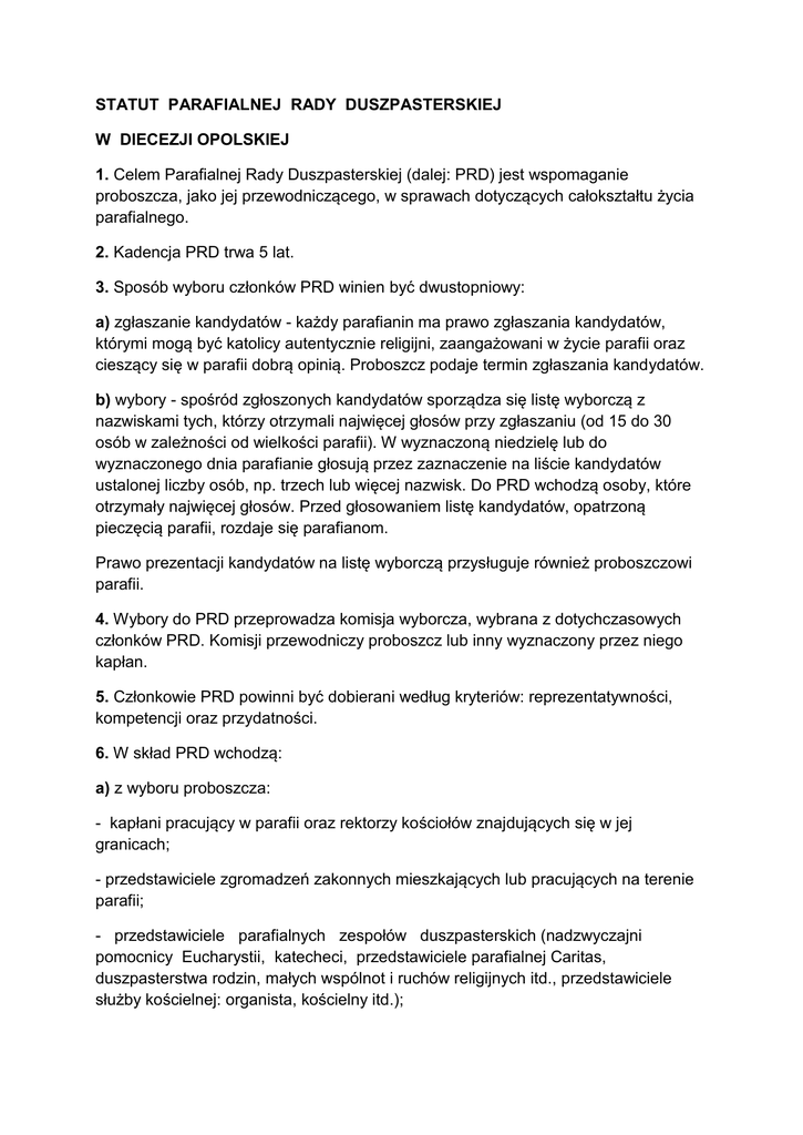 STATUT PARAFIALNEJ RADY DUSZPASTERSKIEJ W DIECEZJI OPOLSKIEJ 1. Celem Parafialnej Rady Duszpasterskiej (dalej: PRD) jest wspomaganie proboszcza, jako jej przewodniczącego, w sprawach dotyczących całokształtu życia parafialnego. 2. Kadencja PRD trwa 5 lat. 3. Sposób wyboru członków PRD winien być dwustopniowy: a) zgłaszanie kandydatów - każdy parafianin ma prawo zgłaszania kandydatów, którymi mogą być katolicy autentycznie religijni, zaangażowani w życie parafii oraz cieszący się w parafii dobrą opinią. Proboszcz podaje termin zgłaszania kandydatów. b) wybory - spośród zgłoszonych kandydatów sporządza się listę wyborczą z nazwiskami tych, którzy otrzymali najwięcej głosów przy zgłaszaniu (od 15 do 30 osób w zależności od wielkości parafii). W wyznaczoną niedzielę lub do wyznaczonego dnia parafianie głosują przez zaznaczenie na liście kandydatów ustalonej liczby osób, np. trzech lub więcej nazwisk. Do PRD wchodzą osoby, które otrzymały najwięcej głosów. Przed głosowaniem listę kandydatów, opatrzoną pieczęcią parafii, rozdaje się parafianom. Prawo prezentacji kandydatów na listę wyborczą przysługuje również proboszczowi parafii. 4. Wybory do PRD przeprowadza komisja wyborcza, wybrana z dotychczasowych członków PRD. Komisji przewodniczy proboszcz lub inny wyznaczony przez niego kapłan. 5. Członkowie PRD powinni być dobierani według kryteriów: reprezentatywności, kompetencji oraz przydatności. 6. W skład PRD wchodzą: a) z wyboru proboszcza: - kapłani pracujący w parafii oraz rektorzy kościołów znajdujących się w jej granicach; - przedstawiciele zgromadzeń zakonnych mieszkających lub pracujących na terenie parafii; - przedstawiciele parafialnych zespołów duszpasterskich (nadzwyczajni pomocnicy Eucharystii, katecheci, przedstawiciele parafialnej Caritas, duszpasterstwa rodzin, małych wspólnot i ruchów religijnych itd., przedstawiciele służby kościelnej: organista, kościelny itd.); - inni parafianie dobrani ze względu na ich zaangażowanie w parafii oraz kompetencje zawodowe; b) z wyboru parafian: parafianie wybrani według powyższych zasad diecezjalnych. 7. Parafianie wybrani przez proboszcza powinni stanowić 1/3 członków PRD, resztę dopełniają radni wybrani przez ogół parafian. 8. Członkowie PRD z poprzedniej kadencji mogą być ponownie wybrani. Należałoby jednak przestrzegać zasady, że po udziale w dwóch, a w uzasadnionych przypadkach - trzech kolejnych kadencjach PRD, dany członek nie powinien w kolejnej kadencji brać bezpośredniego udziału. 9. Ilość członków PRD powinna być adekwatna do wielkości parafii: a) maksimum 10 członków w parafiach do 2 tyś. wiernych; b) maksimum 15 członków w parafiach do 5 tyś. wiernych; c) maksimum 20 członków w parafiach do 10 tyś. wiernych; d) maksimum 25 członków w parafiach powyżej 10 tyś. wiernych. 10. Po wyborach członkowie PRD składają na ręce proboszcza przyrzeczenie wykonywania swojej posługi zgodnie ze swoim sumieniem oraz przepisami prawa kanonicznego. 11. Członkowie PRD powinni utworzyć sekcje odpowiedzialne za poszczególne odcinki życia parafialnego. Należą do nich następujące sekcje: a) katechetyczno-młodzieżowa; b) liturgiczna; c) charytatywna; d) ekonomiczno-gospodarcza i in. 12. Sekcja ekonomiczno-gospodarcza działa w oparciu o własny statut. 13. Proboszcz w uzasadnionym przypadku, po konsultacji z dziekanem, może odwołać wybranego przez siebie członka PRD i na jego miejsce powołać inną osobę. Na rozwiązanie całej PRD przed upływem kadencji musi uzyskać pisemną zgodę Kurii Diecezjalnej. 14. Z chwilą wakansu na urzędzie proboszcza działalność PRD ulega zawieszeniu. Nowy proboszcz po trzech miesiącach od objęcia parafii może wystąpić do dziekana rejonu z wnioskiem o rozwiązanie dotychczasowej PRD i o zatwierdzenie jej nowego składu. 15. Przynależność do PRD jest funkcją honorową i z racji jej pełnienia nie należy się żadne wynagrodzenie. 16. Zebrania PRD zwołuje proboszcz przynajmniej kilka razy w roku i im przewodniczy, zapraszając wszystkich jej członków. Poszczególne sekcje w miarę potrzeb powinny spotykać się częściej. Rada posiada jedynie głos doradczy. 17. Ewentualne nieporozumienia powstałe między PRD a proboszczem rozstrzyga dziekan rejonu. Władzą odwoławczą od decyzji dziekana rejonu jest Kuria Diecezjalna. 18. Członkowie PRD mają obowiązek wspierania proboszcza we wszelkich poczynaniach związanych z prowadzeniem parafii. 19. Proboszcz powinien przedstawić PRD inicjatywy duszpasterskie i gospodarcze oraz zasięgnąć opinii na ich temat. Podjęte inicjatywy Rada powinna wspierać i pomagać w ich realizacji. 20. Członkowie PRD powinni troszczyć się o pogłębienie swojej formacji zgodnie z nauką Kościoła poprzez uczestniczenie w spotkaniach ogólno diecezjalnych, rejonowych lub dekanalnych służących temu celowi. 21. Ważniejsze ustalenia PRD winny być podane do wiadomości całej wspólnocie parafialnej w ramach niedzielnych ogłoszeń parafialnych lub na łamach gazetki parafialnej. 22. Z każdego posiedzenia PRD należy sporządzić protokół. Protokoły przechowuje się w kancelarii parafialnej. Podlegają one wizytacji dziekańskiej i biskupiej. 23. Członkowie PRD spotykają się z biskupem przeprowadzającym wizytację kanoniczną i informują go o sprawach związanych z działalnością parafii. Opole, dnia 8 kwietnia 1992 Abp Alfons Nossol ordynariusz opolski
