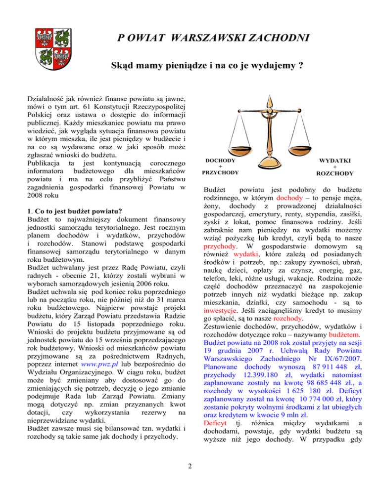 P OWIAT WARSZAWSKI ZACHODNI Skąd mamy pieniądze i na co je wydajemy ? Działalność jak również finanse powiatu są jawne, mówi o tym art. 61 Konstytucji Rzeczypospolitej Polskiej oraz ustawa o dostępie do informacji publicznej. Każdy mieszkaniec powiatu ma prawo wiedzieć, jak wygląda sytuacja finansowa powiatu w którym mieszka, ile jest pieniędzy w budżecie i na co są wydawane oraz w jaki sposób może zgłaszać wnioski do budżetu. Publikacja ta jest kontynuacją corocznego informatora budżetowego dla mieszkańców powiatu i ma na celu przybliżyć Państwu zagadnienia gospodarki finansowej Powiatu w 2008 roku DOCHODY + PRZYCHODY WYDATKI + ROZCHODY Budżet powiatu jest podobny do budżetu rodzinnego, w którym dochody – to pensje męża, żony, dochody z prowadzonej działalności gospodarczej, emerytury, renty, stypendia, zasiłki, zyski z lokat, pomoc finansowa rodziny. Jeśli zabraknie nam pieniędzy na wydatki możemy wziąć pożyczkę lub kredyt, czyli będą to nasze przychody. W gospodarstwie domowym są również wydatki, które zależą od posiadanych środków i potrzeb, np.: zakupy żywności, ubrań, naukę dzieci, opłaty za czynsz, energię, gaz, telefon, leki, różne usługi, wakacje. Rodzina może część dochodów przeznaczyć na zaspokojenie potrzeb innych niż wydatki bieżące np. zakup mieszkania, działki, czy samochodu - są to inwestycje. Jeśli zaciągnęliśmy kredyt to musimy go spłacić, są to nasze rozchody. Zestawienie dochodów, przychodów, wydatków i rozchodów dotyczące roku – nazywamy budżetem. Budżet powiatu na 2008 rok został przyjęty na sesji 19 grudnia 2007 r. Uchwałą Rady Powiatu Warszawskiego Zachodniego Nr IX/67/2007. Planowane dochody wynoszą 87 911 448 zł, przychody 12.399.180 zł, wydatki natomiast zaplanowane zostały na kwotę 98 685 448 zł., a rozchody w wysokości 1 625 180 zł. Deficyt zaplanowany został na kwotę 10 774 000 zł, który zostanie pokryty wolnymi środkami z lat ubiegłych oraz kredytem w kwocie 9 mln zł. Deficyt tj. różnica między wydatkami a dochodami, powstaje, gdy wydatki budżetu są wyższe niż jego dochody. W przypadku gdy 1. Co to jest budżet powiatu? Budżet to najważniejszy dokument finansowy jednostki samorządu terytorialnego. Jest rocznym planem dochodów i wydatków, przychodów i rozchodów. Stanowi podstawę gospodarki finansowej samorządu terytorialnego w danym roku budżetowym. Budżet uchwalany jest przez Radę Powiatu, czyli radnych - obecnie 21, którzy zostali wybrani w wyborach samorządowych jesienią 2006 roku. Budżet uchwala się pod koniec roku poprzedniego lub na początku roku, nie później niż do 31 marca roku budżetowego. Najpierw powstaje projekt budżetu, który Zarząd Powiatu przedstawia Radzie Powiatu do 15 listopada poprzedniego roku. Wnioski do projektu budżetu przyjmowane są od jednostek powiatu do 15 września poprzedzającego rok budżetowy. Wnioski od mieszkańców powiatu przyjmowane są za pośrednictwem Radnych, poprzez internet www.pwz.pl lub bezpośrednio do Wydziału Organizacyjnego. W ciągu roku, budżet może być zmieniany aby dostosować go do zmieniających się potrzeb, decyzję o jego zmianie podejmuje Rada lub Zarząd Powiatu. Zmiany mogą dotyczyć np. zmian przyznanych kwot dotacji, czy wykorzystania rezerwy na nieprzewidziane wydatki. Budżet zawsze musi się bilansować tzn. wydatki i rozchody są takie same jak dochody i przychody. 2 dochody są wyższe od wydatków mówimy o nadwyżce budżetowej. Deficyt wynika stąd, iż zaspokojenie potrzeb w różnych dziedzinach, za które odpowiedzialny jest samorząd wymaga więcej pieniędzy niż powiat posiada po stronie dochodów. Jest to najczęściej związane z prowadzonymi inwestycjami powiatowymi, choć może dotyczyć również wydatków bieżących. I. Dotacje celowe – 9.083.956 zł są to środki otrzymane z budżetu państwa za pośrednictwem Wojewody przeznaczone na określone cele, w tym: na zadania zlecone- rządowe; powierzone na podstawie zawartych porozumień; zadania własne powiatu wynikające z ustawy. Otrzymane dotacje zostaną wykorzystane na utrzymanie domów pomocy społecznej, Komendy Powiatowej Państwowej Straży Pożarnej, Powiatowego Inspektoratu Nadzoru Budowlanego, opłacenie ubezpieczeń zdrowotnych za bezrobotnych oraz pokrycie kosztów zadań urzędów wojewódzkich. Niewykorzystane dotacje trzeba zwrócić. II. Subwencja ogólna – 29.129.359 zł, są to środki finansowe przekazywane powiatowi z budżetu państwa poprzez Ministerstwo Finansów na określone cele, można je wydać zgodnie z potrzebami i nie trzeba się z nich rozliczać. Subwencja ogólna obejmuje część oświatową – 24.980.738 zł i część równoważącą – 4.148.621 zł Subwencja oświatowa przeznaczona jest na bieżące wydatki oświaty i edukacji, wydatki inwestycyjne z zakresu oświaty finansowane są z dochodów własnych powiatu oraz pozyskanych dotacji. III Udziały w podatkach stanowiących dochód budżetu państwa – w kwocie 38.450.217 zł, pochodzą z podatku dochodowego od osób fizycznych, wpłacanego przez mieszkańców powiatu 10,25 % podatków z PIT oraz podatku dochodowego wpłacanego przez firmy – 1,4% podatków z CIT. Budżet powiatu za pośrednictwem Ministerstwa Finansów w roku 2008 ma otrzymać z tytułu: - udziału we wpływach od podatku dochodowego od osób fizycznych zamieszkałych na obszarze powiatu kwotę około 36.950.217 zł, - udziałów w podatku dochodowym od osób prawnych, tj. podatników posiadających siedzibę firmy na terenie powiatu kwotę 1.500 tys. zł. IV. Dochody własne powiatu – 11.247.916 zł gromadzone są na podstawie różnych ustaw i wolno je wydać na zadania powiatu, ale decyzję o zadaniach nimi finansowanych podejmuje Rada Powiatu. Dochody własne Powiatu to: - dochody z majątku powiatu – 2.500.000 zł, powiat posiada mienie (np. budynki jednostek budżetowych powiatu, starostwa, grunty) mo