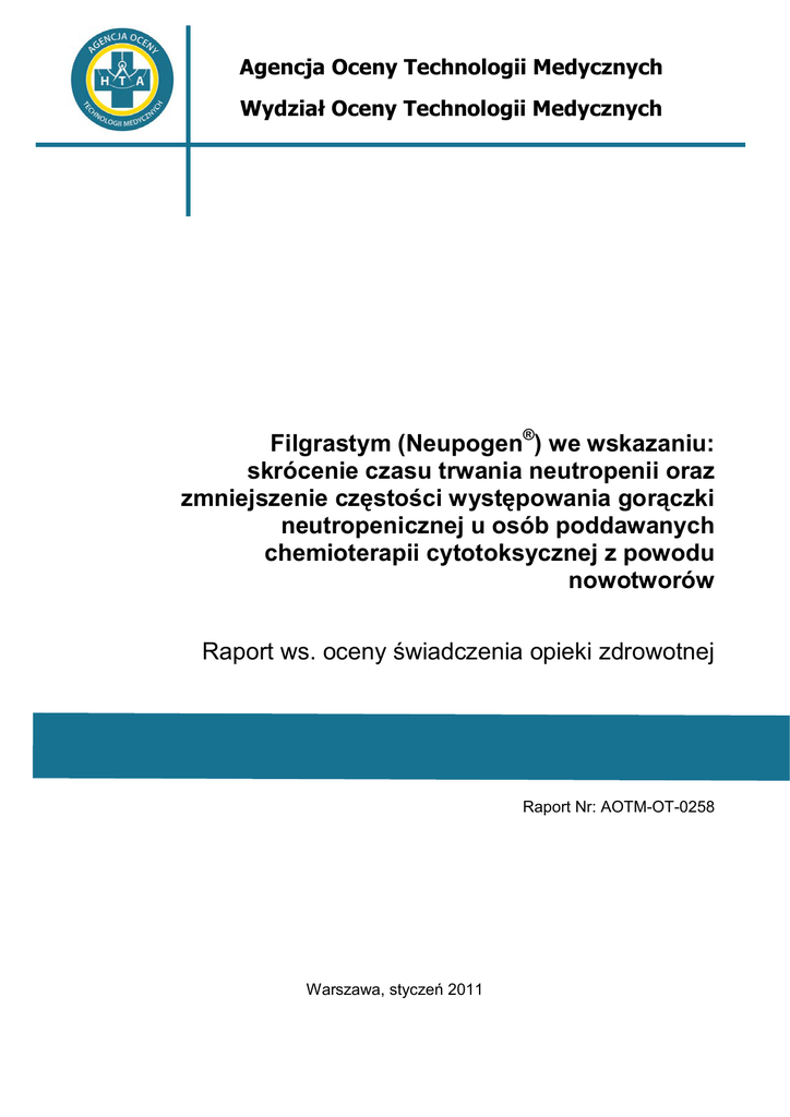 Agencja Oceny Technologii Medycznych Wydział Oceny Technologii Medycznych Filgrastym (Neupogen®) we wskazaniu: skrócenie czasu trwania neutropenii oraz zmniejszenie częstości występowania gorączki neutropenicznej u osób poddawanych chemioterapii cytotoksycznej z powodu nowotworów Raport ws. oceny świadczenia opieki zdrowotnej Raport Nr: AOTM-OT-0258 Warszawa, styczeń 2011 ® Filgrastym (Neupogen ) we wskazaniu: skrócenie czasu trwania neutropenii oraz zmniejszenie AOTM-OT-0258 częstości występowania gorączki neutropenicznej u osób poddawanych chemioterapii cytotoksycznej z powodu nowotworów W przygotowaniu raportu udział wzięli pracownicy Agencji Oceny Technologii Medycznych: • – Dział Raportów i Oceny Raportów, Wydział Oceny Technologii Medycznych (OT), Agencja Oceny Technologii Medycznych (AOTM) • (pomoc w uzyskaniu dostępu do pełnych tekstów publikacji) – Dział Informacji Naukowej i Szkoleń, OT, AOTM Osoby uczestniczące w pracach nad raportem nie zadeklarowały Ŝadnego konfliktu interesów. W raporcie wykorzystano opinie uzyskane od następujących ekspertów klinicznych, którzy na podstawie deklaracji konfliktu interesów zostali przez Dyrektora Wydziału Oceny Technologii Medycznych dopuszczeni do udziału w ocenie: (stanowisko z dnia 14.01.2011 r. otrzymane w dniu 19.01.2011); Ponadto AOTM do dnia 24.01.2011 r. nie otrzymała stanowisk od następujących ekspertów: Zastosowane skróty: Ustawa – Ustawa o zmianie ustawy o świadczeniach opieki zdrowotnej finansowanych ze środków publicznych oraz ustawy o cenach (Dz. U. z 2008 r. Nr 164 poz. 1027 z późn. zm.) Rozporządzenie – Rozporządzenie Ministra Zdrowia z dnia 22 grudnia 2009 r. w sprawie przygotowania raportu w sprawie oceny świadczenia opieki zdrowotnej i oceny raportu w sprawie oceny leku lub wyrobu medycznego (DZ.U. z 2009 r. nr 222 poz. 1773) Wytyczne – „Wytyczne oceny technologii medycznych” wprowadzone Zarządzeniem Prezesa AOTM nr 1/2010 z 4.01.2010 r., stanowiące podsumowanie uznawanych przez społeczność międzynarodową wymagań dotyczących przeprowadzania oceny świadczeń opieki zdrowotnej ANC-ang. Absolute Neutrophil Count; Bezwzględna liczba granulocytów obojętnochłonnych AOTM-Agencja Oceny Technologii Medycznych w Polsce APD-Analiza Problemu Decyzyjnego ASCO-American Society of Clinical Oncology CEAR-ang. Cost-Effectiveness Analysis Registry; Rejestr analiz kosztów-efektywności CI-ang. Confidence Interval; CSF-ang. Colony Stimulating Factor; Czynnik stymulujący powstawanie kolonii CUA-ang. Cost-Utility Analysis; Analiza kosztów-uŜyteczności ECOG-ang. Eastern Cooperative Oncology Group EBM-ang. Evidence Based Medicine; Medycyna oparta na dowodach naukowych EMA-ang. European Medicines Agency; Europejska Agencja ds. Leków EORTC-ang. European Organization for Research and Treatment of Cancer; Europejska Organizacja ds. Badań i Leczenia Nowotworów FDA-ang. Food and Drug Administration; Amerykańska Agencja ds. śywności i Leków FIL filgrastym FN-ang. Febrile Neutropenia; Gorączka neutropeniczna G-CSF-ang. Granulocyte Colony Stimulating Factor; Czynnik stymulujący powstawanie kolonii granulocytów GM-CSF-ang. Granulocyte Monocyte Colony Stimulating Factor; Czynnik stymulujący powstawanie kolonii granulocytarnomakrofagowych HRQOL-ang. Health-related Quality of Life; Jakość Ŝycia związana ze zdrowiem HTA-ang. Health Technology Assessment; Ocena Technologii Medycznych ICUR-ang. Incremental Cost-Utility Ratio; Inkrementalny współczynnik kosztów-uŜyteczności Raport w sprawie oceny świadczenia opieki zdrowotnej 2/78 ® Filgrastym (Neupogen ) we wskazaniu: skrócenie czasu trwania neutropenii oraz zmniejszenie AOTM-OT-0258 częstości występowania gorączki neutropenicznej u osób poddawanych chemioterapii cytotoksycznej z powodu nowotworów INMB-ang. Incremental Net Monetary Benefit; Inkrementalny współczynnik korzyści monetarnej netto ITT-ang. Intention–to–Treat; LEN – lenograstym Granocyte® NCCN-ang. National Comprehensive Cancer Network; Ogólnonarodowa Sieć Informacji o Nowotworach NHL-ang. Non-Hodgkin’s Lymphoma; Chłoniak nieziarniczy NICE-ang. National Institute for Health and Clinical Excellence NNH-ang. Number Needed to Harm; NNT-ang. Number Needed to Treat; PBAC-ang. Pharmaceutical Benefits Advisory Committee; Komitet Doradczy ds. Korzyści Farmaceutycznych PBPC-ang. Peripheral Blood Progenitor Cells; Komórki progenitorowe krwi obwodowej PEGF-pegfilgrastym Neulasta® RCT-ang. Randomized Clinical Trial; Randomizowane badanie kliniczne RDI-ang. Relative dose intensity; Względna intensywność dawki RR, RRR-ang. Relative Risk, Ryzyko względne; SD-ang. Standard Deviation; Odchylenie standardowe SE-ang. Standard Error; Błąd standardowy s.c.-ang. Subcutaneous; Podskórnie QALY-ang. Quality-Adjusted Life Years; Lata Ŝycia skorygowane jakością, lata Ŝycia w pełnym zdrowiu QALYG-ang. Quality-Adjusted Life Years Gained; Zyskane lata Ŝycia skorygowane jakością, zyskane lata Ŝycia w pełnym zdrowiu WMD-ang. Weighted Mean Difference; Średnia waŜona róŜnica Raport w sprawie oceny świadczenia opieki zdrowotnej 3/78 ® Filgrastym (Neupogen ) we wskazaniu: skrócenie czasu trwania neutropenii oraz zmniejszenie AOTM-OT-0258 częstości występowania gorączki neutropenicznej u osób poddawanych chemioterapii cytotoksycznej z powodu nowotworów Spis treści 1. Podstawowe informacje o wniosku ............................................................................................................................ 6 2. Problem decyzyjny ..................................................................................................................................................... 8 3. 2.1. Problem zdrowotny ............................................................................................................................................ 8 2.1.1. Skutki następstw choroby lub stanu zdrowia .............