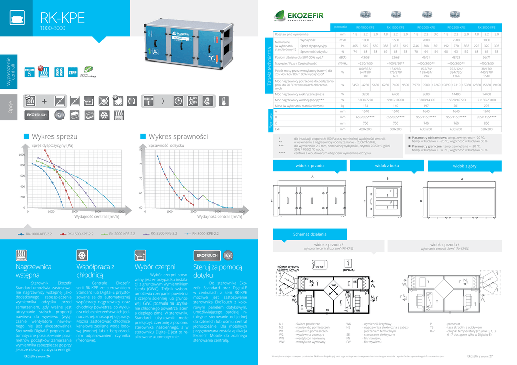 RK-KPE 1000-3000 Jednostka Wyposażenie centrali Tabela techniczna Rozstaw płyt wymiennika Wymiary: Opcje + Wykres sprężu Wykres sprawności Spręż dyspozycyjny [Pa] 1000 600 1.8 2.2 m3/h RK-1500-KPE 3.0 1.8 2.2 1000 RK-2000-KPE 3.0 1.8 2.2 1500 3.0 RK-2500-KPE 1.8 2.2 2000 RK-3000-KPE 3.0 1.8 2500 2.2 3.0 3000 Spręż dyspozycyjny Pa 465 510 550 388 457 519 246 308 361 192 270 338 226 320 398 Sprawność odzysku % 74 68 58 69 63 53 70 64 54 68 63 52 68 61 53 dB(A) 43/58 52/68 46/61 48/63 56/71 V/φ/Hz ~230/1/50 ~400/3/50** ~400/3/50** ~400/3/50** ~400/3/50 Pobór mocy przez wentylatory (razem) dla 20 / 40 / 60 / 80 / 100% wydajności* W 8,0/36,8/ 94/190/ 340 13,6/66/ 176/370/ 692 15,2/74/ 199/424/ 794 25,6/124/ 334/720/ 1364 38/176/ 440/870/ 1540 Moc nagrzewnicy potrzebna do podgrzania pow. do 20 0C w warunkach obliczeniowych W Napięcie / Faza / Częstotliwość 3450 4250 5630 6280 7490 9500 7970 9580 12260 10890 12310 16080 12860 15680 19100 Moc nagrzewnicy elektrycznej (max) W 3200 6400 9600 14400 14400 Moc nagrzewnicy wodnej (opcja)*** W 6300/7220 9910/10900 13380/14390 15620/16770 21180/23100 Masa (w wykonaniu standardowym) kg 134 140 197 201 207 A mm 1540 1540 1640 1640 1640 B mm 655/855**** 655/855**** 955/1155**** 955/1155**** 955/1155**** C mm 700 700 740 760 800 ExF mm 400x200 500x200 630x200 630x200 630x200 Parametry obliczeniowe: temp. zewnętrzna = -20 °C, temp. w budynku = +20 °C, wilgotność w budynku 50 % dla instalacji o oporach 150 Pa przy nominalnej wydajności centrali, w wykonaniu z nagrzewnicą wodną zasilanie ~ 230V/1/50Hz, dla wymiennika 2.2 mm, nominalnej wydajności, czynnik 70/50 °C glikol 35% / 70/50 °C woda, centrala z wbudowanym obejściem wymiennika odzysku. 75 800 mm Wydajność Poziom dźwięku dla 50/100% wyd.* * ** *** **** Sprawność odzysku 80 Nominalne (w wykonaniu standardowym) RK-1000-KPE widok z przodu A 70 Parametry graniczne: temp. zewnętrzna = -20 °C, temp. w budynku = +40 °C, wilgotność w budynku 55 % widok z boku A A B B widok z góry B A A A 400 F 65 E 200 C 0 C C C C C F E 60 0 1000 2000 3000 4000 0 1000 Wydajność centrali [m3/h] RK-1000-KPE-2.2 RK-1500-KPE-2.2 2000 3000 F E F E FB F E E 4000 RK-2500-KPE-2.2 RK-3000-KPE-2.2 Schemat działania widok z przodu / widok z przodu / wykonanie centrali ,,prawe” (RK-KPE) Współpraca z chłodnicą Sterownik Ekozefir Standard umożliwia zastosowanie nagrzewnicy wstępnej jako dodatkowego zabezpieczenia wymiennika odzysku przed zamarzaniem, gdy ważne jest utrzymanie stałych proporcji nawiewu do wywiewu (wyłączanie wentylatora nawiewnego nie jest akceptowalne). Sterownik Digital-E poprzez automatyczne poszukiwanie parametrów początków zamarzania wymiennika zabezpiecza go przy jeszcze niższym zużyciu energii. Centrale Ekozefir serii RK-KPE ze sterownikiem Standard lub Digital-E przystosowane są do automatycznej współpracy nagrzewnicy oraz chłodnicy powietrza, co wyklucza niebezpieczeństwo ich jednoczesnej, znoszącej się pracy. Można zastosować chłodnice kanałowe zasilane wodą lodową (wodne) lub z bezpośrednim odparowaniem czynnika (freonowe). Ekozefir / strona: 26 B Wydajność centrali [m3/h] RK-2000-KPE-2.2 Nagrzewnica wstępna B Wybór czerpni Wybór czerpni stosowany jest w przypadku instalacji z gruntowym wymiennikiem ciepła (GWC). Trójnik wyboru umożliwia czerpanie powietrza z czerpni ściennej lub gruntowej. GWC pozwala na uzyskanie chłodnego powietrza latem a ciepłego zimą. W sterowniku Standard użytkownik może przełączyć czerpnię z poziomu sterownika naściennego, a w sterowniku Digital-E jest to realizowane automatycznie. Steruj za pomocą dotyku Do sterownika Ekozefir Standard oraz Digital-E w centralach z serii RK-KPE możliwe jest zastosowanie sterownika EkoTouch z kolorowym panelem dotykowym, umożliwiającego bardziej intuicyjne sterowanie od jednej do czterech lub ośmiu central jednocześnie. Dla mobilnych przygotowana została aplikacja Ekozefir Mobile do zdalnego sterowania centralą. TRÓJNIK WYBORU CZERPNI (OPCJA) 5 1 FN 6 N1 7 PILOT (OPCJA) SE 1 FW NE P P N2 N1 W1 W1 0 WK W2 4 N2 W2 2 3 N1 N2 W1 W2 WN WW wykonanie centrali ,,lewe” (RK-KPEL) WW TS - świeże powietrze - nawiew do pomieszczeń - wywiew z pomieszczeń - wywiew na zewnątrz - wentylator nawiewny - wentylator wywiewny W WN WK NE SE FN FW - wymiennik krzyżowy - nagrzewnica elektryczna z zabezpieczeniem termicznym - sterowanie elektryczne - filtr nawiewu - filtr wywiewu P TS 0-7 W związku ze stałym rozwojem produktów, Ekoklimax-Projekt sp.j. zastrzega sobie prawo do wprowadzenia zmiany parametrów i wymiarów bez uprzedniego informowania o tym. - presostat - taca skroplin z odpływem - czujniki temperatury (czujniki 0, 1, 3, 6 i 7 dostępne tylko w Digitalu-E) Ekozefir / strona: 27