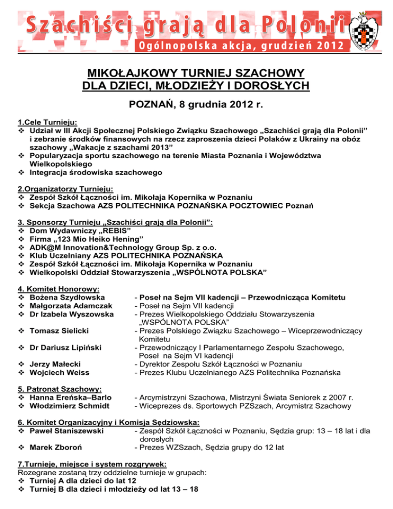 MIKOŁAJKOWY TURNIEJ SZACHOWY DLA DZIECI, MŁODZIEśY I DOROSŁYCH POZNAŃ, 8 grudnia 2012 r. 1.Cele Turnieju: Udział w III Akcji Społecznej Polskiego Związku Szachowego „Szachiści grają dla Polonii” i zebranie środków finansowych na rzecz zaproszenia dzieci Polaków z Ukrainy na obóz szachowy „Wakacje z szachami 2013” Popularyzacja sportu szachowego na terenie Miasta Poznania i Województwa Wielkopolskiego Integracja środowiska szachowego 2.Organizatorzy Turnieju: Zespół Szkół Łączności im. Mikołaja Kopernika w Poznaniu Sekcja Szachowa AZS POLITECHNIKA POZNAŃSKA POCZTOWIEC Poznań 3. Sponsorzy Turnieju „Szachiści grają dla Polonii”: Dom Wydawniczy „REBIS” Firma „123 Mio Heiko Hening” ADK@M Innovation&Technology Group Sp. z o.o. Klub Uczelniany AZS POLITECHNIKA POZNAŃSKA Zespół Szkół Łączności im. Mikołaja Kopernika w Poznaniu Wielkopolski Oddział Stowarzyszenia „WSPÓLNOTA POLSKA” 4. Komitet Honorowy: BoŜena Szydłowska Małgorzata Adamczak Dr Izabela Wyszowska Jerzy Małecki Wojciech Weiss - Poseł na Sejm VII kadencji – Przewodnicząca Komitetu - Poseł na Sejm VII kadencji - Prezes Wielkopolskiego Oddziału Stowarzyszenia „WSPÓLNOTA POLSKA” - Prezes Polskiego Związku Szachowego – Wiceprzewodniczący Komitetu - Przewodniczący I Parlamentarnego Zespołu Szachowego, Poseł na Sejm VI kadencji - Dyrektor Zespołu Szkół Łączności w Poznaniu - Prezes Klubu Uczelnianego AZS Politechnika Poznańska 5. Patronat Szachowy: Hanna Ereńska–Barlo Włodzimierz Schmidt - Arcymistrzyni Szachowa, Mistrzyni Świata Seniorek z 2007 r. - Wiceprezes ds. Sportowych PZSzach, Arcymistrz Szachowy Tomasz Sielicki Dr Dariusz Lipiński 6. Komitet Organizacyjny i Komisja Sędziowska: Paweł Staniszewski - Zespół Szkół Łączności w Poznaniu, Sędzia grup: 13 – 18 lat i dla dorosłych Marek Zboroń - Prezes WZSzach, Sędzia grupy do 12 lat 7.Turnieje, miejsce i system rozgrywek: Rozegrane zostaną trzy oddzielne turnieje w grupach: Turniej A dla dzieci do lat 12 Turniej B dla dzieci i młodzieŜy od lat 13 – 18 Turniej C - Otwarty dla Seniorów – UWAGA: ograniczona liczba miejsc – w Turnieju pierwszeństwo udziału mają Rodzice i Opiekunowie dzieci i młodzieŜy biorących udział w Turniejach A i B Miejsce rozgrywek: Zespół Szkół Łączności im. Mikołaja Kopernika w Poznaniu, ul. Przełajowa 4 Turnieje będą rozgrywane systemem szwajcarskim kontrolowanym na dystansie 7 rund z tempem gry po 15 minut na partię dla zawodnika Obowiązują przepisy gry Międzynarodowej Federacji Szachowej (FIDE) i Kodeksu Szachowego PZSzach z 2005 roku wraz z uzupełnieniami. 8.Termin: Godz. 9.00 - 9.45 Godz. 9.45 Godz. 10.15 Godz. 10.30 Ok. Godz. 14.30 SOBOTA 8 grudnia 2012 r. przyjmowanie potwierdzeń udziału w Turnieju, wpisowego oraz nowych zgłoszeń – tylko w przypadku wolnych miejsc zamknięcie listy zgłoszeń uroczyste otwarcie Turnieju rozpoczęcie rozgrywek ogłoszenie wyników i uroczyste zamknięcie Turnieju 9. Nagrody: Dla uczestników Turnieju przewidziane są nagrody rzeczowe Ilość nagród rzeczowych w kaŜdym z turniejów zostanie podana przez Organizatora w trakcie rozgrywek . 10. Zgłoszenia do udziału w Turnieju: Zgłoszenia TYLKO DROGĄ MAILOWĄ prosimy kierować na adres mailowy: [email protected] w terminie do 5 grudnia 2012 r. UWAGA: liczba miejsc w Turnieju ograniczona – o udziale moŜe decydować kolejność zgłoszeń W zgłoszeniu naleŜy podać: imię i nazwisko, tytuł szachowy lub kategorię szachową, aktualny ranking (FIDE / krajowy), przynaleŜność klubową, datę urodzenia (dotyczy juniorów) oraz wybrany turniej szachowy (Turniej A, B lub Turniej C). Dla ułatwienia kontaktu prosimy o podanie numeru telefonu i adresu E-mail. Uczestnicy zakwalifikowani do udziału w Turnieju otrzymają informację zwrotną drogą mailową. Wpisowe (płatne na sali gry - przed rozpoczęciem rozgrywek) do turniejów: 15 zł od uczestnika 11.Informacje dodatkowe: Finał III Akcji Społecznej „Szachiści grają dla Polonii” zorganizowany zostanie w Warszawie w I kwartale 2013 r. – udział w Finale wezmą najlepsi uczestnicy Turniejów Wojewódzkich w kategorii do 12 lat Organizator zapewnia sprzęt szachowy Prawo interpretacji niniejszego Komunikatu naleŜy do Organizatora Turnieju. Zawodnicy lub kluby pokrywają koszty ewentualnego indywidualnego ubezpieczenia zdrowotnego. Marek Zboroń Sędzia Turnieju