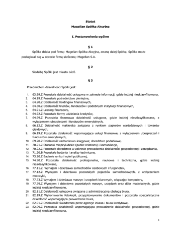 Statut Magellan Spółka Akcyjna I. Postanowienia ogólne §1 Spółka działa pod firmą: Magellan Spółka Akcyjna, zwaną dalej Spółką. Spółka może posługiwać się w obrocie firmą skróconą: Magellan S.A. §2 Siedzibą Spółki jest miasto Łódź. §3 Przedmiotem działalności Spółki jest: 1. 2. 3. 4. 5. 6. 7. 8. 9. 10. 11. 12. 13. 14. 15. 16. 17. 18. 19. 20. 21. 22. 23. 63.99.Z Pozostała działalność usługowa w zakresie informacji, gdzie indziej niesklasyfikowana, 64.19.Z Pozostałe pośrednictwo pieniężne, 64.20.Z Działalność holdingów finansowych, 64.30.Z Działalność trustów, funduszów i podobnych instytucji finansowych, 64.91.Z Leasing finansowy, 64.92.Z Pozostałe formy udzielania kredytów, 64.99.Z Pozostała finansowa działalność usługowa, gdzie indziej niesklasyfikowana, z wyłączeniem ubezpieczeń i funduszów emerytalnych, 66.12.Z Działalność maklerska związana z rynkiem papierów wartościowych i towarów giełdowych, 66.19.Z Pozostała działalność wspomagająca usługi finansowe, z wyłączeniem ubezpieczeń i funduszów emerytalnych, 69.20.Z Działalność rachunkowo-księgowa; doradztwo podatkowe, 70.21.Z Stosunki międzyludzkie (public relations) i komunikacja, 70.22.Z Pozostałe doradztwo w zakresie prowadzenia działalności gospodarczej i zarządzania, 71.20.B Pozostałe badania i analizy techniczne, 73.20.Z Badanie rynku i opinii publicznej, 74.90.Z Pozostała działalność profesjonalna, naukowa i techniczna, gdzie indziej niesklasyfikowana, 77.11.Z. Wynajem i dzierżawa samochodów osobowych i furgonetek, 77.12.Z Wynajem i dzierżawa pozostałych pojazdów samochodowych, z wyłączeniem motocykli, 77.33.Z Wynajem i dzierżawa maszyn i urządzeń biurowych, włączając komputery, 77.39.Z Wynajem i dzierżawa pozostałych maszyn, urządzeń oraz dóbr materialnych, gdzie indziej niesklasyfikowane, 82.11.Z Działalność usługowa związana z administracyjną obsługą biura, 82.19.Z Wykonywanie fotokopii, przygotowywanie dokumentów i pozostała specjalistyczna działalność wspomagająca prowadzenie biura, 82.91.Z Działalność świadczona przez agencje inkasa i biura kredytowe, 82.99.Z Pozostała działalność wspomagająca prowadzenie działalności gospodarczej, gdzie indziej niesklasyfikowana, 1 24. 25. 26. 27. 28. 29. 30. 31. 32. 33. 34. 35. 36. 37. 38. 39. 40. 41. 42. 43. 44. 45. 46. 47. 48. 49. 50. 51. 52. 53. 54. 55. 85.60.Z Działalność wspomagająca edukację, 96.09.Z Pozostała działalność usługowa, gdzie indziej niesklasyfikowana, 47.99.Z Pozostała sprzedaż detaliczna prowadzona poza siecią sklepową straganami i targowiskami, 46.69.Z Sprzedaż hurtowa pozostałych maszyn i urządzeń, 45.11.Z Sprzedaż hurtowa i detaliczna samochodów osobowych i furgonetek, 45.19 Z Sprzedaż hurtowa i detaliczna pozostałych pojazdów samochodowych z wyłączeniem motocykli, 46.14.Z Działalność agentów zajmujących się sprzedażą maszyn, urządzeń przemysłowych, statków i samolotów, 46.51.Z Sprzedaż hurtowa komputerów, urządzeń peryferyjnych i oprogramowania, 47.41.ZSprzedaż detaliczna komputerów, urządzeń peryferyjnych i oprogramowania prowadzona w wyspecjalizowanych sklepach, 42.99.Z Roboty związane z budową pozostałych obiektów inżynierii lądowej i wodnej, gdzie indziej niesklasyfikowane, 43.11.Z Rozbiórka i burzenie obiektów budowlanych, 43.12.Z Przygotowanie terenu pod budowę, 43.13.Z Wykonywanie wykopów i wierceń geologiczno-inżynierskich, 43.21.Z Wykonywanie instalacji elektrycznych, 43.22.Z Wykonywanie instalacji wodno-kanalizacyjnych, cieplnych, gazowych i klimatyzacyjnych, 43.29.Z Wykonywanie pozostałych instalacji budowlanych, 43.31.Z Tynkowanie, 43.32.Z Zakładanie stolarki budowlanej, 43.33.Z Posadzkarstwo; tapetowanie i oblicowywanie ścian, 43.34.Z Malowanie i szklenie, 43.39.Z Wykonywanie pozostałych robót budowlanych wykończeniowych, 43.91.Z Wykonywanie konstrukcji i pokryć dachowych, 43.99.Z Pozostałe specjalistyczne roboty budowlane, gdzie indziej niesklasyfikowane, 46.46.Z Sprzedaż hurtowa wyrobów farmaceutycznych i medycznych, 47.7 Sprzedaż detaliczna pozostałych wyrobów prowadzona w wyspecjalizowanych sklepach, 47.73.Z Sprzedaż detaliczna wyrobów farmaceutycznych prowadzona w wyspecjalizowanych sklepach, 47.74.Z Sprzedaż detaliczna wyrobów medycznych, włączając ortopedyczne, prowadzona w wyspecjalizowanych sklepach, 68.10.Z kupno i sprzedaż nieruchomości na własny rachunek, 68.20.Z wynajem i zarządzanie nieruchomościami własnymi lub dzierżawionymi, 68.31.Z pośrednictwo w obrocie nieruchomościami, 68.32.Z zarządzanie nieruchomościami wykonywane na zlecenie, 69.10.Z działalność prawnicza. §4 1. Spółka działa na obszarze Rzeczypospolitej Polskiej i za granicą. Spółka może zakładać i prowadzić delegatury, oddziały w kraju i za granicą, a także uczestniczyć w innych spółkach w kraju i za granicą 2. Spółka (tj. Magellan S.A.) i jej spółki zależne należą do bankowej grupy kapitałowej Banca Farmafactoring (Grupa BFF) i podlegają w ujęciu skonsolidowanym nadzorowi Banku Włoch. 3. W powyższej funkcji i w ramach polskiego prawa Banca Farmafactoring S.p.A., spółka dominująca Grupy BFF, ma prawo wywierać wpływ poprzez organy Spółki na działalność Spółki, tak aby zapewnić 2 realizację przez Spółkę poleceń Banku Włoch mających na celu utrzymanie stabilności Grupy BFF. Zarząd Spółki, w granicach określonych przez przepisy polskiego prawa, przekazuje Banca Farmafactoring S.p.A wszelkie niezbędne w tym celu dane i informacje lub zapewnia ich przekazanie przez spółki zależne. 4. Spółka zapewnia dostęp do wszelkich informacji lub dokumentów dotyczących Spółki i jej spółek zależnych, jakich upoważnieni przedstawiciele Banku Włoch zażądają w związku z kontrolą lub innymi czynnościami nadzorczymi, w ramach obowiązujących przepisów prawa. 5. Spółka może posiadać udziały d