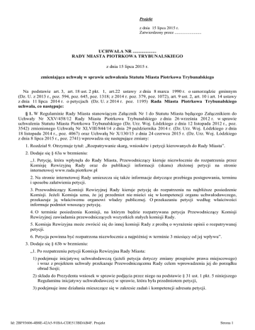 Projekt z dnia 15 lipca 2015 r. Zatwierdzony przez ......................... UCHWAŁA NR .................... RADY MIASTA PIOTRKOWA TRYBUNALSKIEGO z dnia 15 lipca 2015 r. zmieniająca uchwałę w sprawie uchwalenia Statutu Miasta Piotrkowa Trybunalskiego Na podstawie art. 3, art. 18 ust. 2 pkt. 1, art.22 ustawy z dnia 8 marca 1990 r. o samorządzie gminnym (Dz. U. z 2013 r., poz. 594, poz. 645, poz. 1318; z 2014 r. poz. 379, poz. 1072), art. 9 ust. 2, art. 10 i art. 14 ustawy z dnia 11 lipca 2014 r. o petycjach (Dz. U. z 2014 r. poz. 1195) Rada Miasta Piotrkowa Trybunalskiego uchwala, co następuje: § 1. W Regulaminie Rady Miasta stanowiącym Załącznik Nr 1 do Statutu Miasta będącego Załącznikiem do Uchwały Nr XXV/458/12 Rady Miasta Piotrkowa Trybunalskiego z dnia 26 września 2012 r. w sprawie uchwalenia Statutu Miasta Piotrkowa Trybunalskiego (Dz. Urz. Woj. Łódzkiego z dnia 12 listopada 2012 r., poz. 3542) zmienionego Uchwałą Nr XLVIII/844/14 z dnia 29 października 2014 r. (Dz. Urz. Woj. Łódzkiego z dnia 18 listopada 2014 r., poz. 4067) oraz Uchwałą Nr X/130/15 z dnia 24 czerwca 2015 r. (Dz. Urz. Woj. Łódzkiego z dnia 8 lipca 2015 r., poz. 2741) wprowadza się następujące zmiany: 1. Rozdział 9. Otrzymuje tytuł: „Rozpatrywanie skarg, wniosków i petycji kierowanych do Rady Miasta”. 2. Dodaje się § 63a w brzmieniu: „1. Petycję, która wpłynęła do Rady Miasta, Przewodniczący kieruje niezwłocznie do rozpatrzenia przez Komisję Rewizyjną Rady oraz do publikacji informacji (skanu) złożonej petycji na stronie internetowej www.rada.piotrkow.pl 2. Na stronie internetowej Rady umieszcza się także informacje dotyczące przebiegu postępowania, terminu i sposobu załatwienia petycji. 3. Przewodniczący Komisji Rewizyjnej Rady kieruje petycję do rozpatrzenia na najbliższe posiedzenie Komisji. Jeżeli Komisja uzna, że jej przedmiot nie mieści się w kompetencji organu uchwałodawczego, przekazuje ją właściwemu organowi władzy publicznej. O przekazaniu petycji według właściwości informuje podmiot wnoszący petycję. 4. O terminie posiedzenia Komisji, na którym będzie rozpatrywana petycja Przewodniczący Komisji Rewizyjnej zawiadamia przewodniczących wszystkich stałych komisji Rady. 5. Komisja Rewizyjna może zwrócić się do innej komisji Rady z prośbą o wyrażenie opinii o rozpatrywanej petycji. 6. Petycja powinna być rozpatrzona niezwłocznie a najpóźniej w terminie 3 miesięcy od jej wpływu”. 3. Dodaje się § 63b w brzmieniu: „1. Po rozpatrzeniu petycji Komisja Rewizyjna Rady Miasta: 1) podejmuje inicjatywę uchwałodawczą (jeżeli petycja dotyczy zmiany przepisów prawa miejscowego) i wraz z projektem uchwały przekazuje Przewodniczącemu Rady celem wprowadzenia jej do porządku obrad Sesji; 2) składa do Prezydenta wniosek w sprawie podjęcia przez niego na podstawie § 31 ust. 1 pkt. 5 niniejszego Regulaminu inicjatywy uchwałodawczej w sprawie, która była przedmiotem petycji, 3) podejmuje inne działania mieszczące się w zakresie zadań i kompetencji adresata petycji. Id: 2BF93606-4B8E-42A5-91BA-CDE513BDAB4F. Projekt Strona 1 2. Komisja Rewizyjna zawiadamia podmiot wnoszący petycję o sposobie jej załatwienia wraz z uzasadnieniem w formie pisemnej lub za pomocą środków komunikacji elektronicznej”. 4. Dodaje się § 63c w brzmieniu: „Raz w roku do 30 czerwca na stronie internetowej Rady zamieszcza się zbiorczą informacje o petycjach, które zostały rozpatrzone przez Komisję Rewizyjną w roku poprzednim”. 5. Dodaje się § 63d w brzmieniu: „1. Petycje, które nie zostały rozpatrzone przed upływem kadencji Rady, podlegają rozpatrzeniu przez Komisję Rewizyjną Rady następnej kadencji, zgodnie z przepisami § 63a-63b. 2. Komisja Rewizyjna podejmuje także decyzję co do inicjatywy uchwałodawczej, o której mowa w § 63b ust.1 pkt. 1 lub co do wniosku, o którym mowa w § 63b ust. 1 pkt. 2 jeżeli w ubiegłej kadencji Rady postępowanie w sprawie tej inicjatywy nie zostało zakończone”. § 2. W Regulaminie Komisji Rewizyjnej stanowiącym Załącznik Nr 2 do Statutu Miasta w § 6 ust. 1 dodaje się ppkt. 4 w brzmieniu: „4) rozpatrywanie petycji, których adresatem jest Rada Miasta”. § 3. Wykonanie uchwały powierza się Prezydentowi Miasta. § 4. Uchwała wchodzi w życie po upływie 14 dni od dnia ogłoszenia w Dzienniku Urzędowym Województwa Łódzkiego nie wcześniej niż dnia 6 września 2015 r. Id: 2BF93606-4B8E-42A5-91BA-CDE513BDAB4F. Projekt Strona 2 Uzasadnienie W dniu 6 września bieżącego roku wchodzi w życie ustawa z dnia 11 lipca 2014 r. o petycjach (Dz. U. z 2014 r., poz. 1195). Rodzi to konieczność uregulowania kwestii rozpatrywania petycji w Statucie Miasta Piotrkowa Trybunalskiego, przy czym „rozpatrywanie” na gruncie ustawy o petycjach należy rozumieć jako podejmowanie określonych czynności proceduralnych (postępowanie wyjaśniające) oraz władczych dotyczących rozstrzygnięcia co do dalszych skutków żądań zawartych w petycji np. podjęcie inicjatywy uchwałodawczej itp. Na podstawie art. 9 ust. 2 tej ustawy rada ma możliwość wskazania organu wewnętrznego (komisji), który będzie rozpatrywał petycje, adresatem których jest Rada Miasta. Niniejszy projekt uchwały proponuje dokonanie zmian w Regulaminie Rady Miasta stanowiącym Załącznik Nr 1 do Statutu Miasta poprzez zmianę tytułu Rozdziału 9 oraz uszczegółowienie zasad rozpatrywania petycji przez Komisję Rewizyjną Rady Miasta (dodane § od 63a do 63d) oraz dopisanie w § 6 ust. 1 Regulaminu Komisji Rewizyjnej stanowiącego Załącznik Nr 2 do Statutu „ppkt. 4) rozpatrywanie petycji, których adresatem jest Rada Miasta”. Id: 2BF93606-4B8E-42A5-91BA-CDE513BDAB4F. Projekt Strona 1