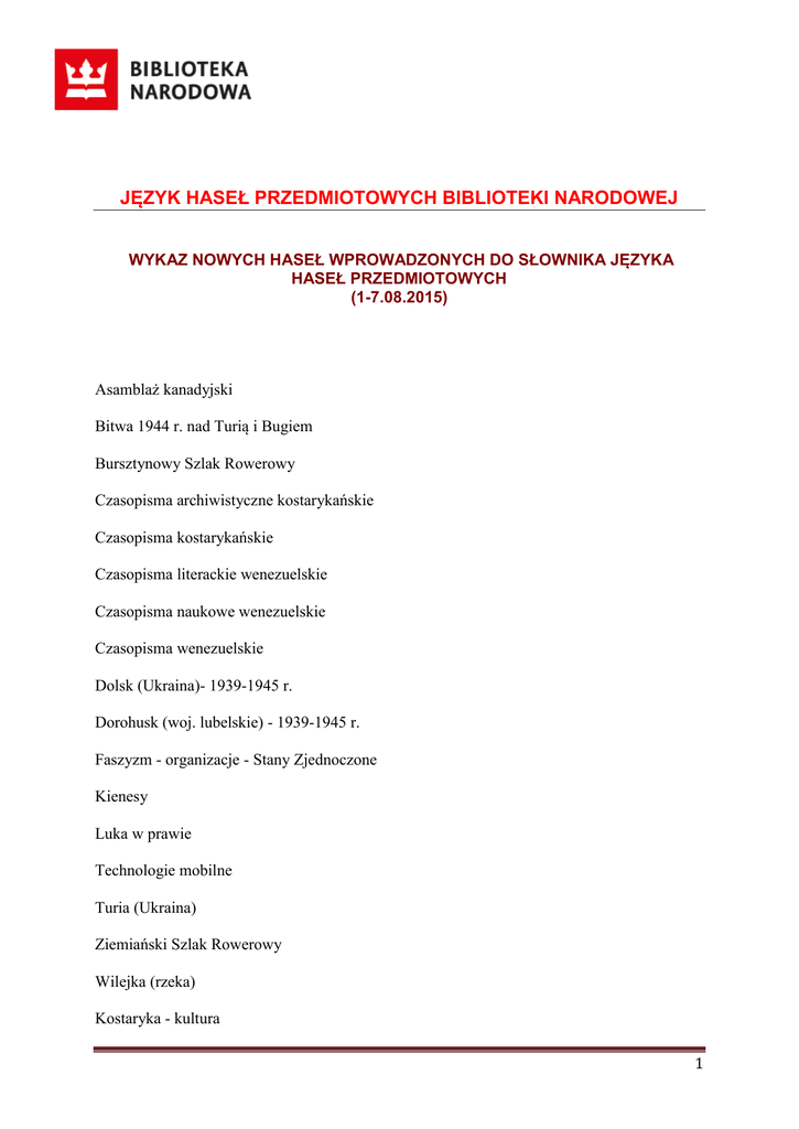 JĘZYK HASEŁ PRZEDMIOTOWYCH BIBLIOTEKI NARODOWEJ WYKAZ NOWYCH HASEŁ WPROWADZONYCH DO SŁOWNIKA JĘZYKA HASEŁ PRZEDMIOTOWYCH (1-7.08.2015) Asamblaż kanadyjski Bitwa 1944 r. nad Turią i Bugiem Bursztynowy Szlak Rowerowy Czasopisma archiwistyczne kostarykańskie Czasopisma kostarykańskie Czasopisma literackie wenezuelskie Czasopisma naukowe wenezuelskie Czasopisma wenezuelskie Dolsk (Ukraina)- 1939-1945 r. Dorohusk (woj. lubelskie) - 1939-1945 r. Faszyzm - organizacje - Stany Zjednoczone Kienesy Luka w prawie Technologie mobilne Turia (Ukraina) Ziemiański Szlak Rowerowy Wilejka (rzeka) Kostaryka - kultura 1 Mapy krajobrazowe Niemcy – organizacje - Stany Zjednoczone - 1939-1945 r. Organizacje polonijne – Austria - 21 w. Pisarze marokańscy Regionalne Nagrody Jakości Rachowiec 2