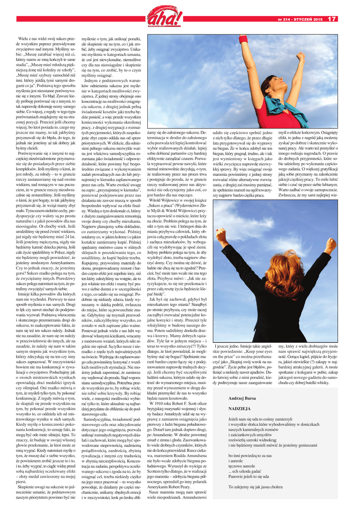 nr 214 - STYCZEŃ 2015 Wielu z nas widzi swój sukces przede wszystkim poprzez przewidywane zwycięstwo nad innymi. Myślimy sobie: „Muszę zarabiać więcej niż ci, którzy razem ze mną kończyli te same studia”, „Muszę mieć młodszą piękniejszą żonę niż koledzy ze szkoły”, „Muszę mieć szybszy samochód niż inni, którzy jeżdżą tymi samymi drogami co ja”. Podstawą tego sposobu myślenia jest nieustanne porównywanie się z innymi. To błąd. Zawsze kiedy próbuję porównać się z innymi, to tak naprawdę dokonuję oceny samego siebie. Co więcej, z reguły w tego typu porównaniach znajdujemy się na straconej pozycji. Przecież jeśli chcemy więcej, bo ktoś posiada to, czego my jeszcze nie mamy, to tak jakbyśmy przyznawali się do błędu, do tego, że jednak nie jesteśmy aż tak dobrzy jak byśmy chcieli. Porównywanie się z innymi to najczęściej nieuświadomione przyznawanie się do posiadanych przez siebie kompleksów. Jeśli myślimy o kimś, że jest młody, za młody – to w gruncie rzeczy zastanawiamy się nad swoim wiekiem, nad rosnącym w nas poczuciem, że w gruncie rzeczy nieodwracalnie się zestarzeliśmy. Jeśli myślimy o kimś, że jest bogaty, to tak jakbyśmy przyznawali się, że wciąż mamy zbyt mało. Tymczasem niektóre cechy, predyspozycje czy walory są po prostu naturalne i z jakiś powodów dla nas nieosiągalne. Ot choćby wiek. Jeśli urodziliśmy się przed ćwierć wiekiem, już nigdy nie będziemy mieć 24 lat. Jeśli jesteśmy mężczyzną, nigdy nie będziemy karmić dziecka piersią. Jeśli całe życie spędziliśmy w Polsce, nigdy nie będziemy mogli powiedzieć, że jesteśmy urodzonym Amerykaninem. Czy to jednak znaczy, że jesteśmy gorsi? Sukces rzadko polega na tym, że zwyciężamy innych. Prawdziwy sukces polega natomiast na tym, że potrafimy zwyciężyć samych siebie. Istnieje kilka powodów dla których nam nie wychodzi. Pierwszy to nasz sposób myślenia o nas samych. Drugi to lęk czy nawet niechęć do podejmowania wyzwań. Podstawą wkroczenia i skutecznego przemierzania drogi do sukcesu, to zaakceptowanie faktu, że nam się też ten sukces należy. Jednak nie na zasadzie, że nam się on należy w przeciwieństwie do innych, ale na zasadzie, że należy się nam w takim samym stopniu jak wszystkim tym, którzy zdecydują się na ten czy inny sukces zapracować. W rzeczywistości bowiem nie ma konkurencji w rywalizacji o zwycięstwo. Posłuchajmy jak o swoich mistrzowskich wynikach opowiadają złoci medaliści igrzysk czy olimpiad. Oni rzadko mówią o tym, że myśleli tylko tym, by pokonać konkurencję. Z reguły mówią o tym, że skupiali się przede wszystkim na tym, by pokonać przede wszystkim wszystko to, co oddziela ich od mistrzowskiego wyniku w nich samych. Kiedy myślę o konieczności pokonania konkurencji, to uznaję fakt, że mogą być ode mnie silniejsi, lepsi. To znaczy, że buduję w swojej własnej głowie przekonanie, że ktoś może ze mną wygrać. Kiedy natomiast myślę o tym, że muszę dać z siebie wszystko, że powinienem zrobić jeszcze to i to, i to, żeby wygrać, to ciągle widzę przed sobą najbardziej oczekiwany efekt – złoty medal zawieszony na mojej piersi. Skupienie uwagi na sukcesie to jednocześnie uznanie, że podstawowym naszym priorytetem powinno być nie myślenie o tym, jak uniknąć porażki, ale skupienie się na tym, co i jak zrobić, żeby osiągnąć zwycięstwo. Unikanie myślenia w kategoriach uznania, że coś jest niewykonalne, niemożliwe czy dla nas nieosiągalne i skupienie się na tym, co zrobić, by to o czym myślimy osiągnąć. Jednym z podstawowych warunków odniesienia sukcesu jest myślenie w kategoriach możliwości zwycięstwa. Z jednej strony obejmuje ono koncentrację na możliwości osiągnięcia sukcesu, z drugiej jednak pełną świadomość kosztów jaki trzeba będzie ponieść, a więc przede wszystkim konieczności wykonania określonej pracy, z drugiej rezygnacji z rozmaitych przyjemności, których zaspokojenie zbyt często oddala nas od spraw priorytetowych. W efekcie, dla odniesieni pełnego sukcesu niezwykle ważna jest właściwa samodyscyplina rozumiana jako świadomość i odpowiedzialność, które powinny być bezpośrednio związane z wykonywaniem zadań prowadzących nas do lub przynajmniej w kierunku zaplanowanego przez nas celu. Warto zwrócić uwagę na zapis: „przynajmniej w kierunku”, ponieważ podejmowane przez nas działania nie zawsze muszą w sposób bezpośredni wpływać na efekt finalny. Wiedzą o tym doskonale ci, którzy z dużym zaangażowaniem remontują swoje domy czy choćby mieszkania. Najpierw planujemy sobie dokładnie, co zamierzamy wykonać. Później ustalamy co, w jakim kolorze i o jakim kształcie zamierzamy kupić. Później spędzamy mnóstwo czasu w różnych sklepach w poszukiwaniu tego, co ustaliliśmy, że kupić będzie trzeba. Kupujemy, przywozimy materiały do domu, przeprowadzamy remont i bardzo często efekt jest zupełnie inny, niż ten który założyliśmy na wstępie, ale to jest właśnie ten efekt i mamy być prawo z siebie dumni a w szczególności z tego, co udało się na osiągnąć. Podobnie się niekiedy zdarza, kiedy wyruszamy w daleką podróż, zwłaszcza do miejsc, które są powszechnie znane. Gdybyśmy się trzymali przewodników, zaliczylibyśmy wszystko, co zostało w nich zapisane jako ważne. Ponieważ jednak wielu z nas lubi wędrować własnymi ścieżkami, wracamy z mnóstwem wrażeń, których nikt nigdzie nie opisał. Są tylko nasze i nierzadko z rzędu tych najważniejszych na świecie. Wędrując do zaplanowanego celu powinniśmy korzystać z wszelkich możliwych stymulacji. Nie możemy jednak zapominać, że zamierzamy wędrować do przodu. Stąd wspomniana samodyscyplina. Potrzebna przede wszystkim po to, by robiąc wiele, nie robić sobie krzywdy. By robiąc wiele, z mnogości możliwości wybierać tylko te, które aktualnie są 
